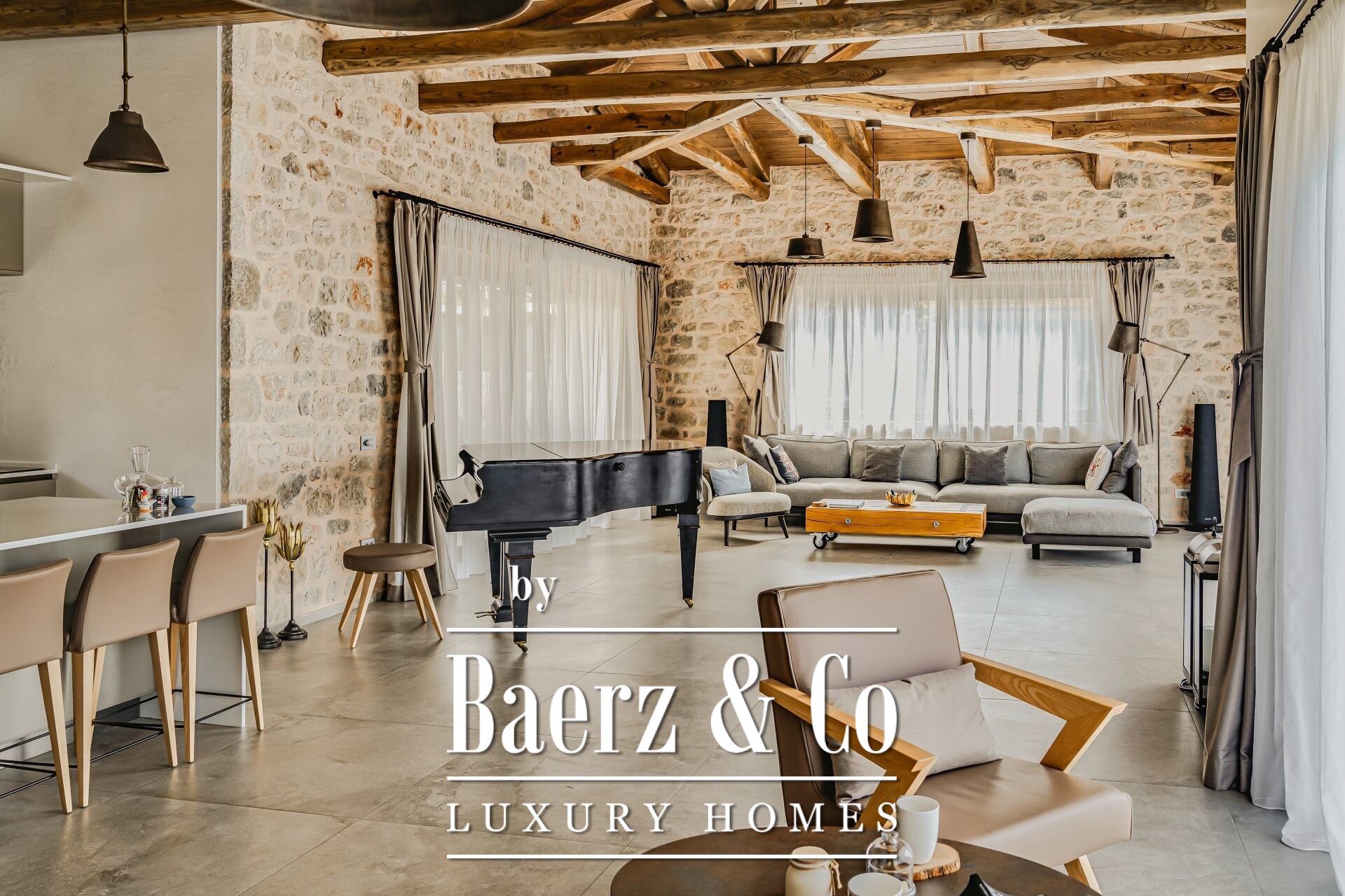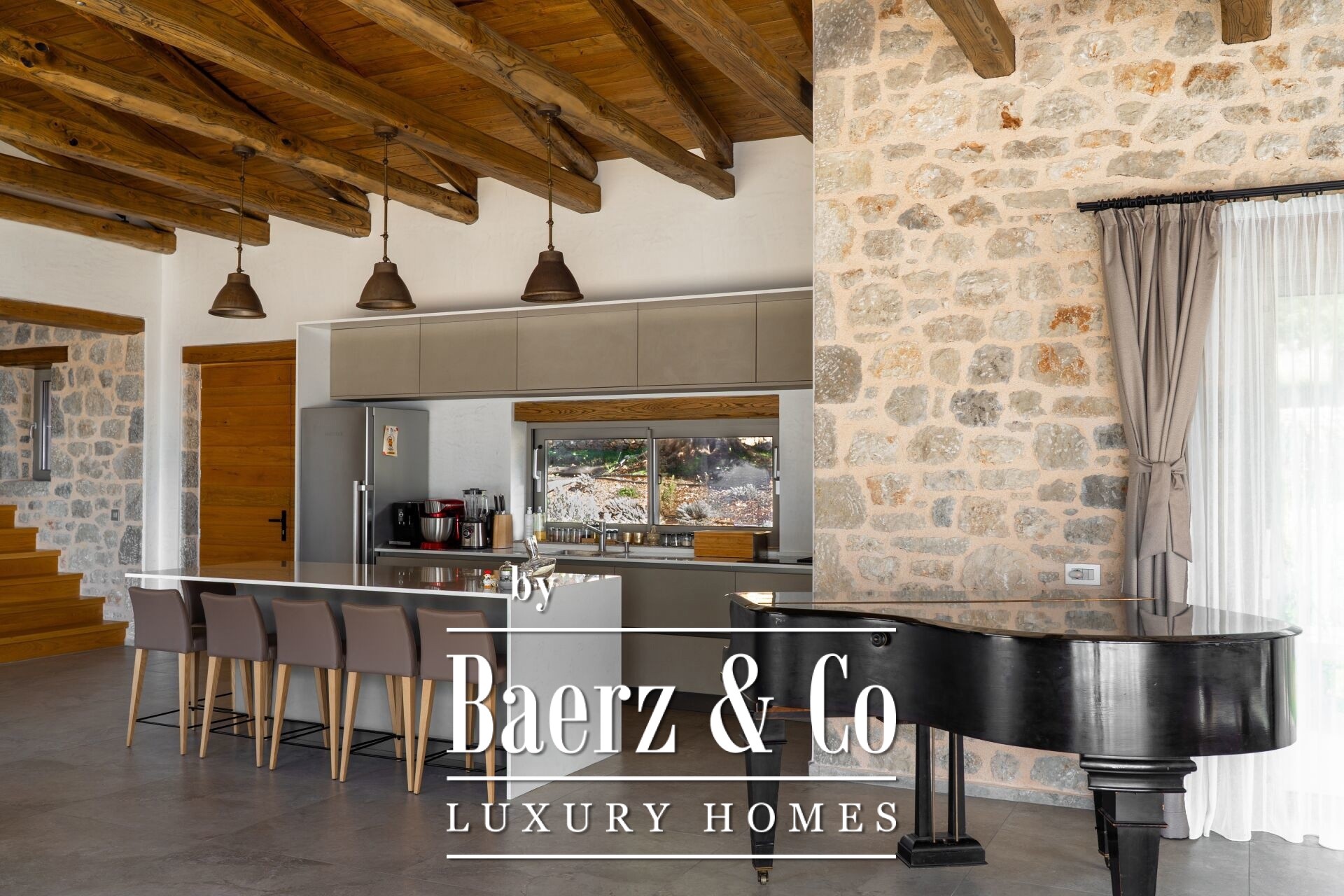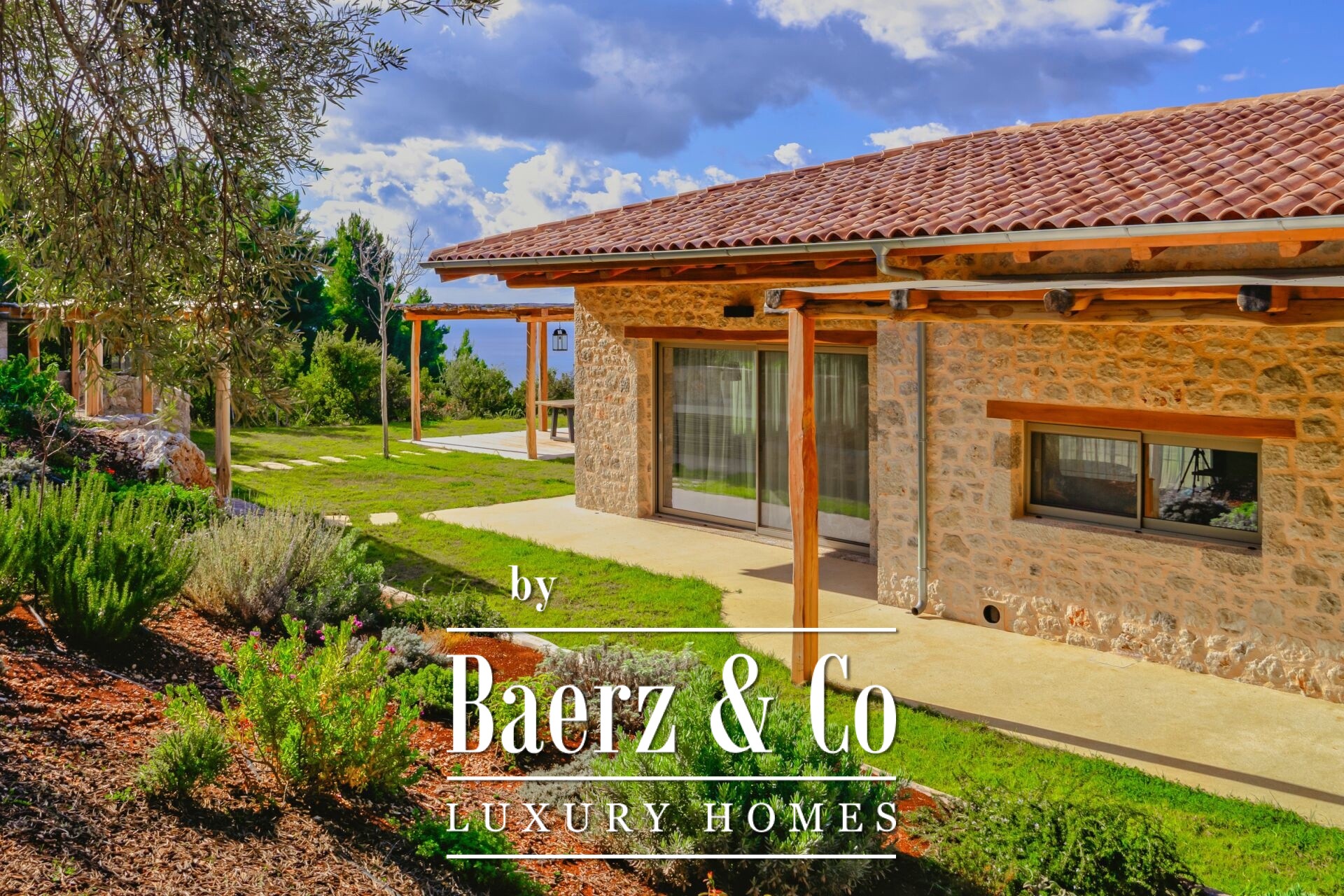 This luxury villa Lefkada stands just 300 meters from the Ionian Sea, capturing the rhythm of island life within a tranquil 5,333 m² plot. Designed across three considered levels and spanning 360 m², the property unfolds with a sense of timeless solidity, built in stone and anchored to its hillside setting. The ground and first floors comprise four master bedrooms, four bathrooms, a guest WC, an expansive living space lined by a fireplace, and a modern kitchen appointed with high-quality appliances. Below, an 88 m² basement offers scope for a wine cellar, gym, or cinema, responding to individual lifestyle needs.