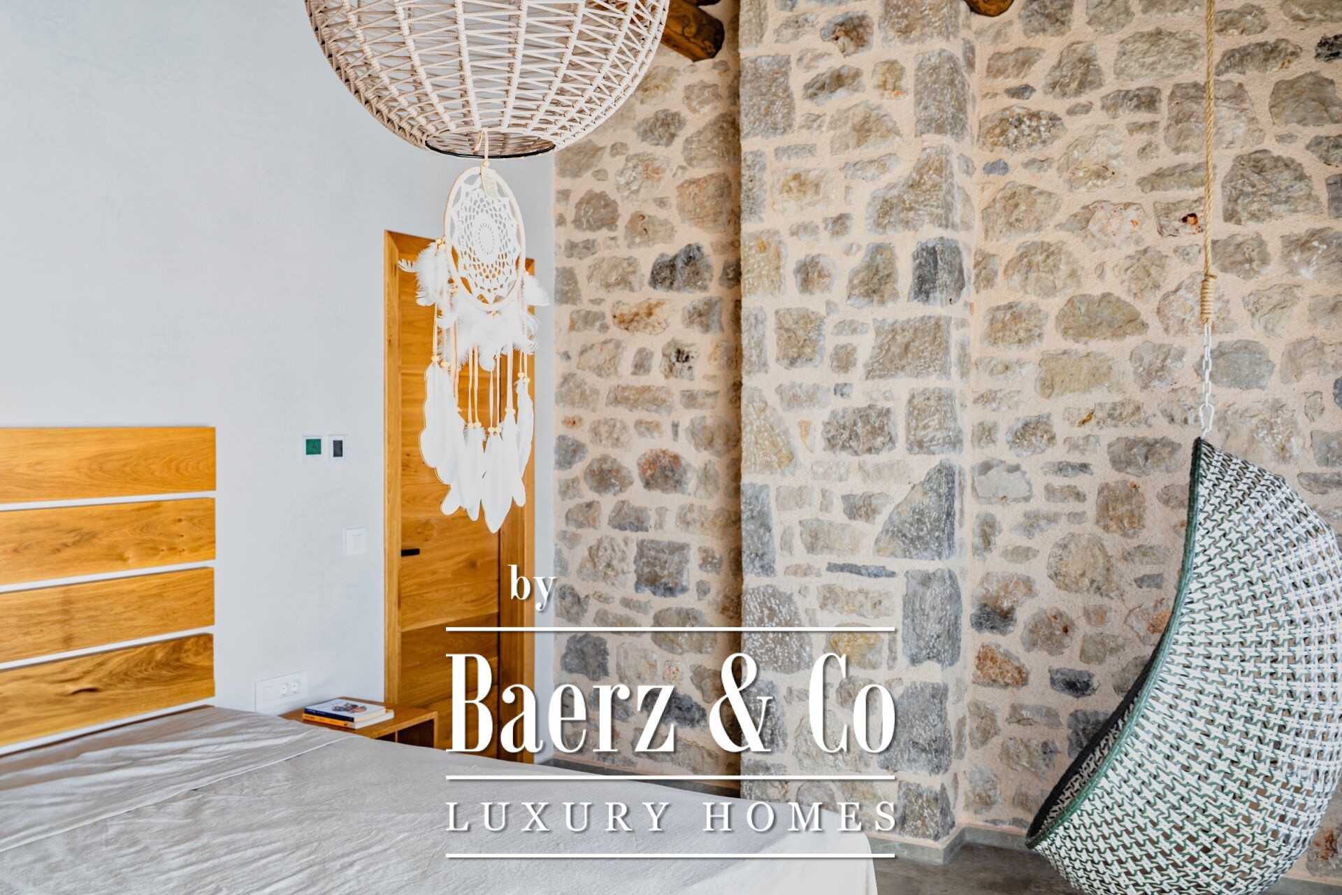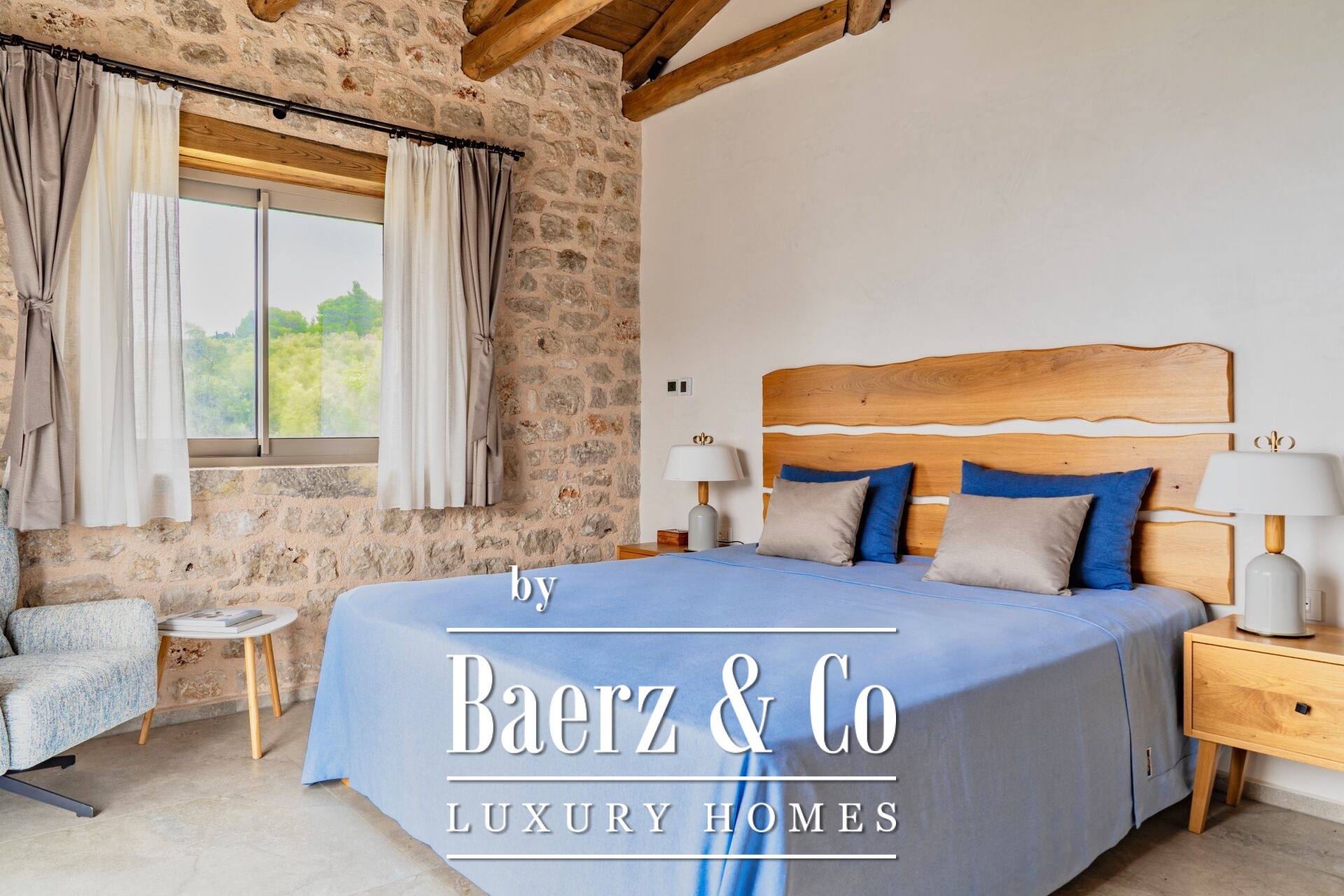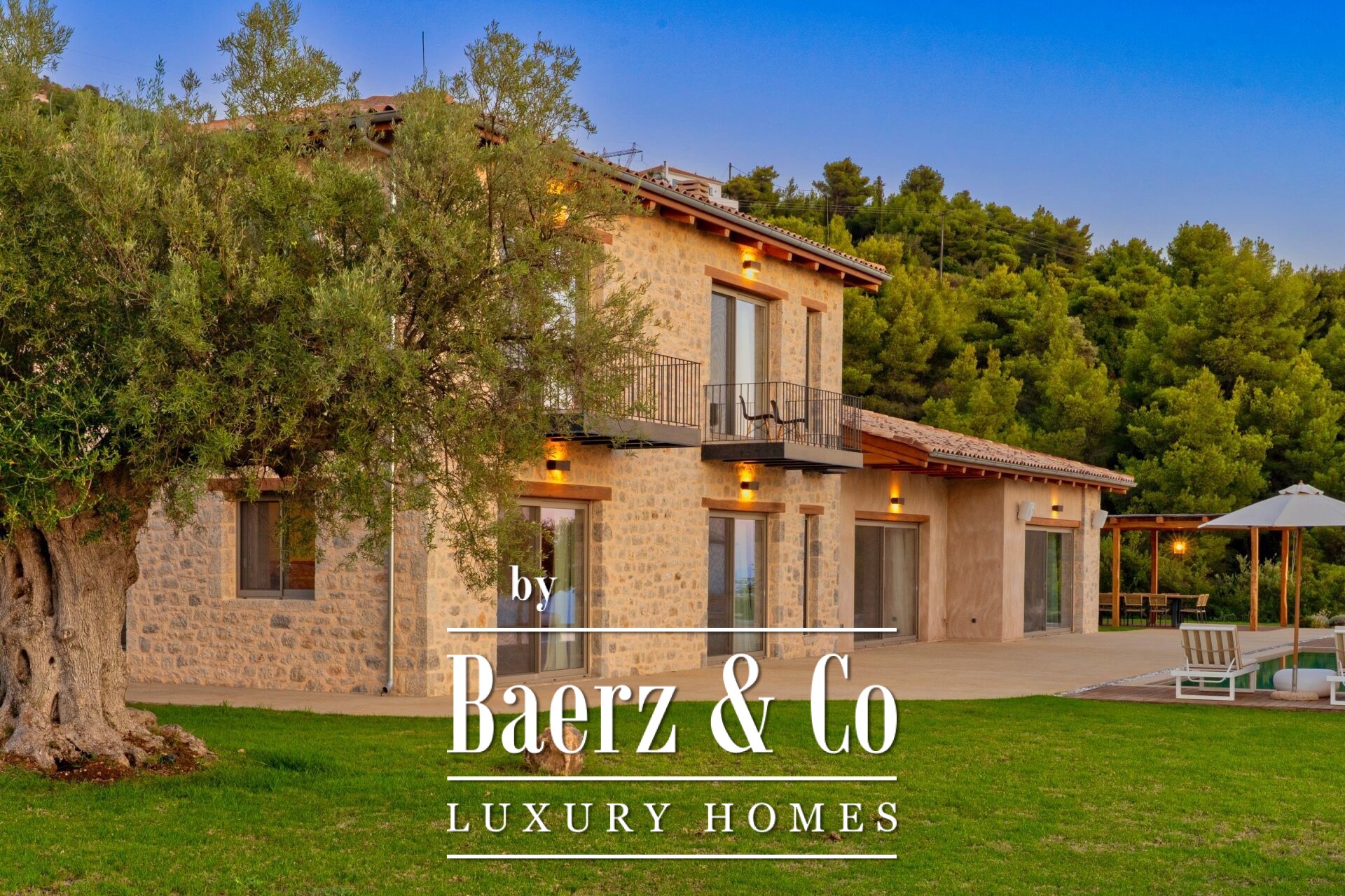 This luxury villa Lefkada stands just 300 meters from the Ionian Sea, capturing the rhythm of island life within a tranquil 5,333 m² plot. Designed across three considered levels and spanning 360 m², the property unfolds with a sense of timeless solidity, built in stone and anchored to its hillside setting. The ground and first floors comprise four master bedrooms, four bathrooms, a guest WC, an expansive living space lined by a fireplace, and a modern kitchen appointed with high-quality appliances. Below, an 88 m² basement offers scope for a wine cellar, gym, or cinema, responding to individual lifestyle needs.