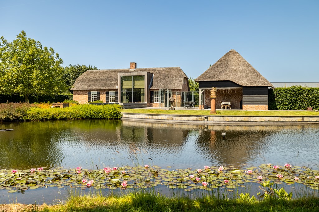 De garage die middels een glazen doorgang met het woonhuis is verbonden is net zoals het hoofdverblijf voorzien van een rieten dak. De dubbele garage heeft elektrisch bedienbare segmentdeuren en biedt plaats aan twee auto’s.