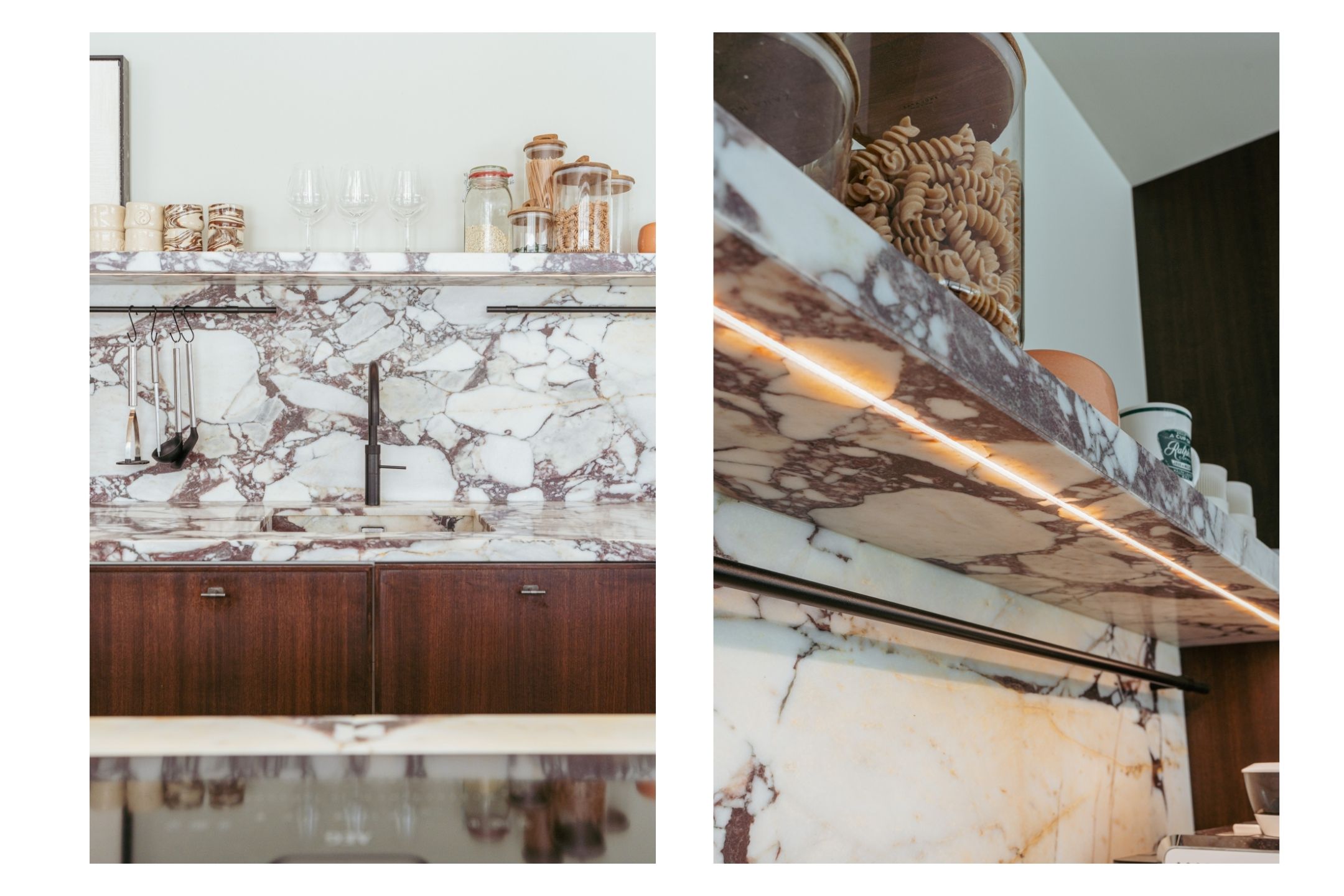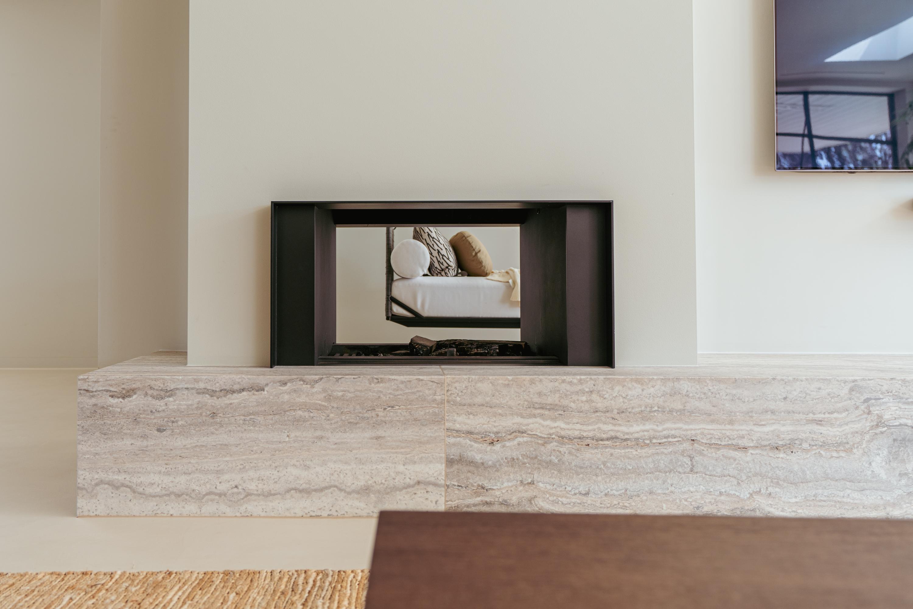The expansive living room, featuring floor-to-ceiling windows and a stunning round bay window, is bathed in natural light, instantly creating a sense of space and tranquillity. The elegant fireplace forms a central feature of the open-plan living area, which flows seamlessly into the luxurious kitchen. The kitchen is equipped with high-end built-in appliances and modern conveniences, including a generous island of approx. 5 metres, Quooker tap, dishwasher, fridge/freezer combination, and an induction hob with integrated extractor. The exclusive book-matched marble worktop extends into the sink, giving the kitchen a refined and sophisticated finish. French steel doors open onto the delightful covered terrace and beautifully landscaped garden. Adjoining the kitchen is the spacious dining room.