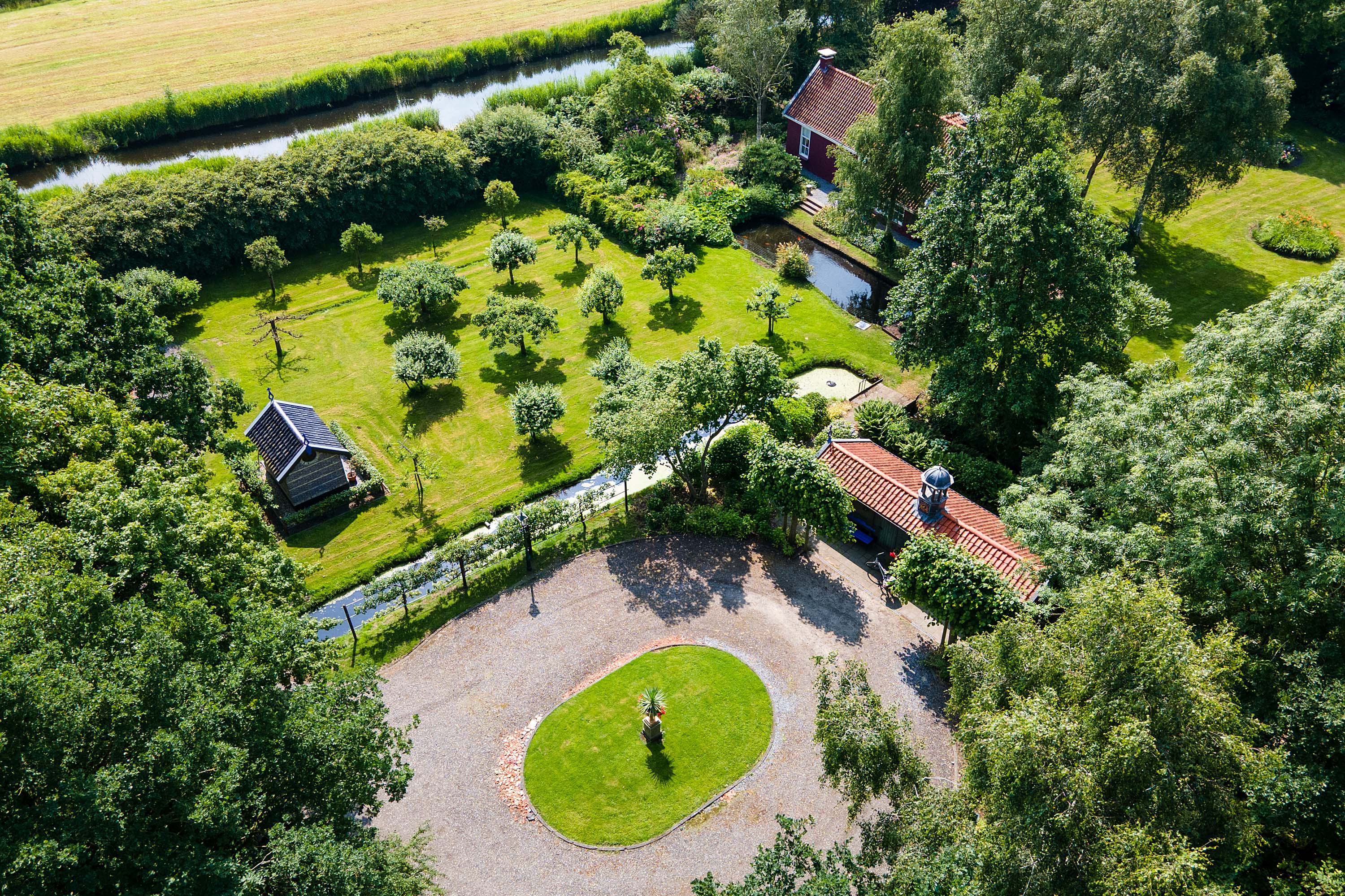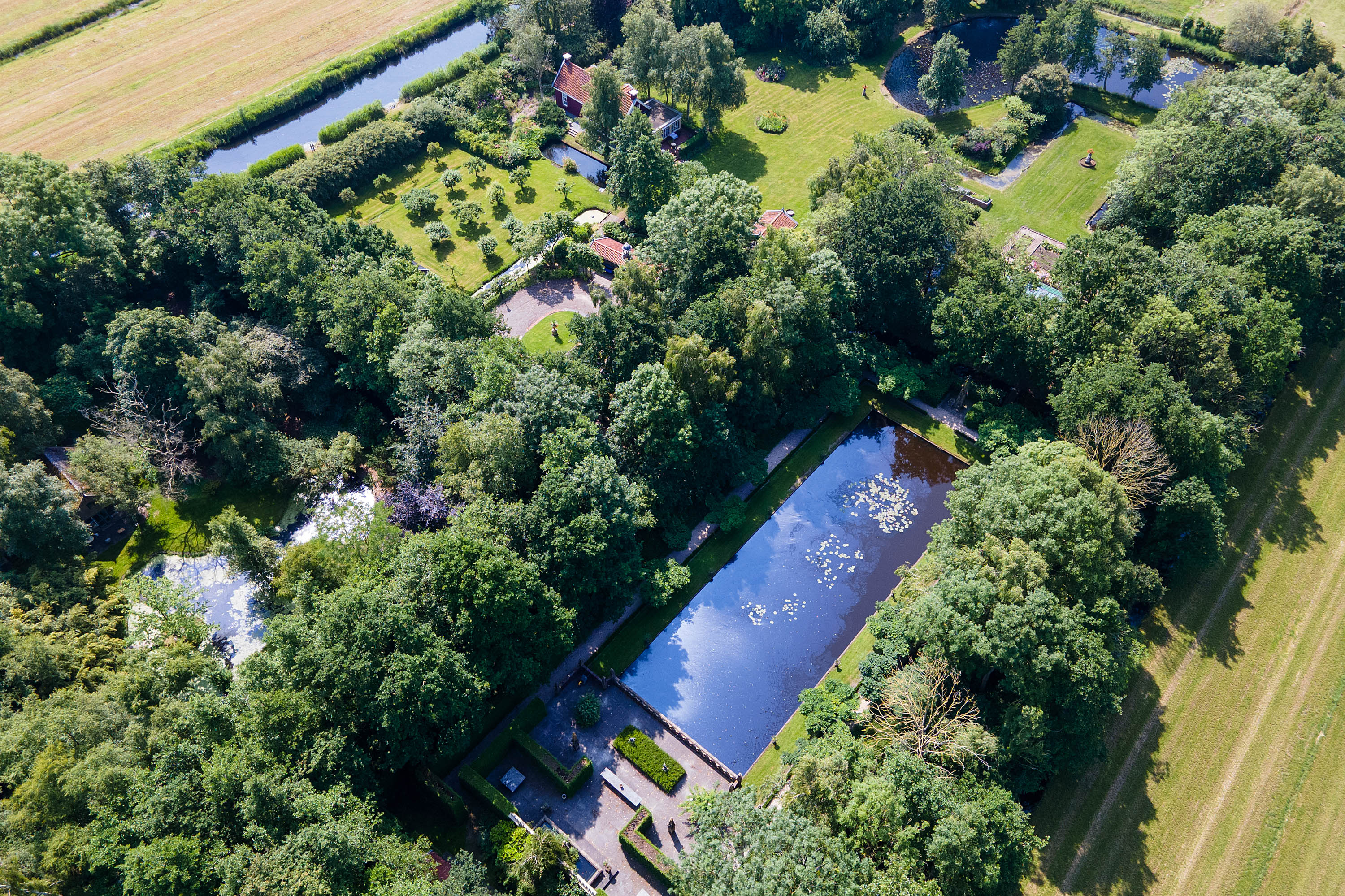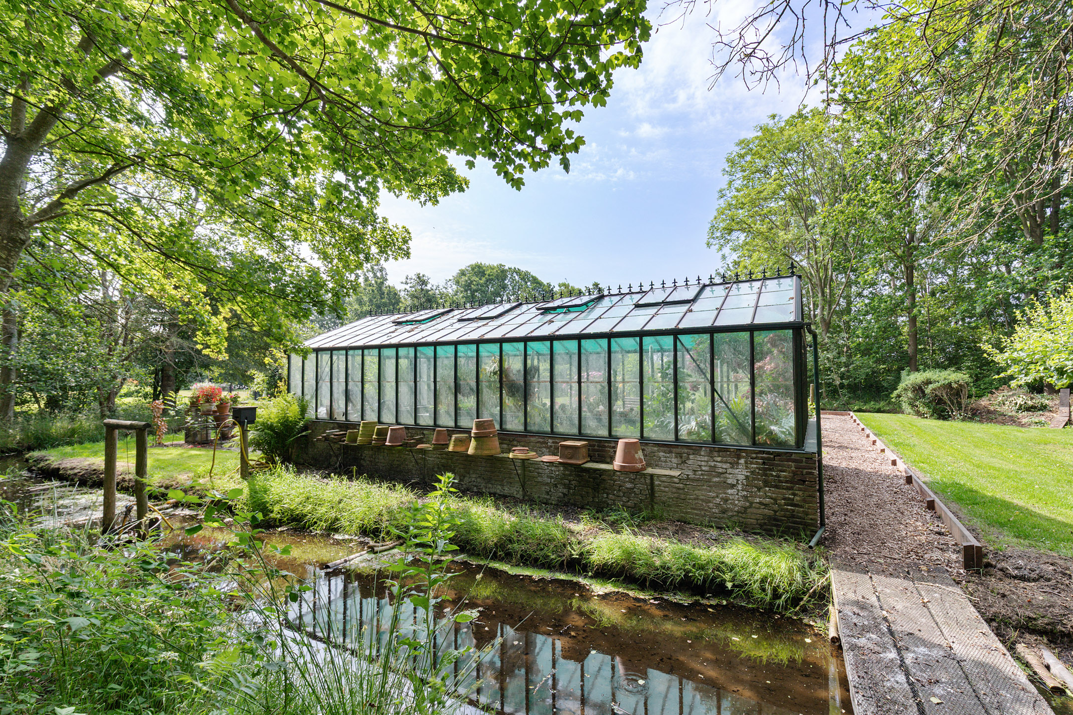 What began as a plot of approximately 1,600 m² has grown into a remarkable estate of approximately 3.18 hectares. The gardens were carefully designed to combine formal and natural elements, including two (swimming) ponds, multiple terraces, garden houses, a conservatory with vegetable garden, wooded areas, and expansive lawns.