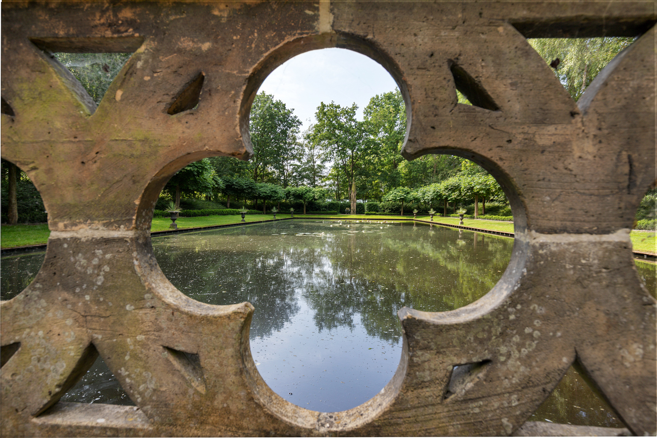The formal pond is framed with historic elements from the Dominicus Church on Spuistraat in Amsterdam. The water features are supplied by the adjacent canal, creating a vibrant and natural ecosystem.