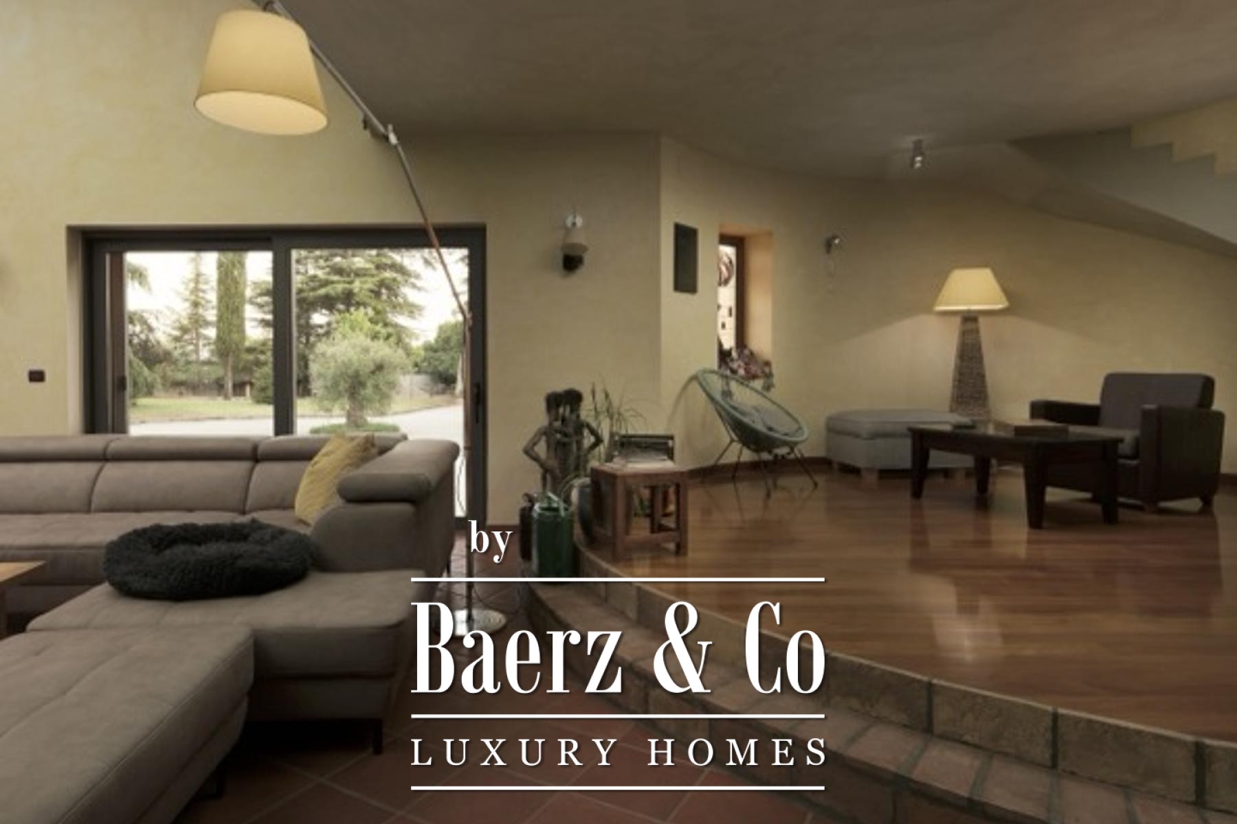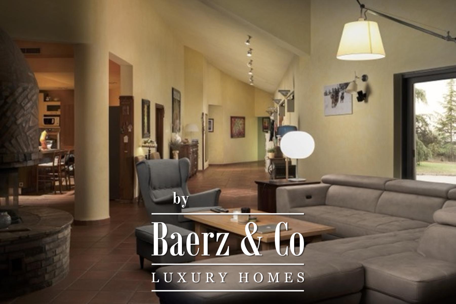 Inside, the 350 m² of living space is meticulously arranged for both comfort and quiet luxury. Five bedrooms provide flexibility for family and guests, with a master suite that includes a private bathroom, walk-in closet, and sauna. The main living area is anchored by a fireplace and flows toward a terrace overlooking the garden. Modern conveniences include a smart home system, fully equipped kitchen, and photo-solar panels delivering 11 kW of energy efficiency. A spacious storage room and five bathrooms further enhance everyday ease.