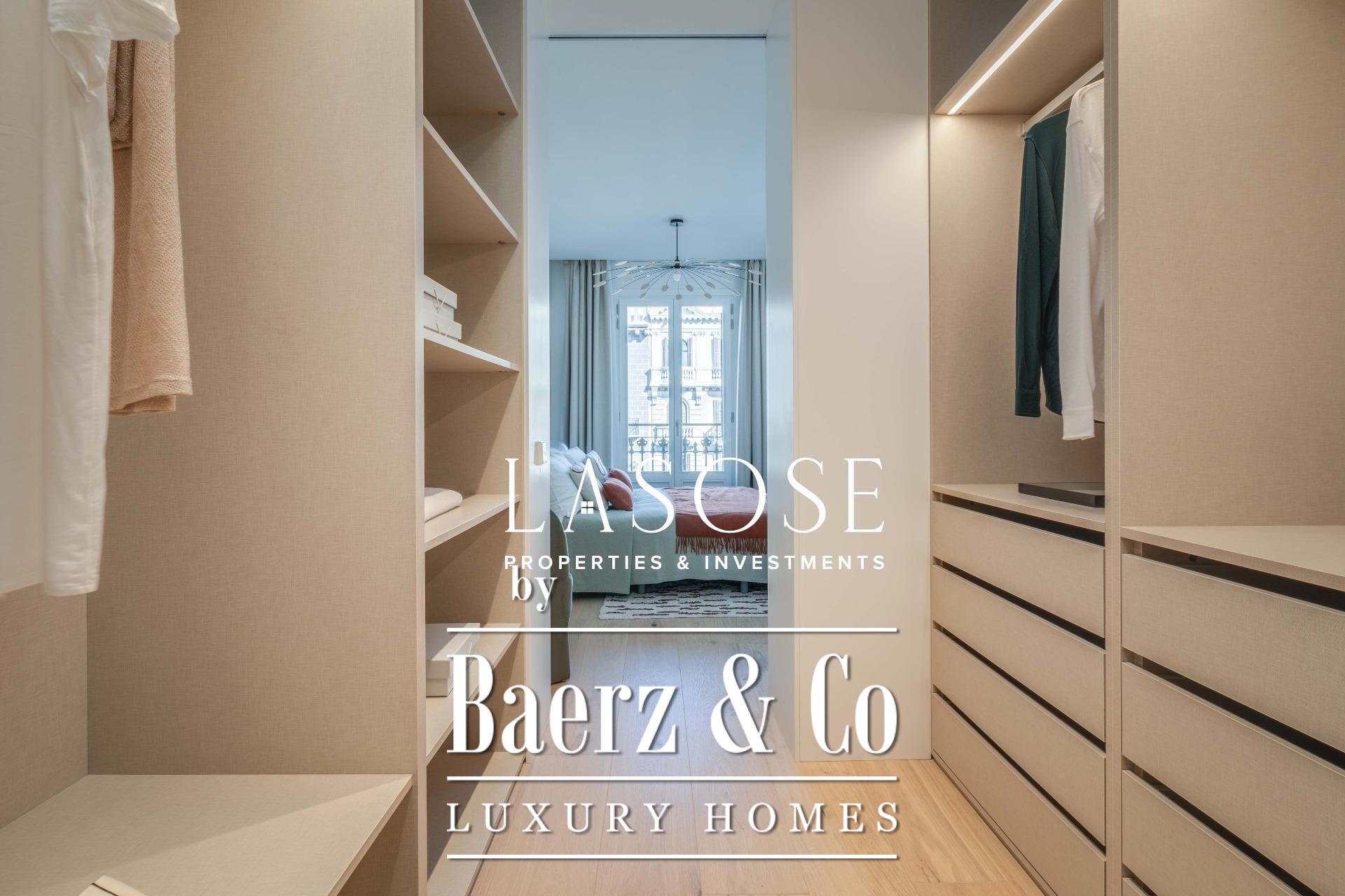 This particular residence offers 137 m² of living space, thoughtfully arranged with two bedrooms and three bathrooms. Balconies and a generous terrace connect interiors to the pulse of the city, while the building’s façade and communal areas reflect the elegance of classic Barcelona. Interior finishes, designed by Estudio Vilablanch, balance modernity with enduring style, featuring premium appliances, expansive wardrobes, heating, and a refined light-filled atmosphere.