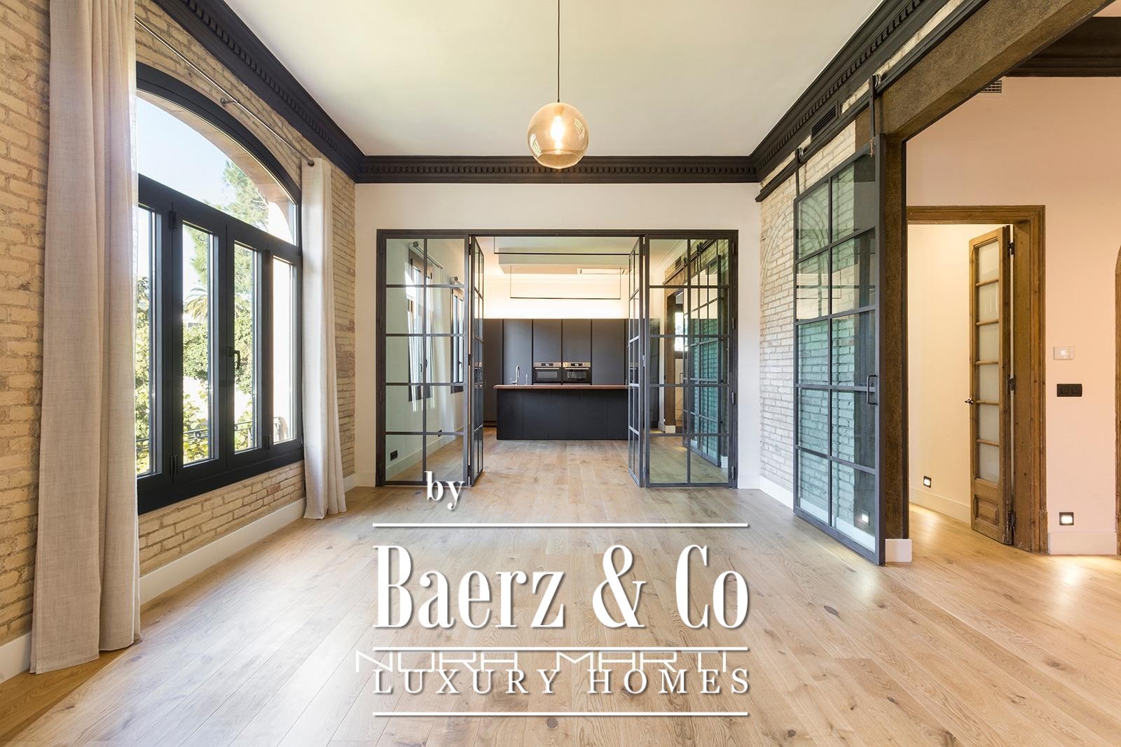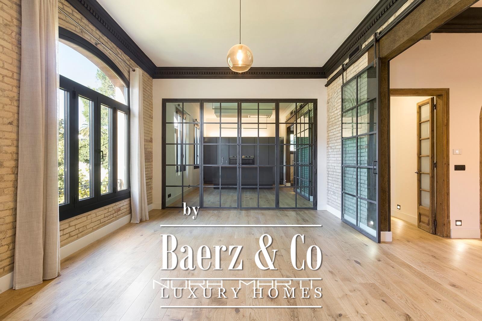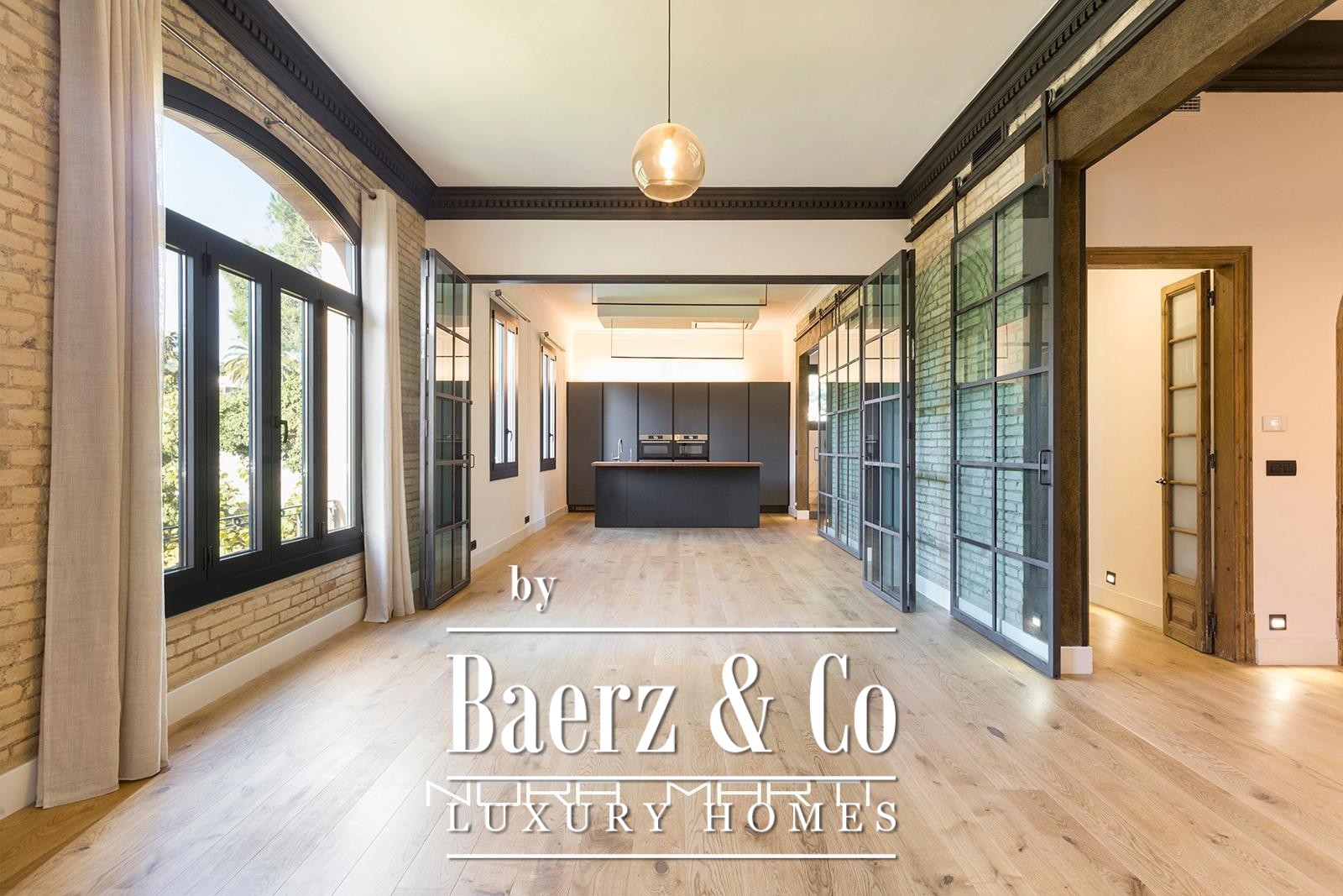 Apartment Barcelona defines gracious living in the highly sought-after Bonanova neighborhood. Set within a 1930s Art Nouveau villa, this unfurnished duplex spans 250 m², entirely exterior-facing and meticulously renovated. Light streams through expansive windows into the spacious living-dining area, bridging historic charm and modern comfort in an atmosphere of understated luxury. The kitchen, featuring high-end appliances and a generous island, sets the tone for gatherings and daily ritual alike.
