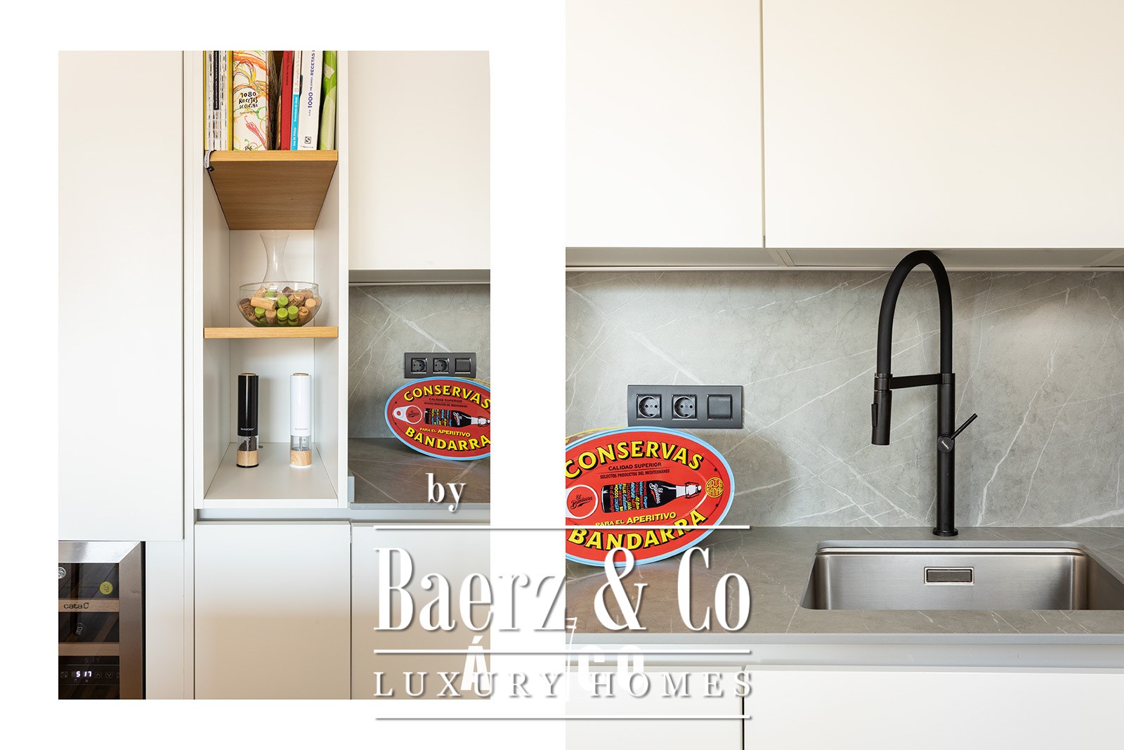 The centerpiece is the open living and dining area, anchored by a fully equipped kitchen with custom cabinetry, high-end appliances, and a dedicated wine cellar. This living space flows onto a 16 m² sea-facing terrace, framing views over the National Palace and Montjuïc Mountain—a serene backdrop for both quiet moments and convivial evenings. The master suite is filled with light, featuring an en suite bathroom, dressing room, and access to a private 14 m² terrace oriented toward Tibidabo and the architectural order of the Eixample “illa.” The dual orientation ensures sunlight and uninterrupted vistas throughout the day.