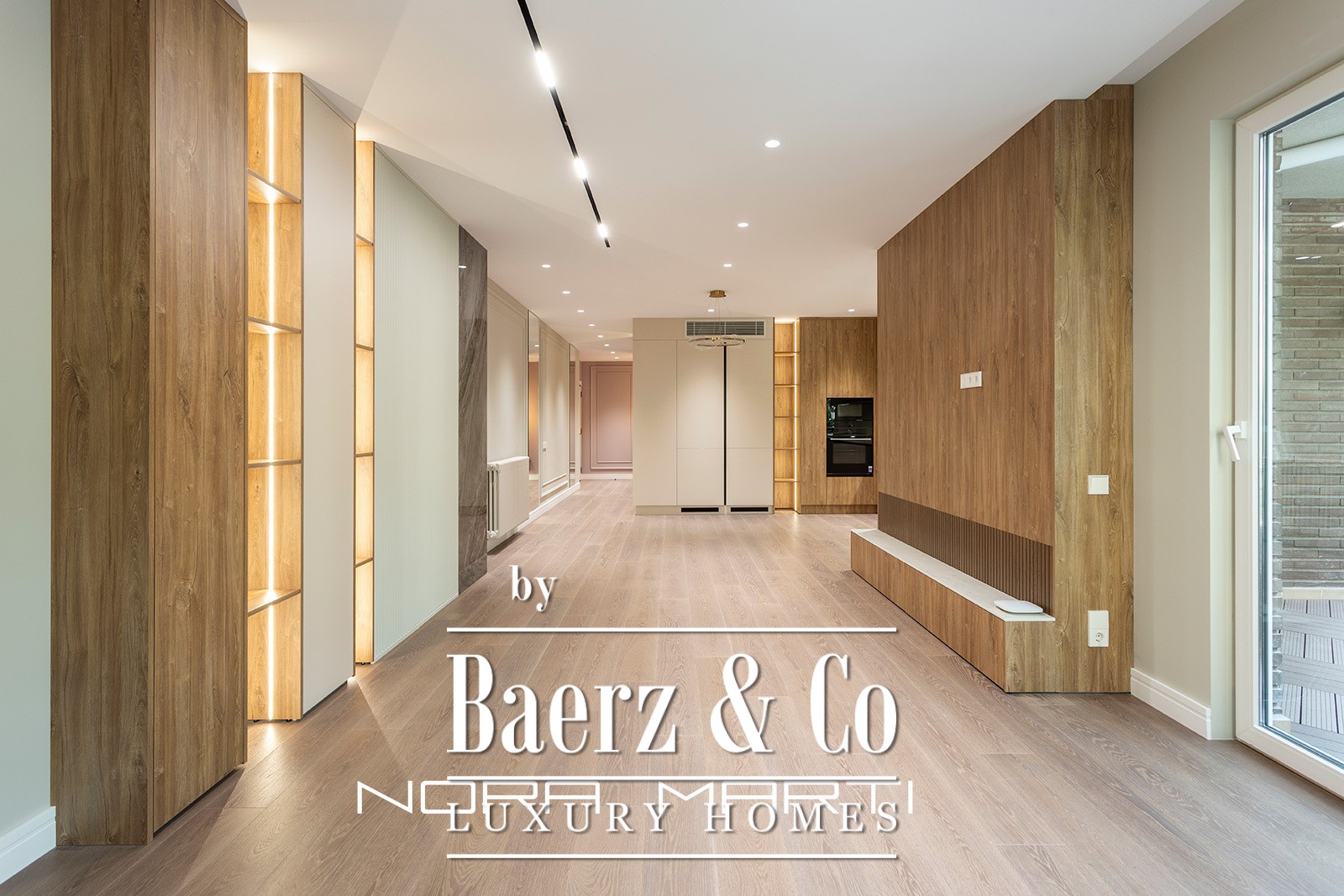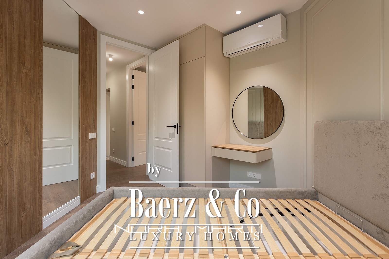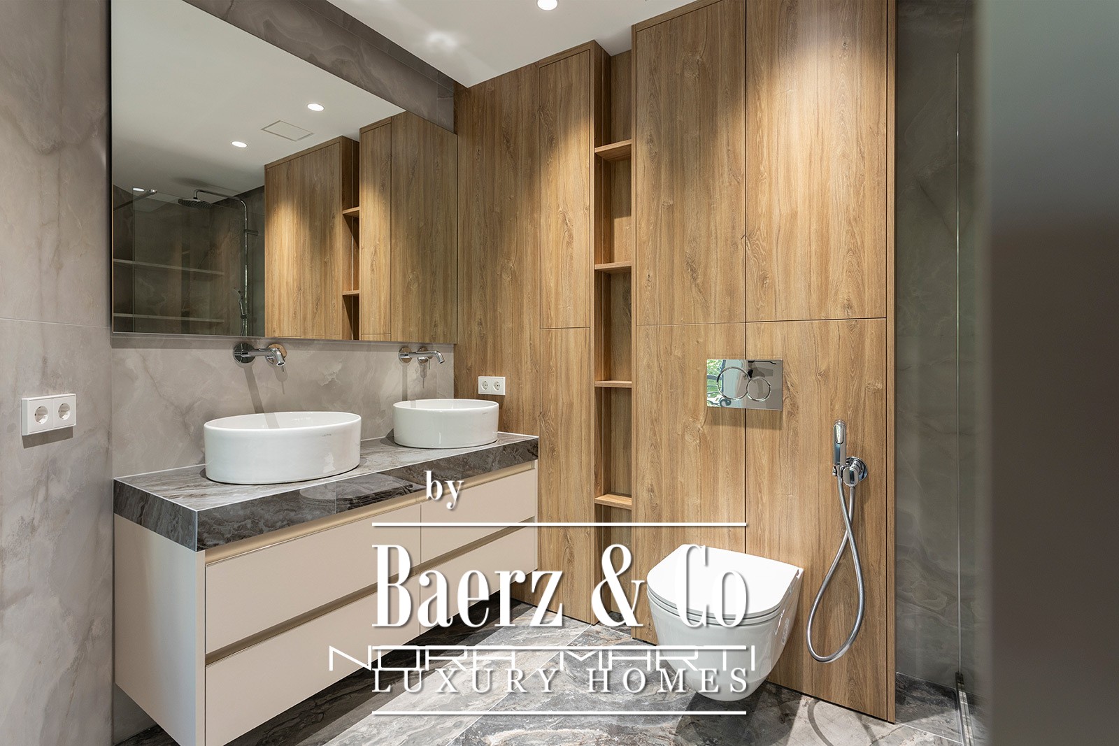 A generous open-plan living, dining, and kitchen area of approximately 51 m² anchors the home, seamlessly connected to one of two terraces totaling about 12 m². The kitchen is both functional and elegant, integrating Bosch appliances with custom cabinetry and storage. Three double bedrooms provide calm, private retreats, including a master suite with dressing area, private bathroom, and direct terrace access. Two additional double bedrooms share a full bathroom, complemented by a discreet guest toilet.