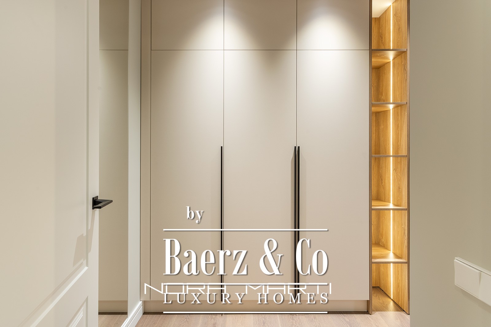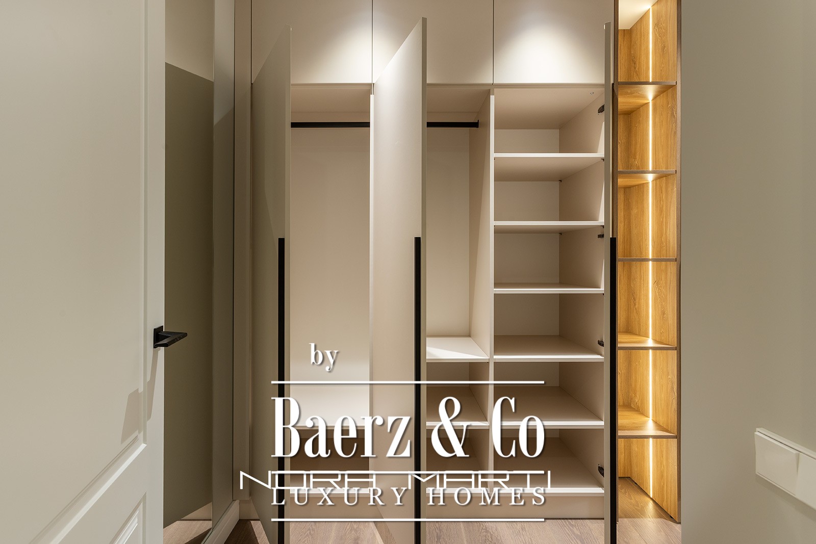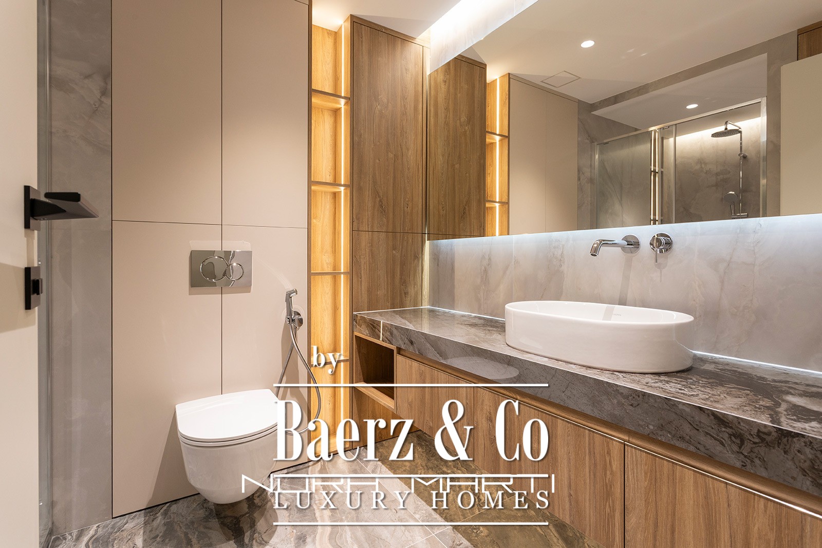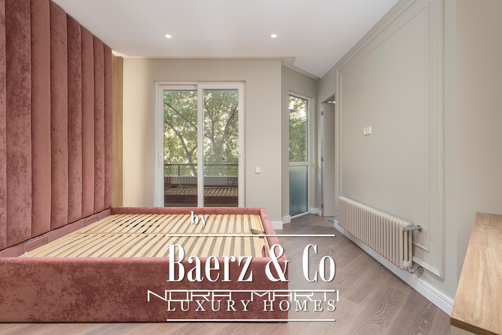 A generous open-plan living, dining, and kitchen area of approximately 51 m² anchors the home, seamlessly connected to one of two terraces totaling about 12 m². The kitchen is both functional and elegant, integrating Bosch appliances with custom cabinetry and storage. Three double bedrooms provide calm, private retreats, including a master suite with dressing area, private bathroom, and direct terrace access. Two additional double bedrooms share a full bathroom, complemented by a discreet guest toilet.