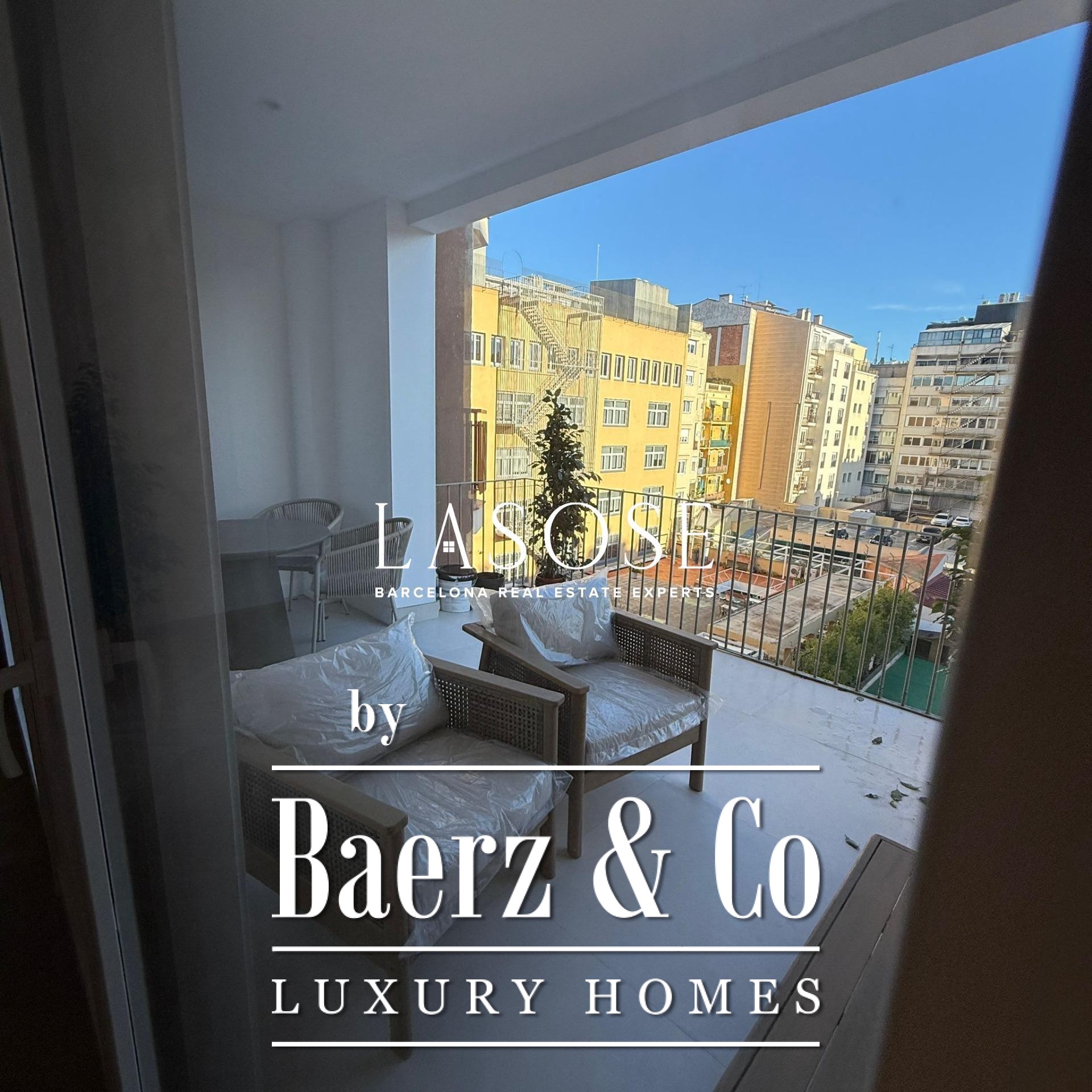 Original high ceilings, decorative moldings, and traditional wooden double doors evoke Barcelona’s architectural heritage, while the expansive multifunctional living, dining, and kitchen area is heightened by abundant natural light and direct access to an 18 m² private terrace. The terrace accommodates both lounge and dining settings, connecting the interior rhythm seamlessly to the city’s celebrated outdoor lifestyle.