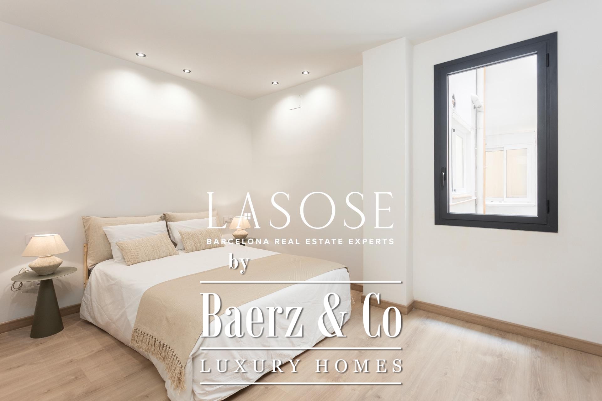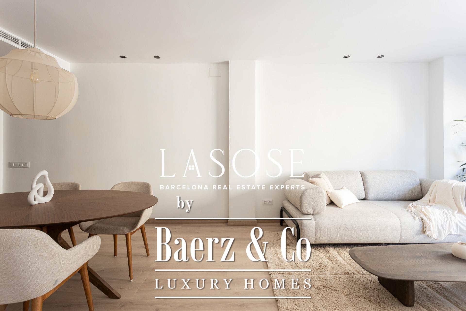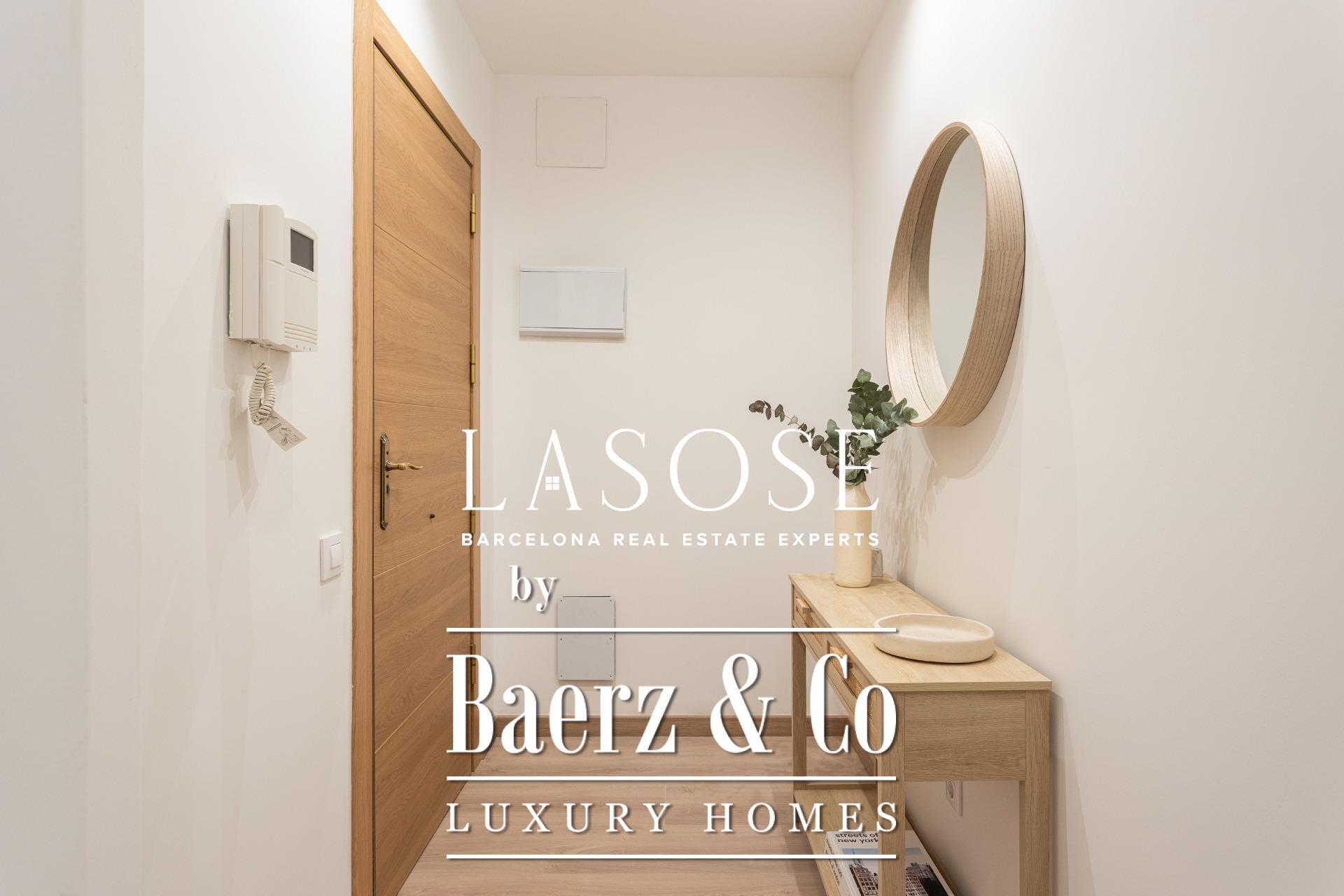Three bedrooms include a main suite with terrace access, fitted wardrobes, and a private bathroom, complemented by a double and single bedroom. Both bathrooms feature concealed taps, LED illumination, and porcelain detail. Amenities include ducted Mitsubishi air conditioning, advanced insulation, laundry room, and a parking space in the building for a small car or motorbike, offering discreet comfort in the core of Barcelona. This luxury apartment for sale in Barcelona presents the equilibrium of modern design and metropolitan lifestyle.