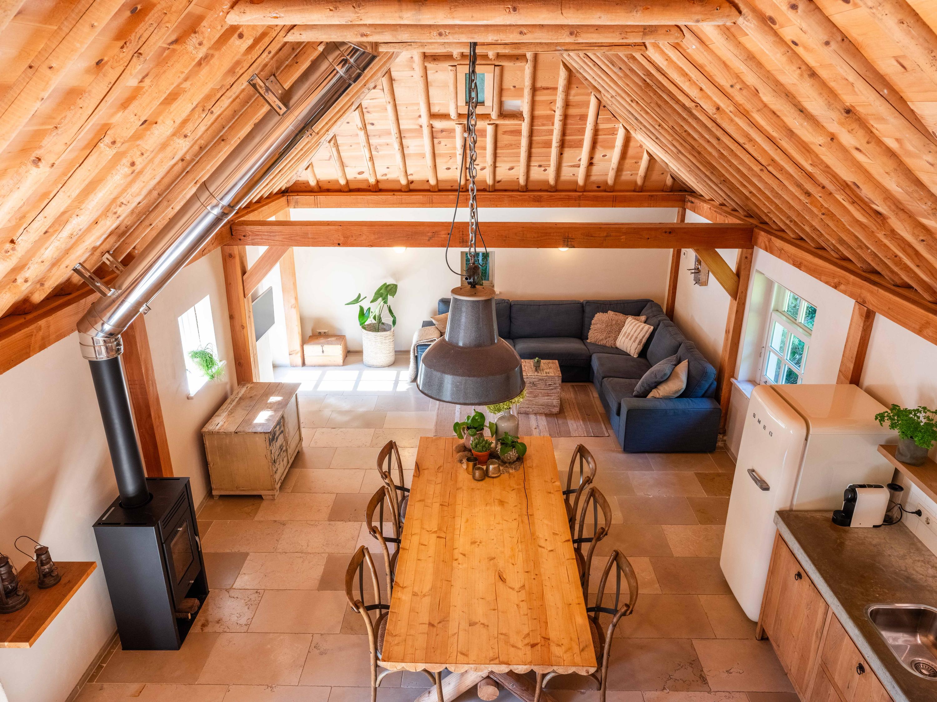 Main residence is a 344 m² architect-designed villa completed in 1984, exuding a calm, contemporary energy throughout. The generous living room captures daylight and open meadow prospect, complemented by a fireplace for evening warmth. In the kitchen, an island connects family gatherings with views of green, while French doors and a covered, heated terrace blur boundaries between indoors and out. Appliances include a quooker, professional stove with teppanyaki and deep fryer, steam oven, wine cooler, and more. Adjacent utility spaces offer further practicality.