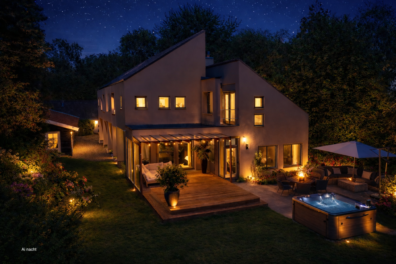 The modern open kitchen has an island where you can sit together. From here again a beautiful view of the greenery.French doors and a covered heated terrace bring the outside in.The kitchen is equipped with various appliances including a quooker, refrigerator, freezer, steam oven, wine cooler, warming drawer and dishwasher. Cooking is available on the large stove with 4 gas burners, a teppanyaki plate, deep fryer and double oven.