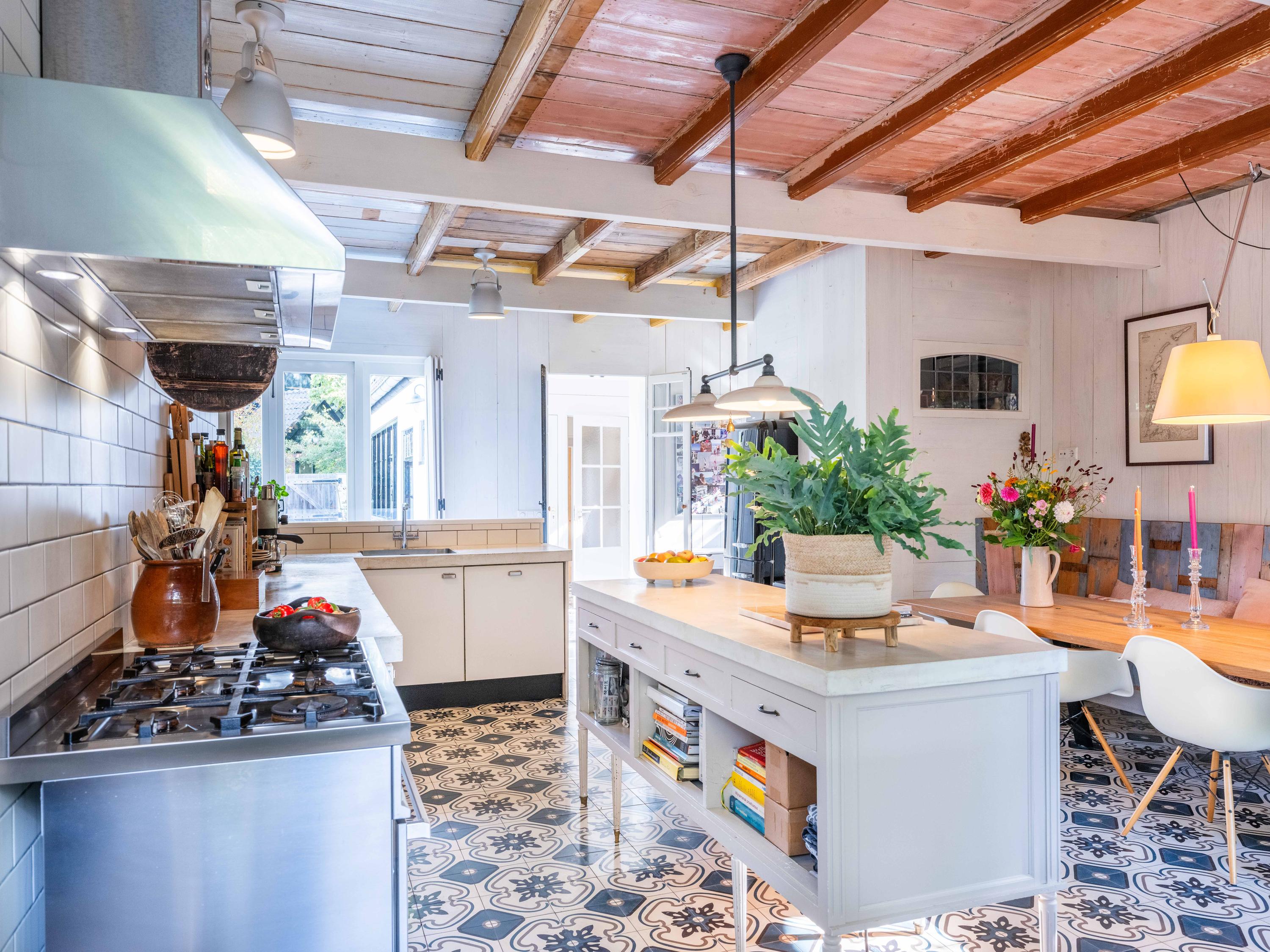 On the other side of the house, you will find the former atelier, now used as a guesthouse with a kitchenette and sleeping area. The roof has been insulated, and the upper floor is beautifully light and spacious.