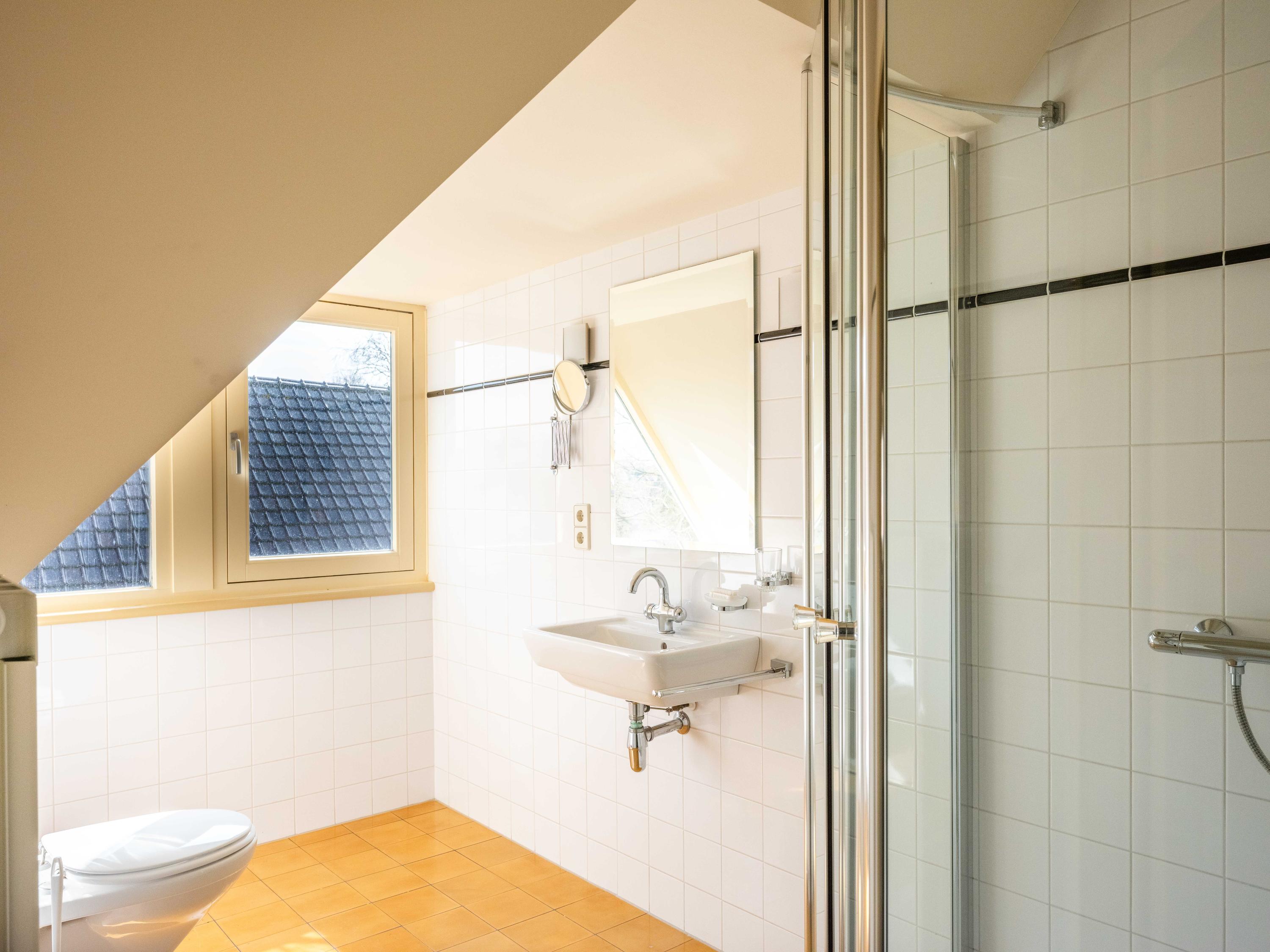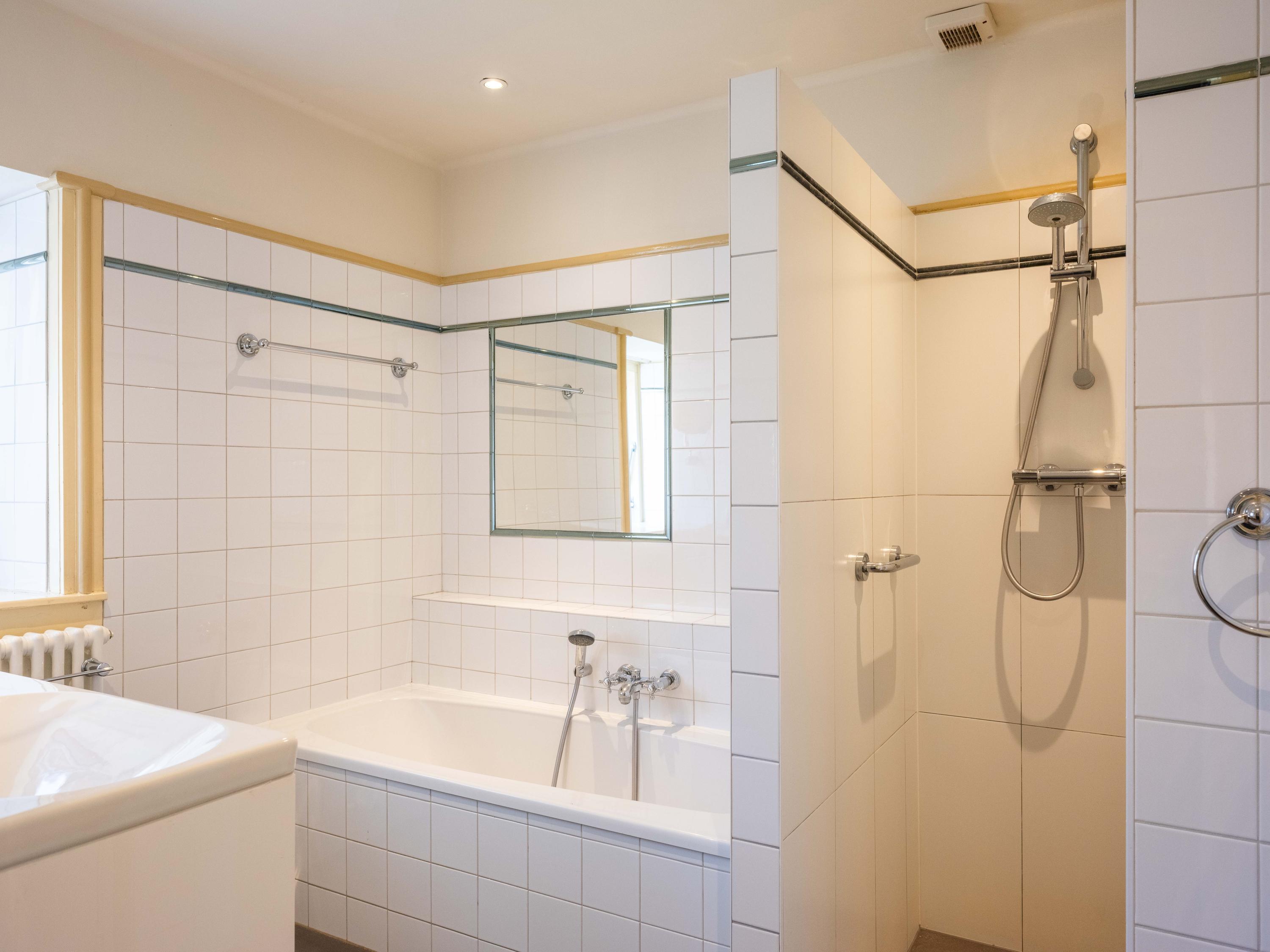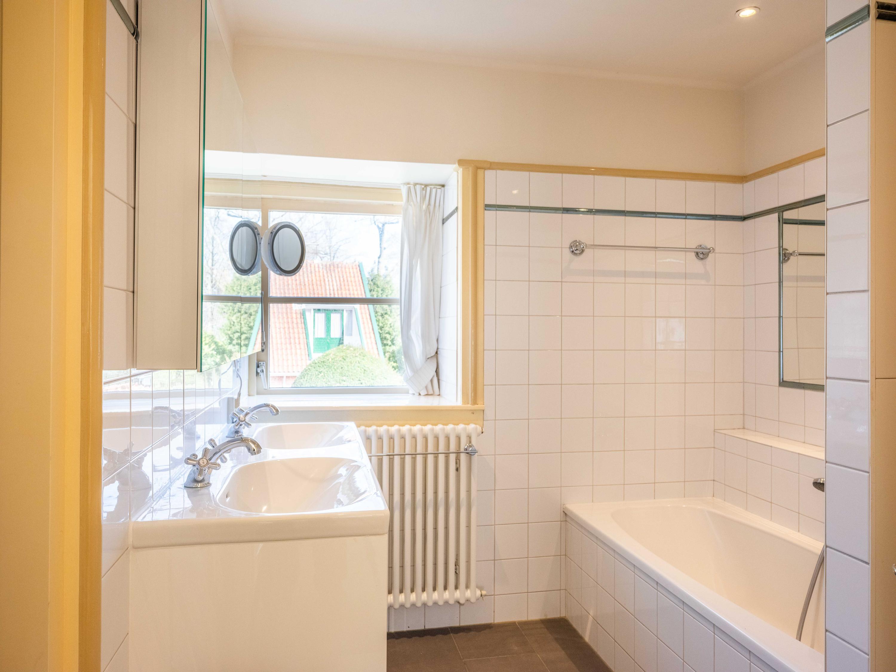 Upstairs you will find 3 bedrooms, one of which has a washbasin. The rear bedroom also has access to the bathroom. The bathroom has a double sink, a bathtub and walk-in shower. A separate toilet is located on the landing.