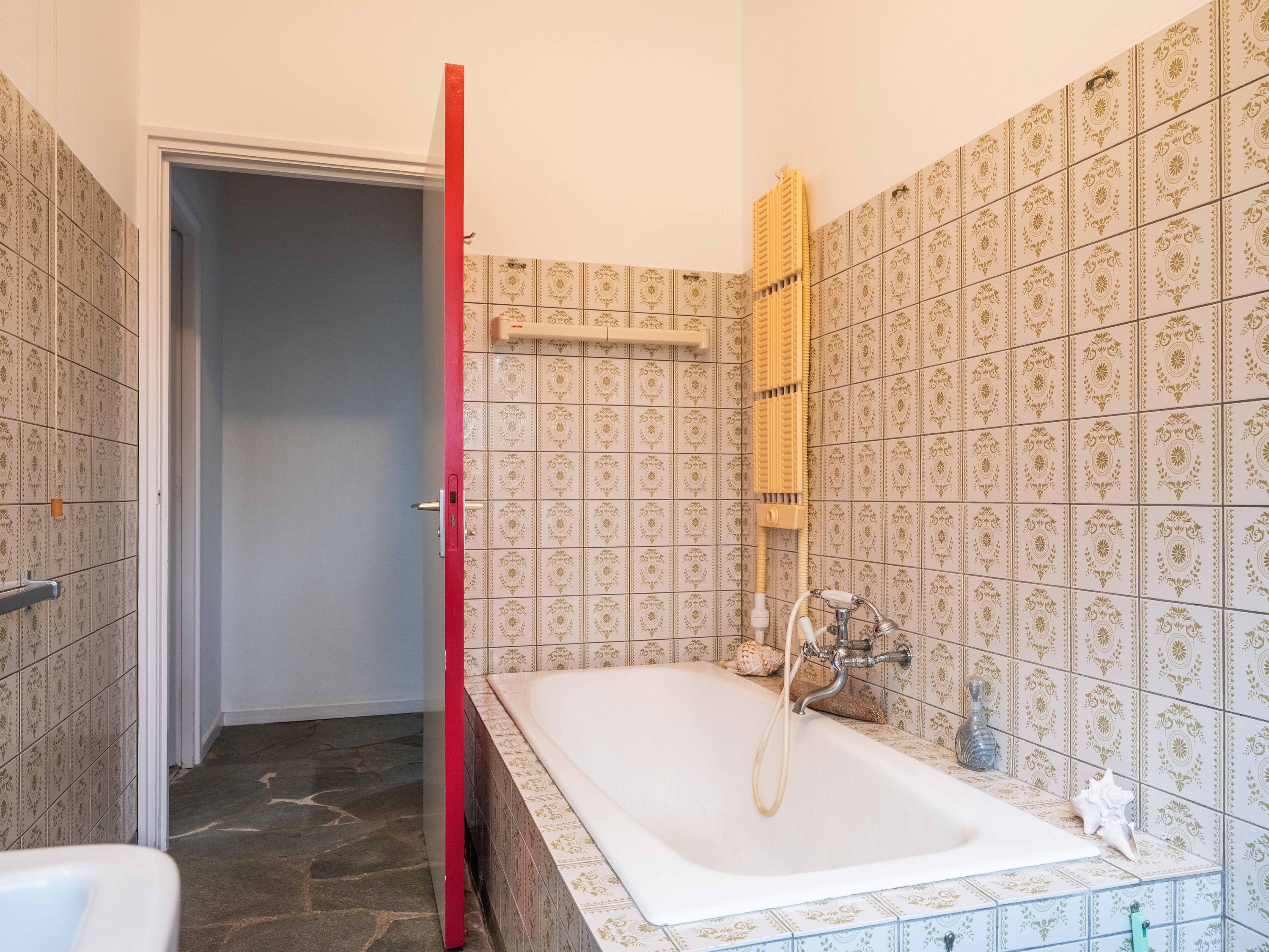 The main hall, discreetly approached from the rear, sets a quiet tone. The living room offers a sense of openness, anchored by a fireplace and extending outside onto a loggia. Two bedrooms include a generous master with direct garden access and a second room adaptable as a study. Two complete bathrooms, one appointed with a bath and bidet, provide comfort and potential for subtle luxury. The kitchen and adjoining utility rooms remain in their authentic state, inviting renewal while retaining provenance.