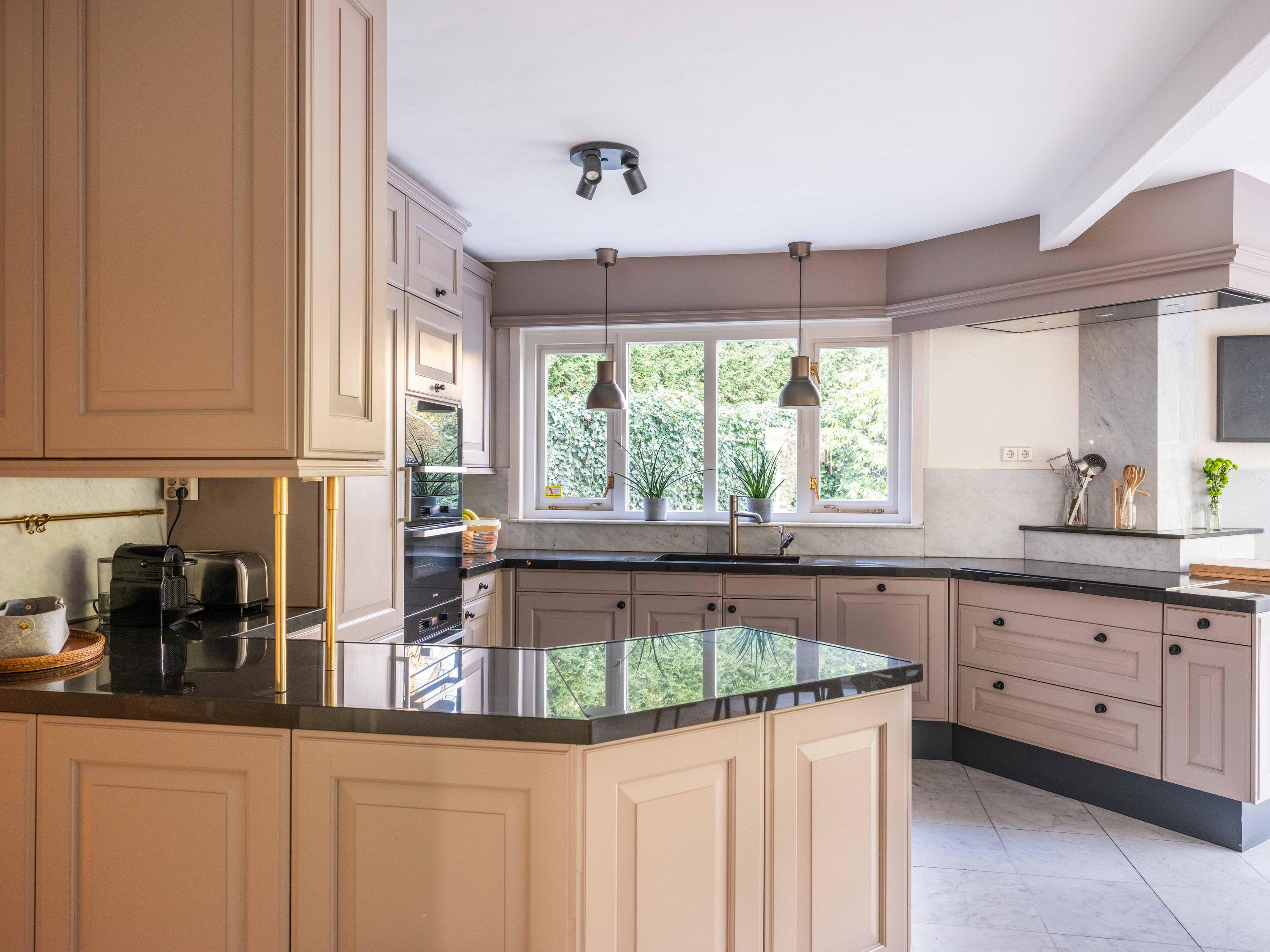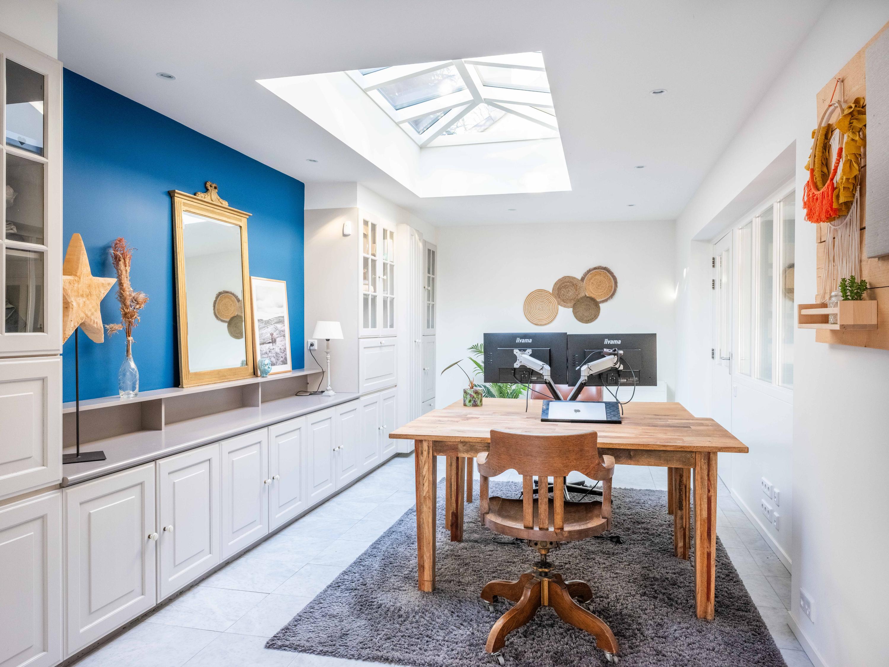 Entering the hall, one moves past the staircase and cloakroom into a kitchen designed for culinary ambition, equipped with a five-burner induction hob, quooker, steamer, and two combi ovens. Sunlight fills the living room, which features a fireplace and sliding doors leading to a terrace that faces the carefully enclosed garden. On the same level, an adaptable office and laundry area connect directly to the outdoors, inviting a seamless flow between work, leisure, and the privacy of home.