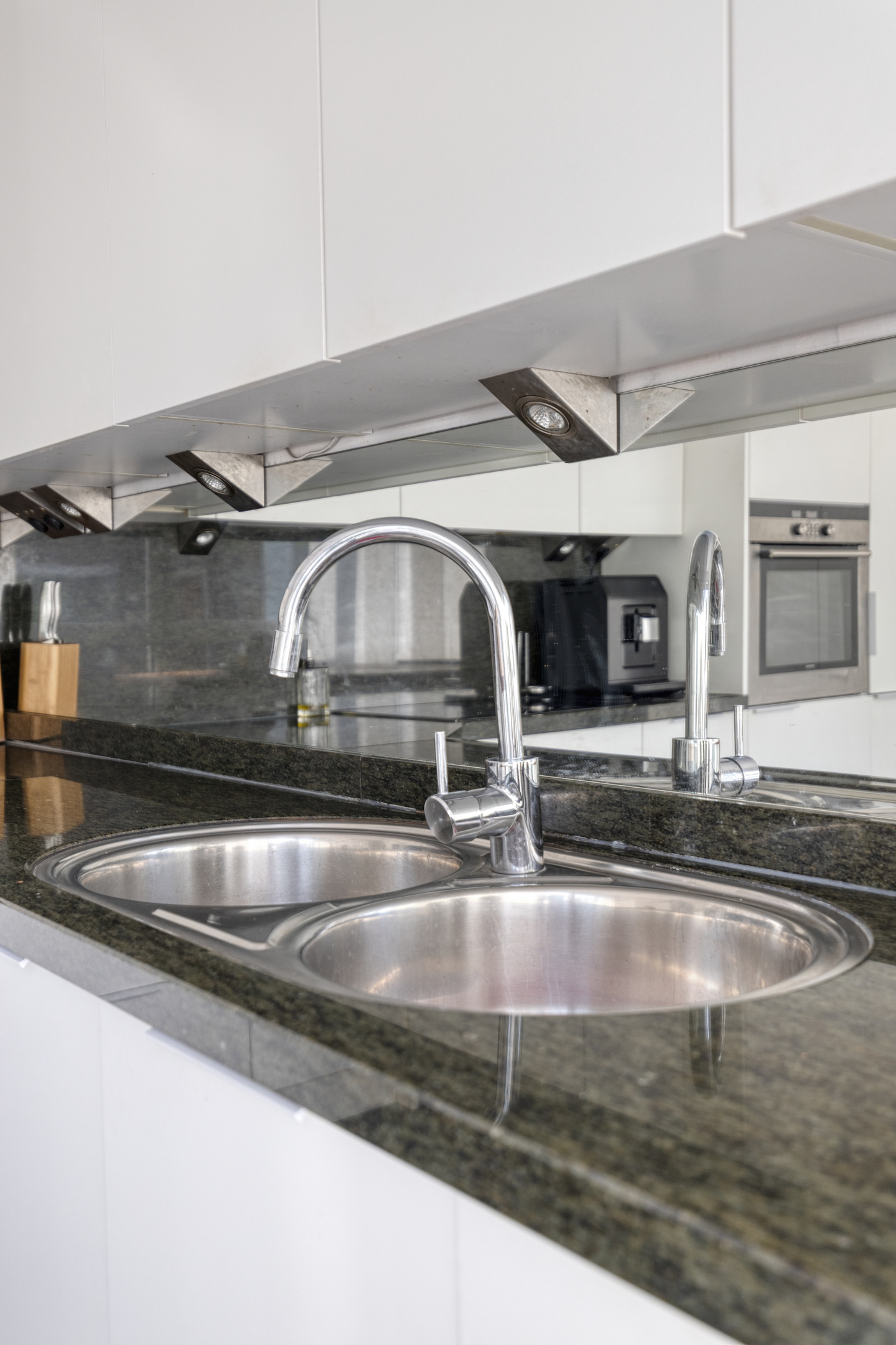 Separate L-shaped kitchen equipped with an induction hob, dishwasher, double sink, extractor hood, oven and fridge-freezer combination