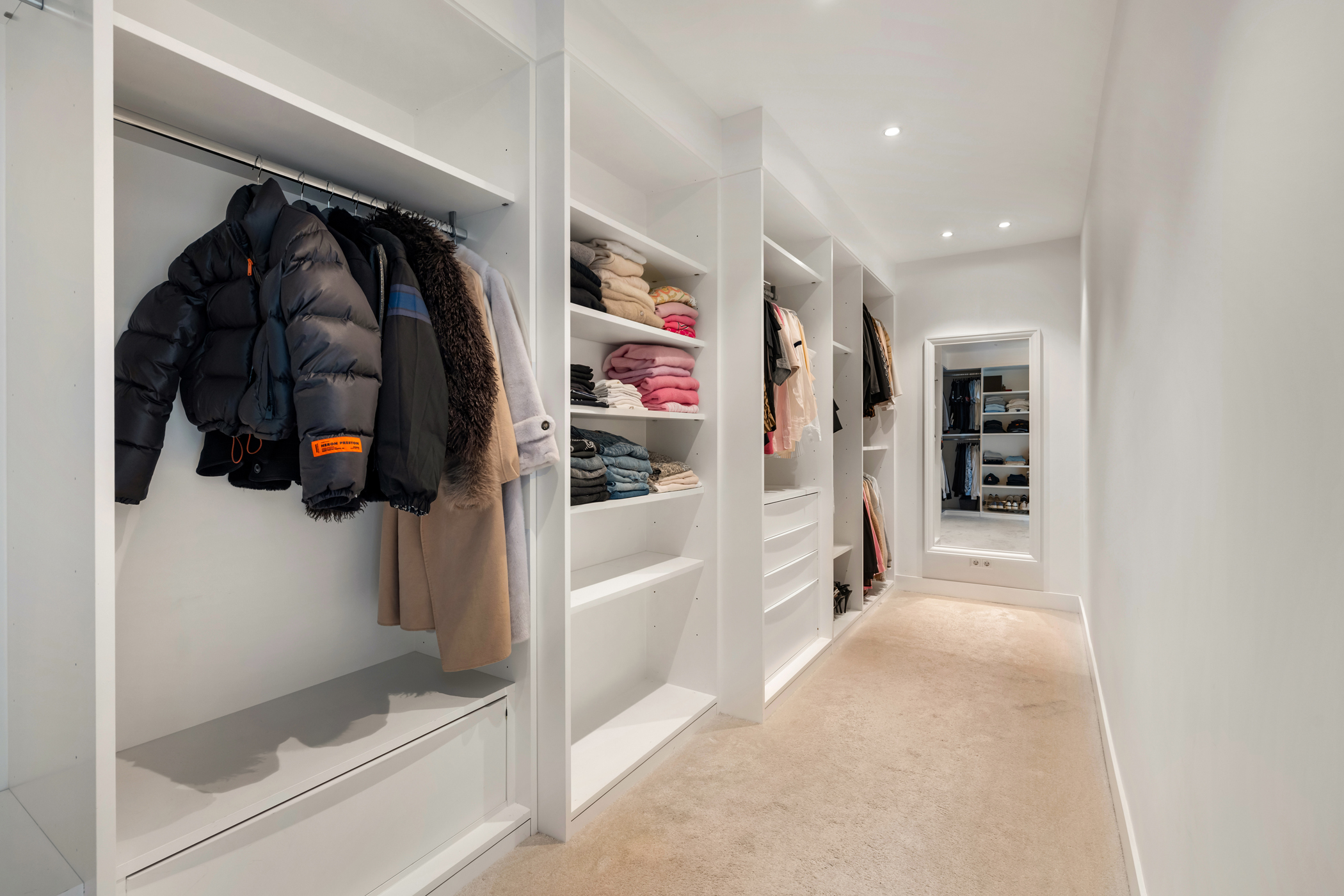 A long hallway provides access to an office space with sliding doors to the rear garden and an additional storage room.