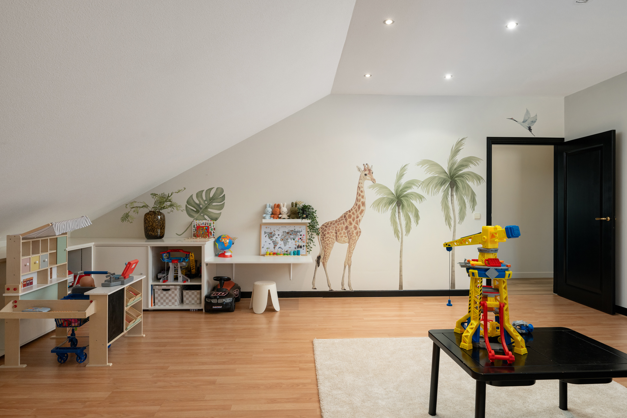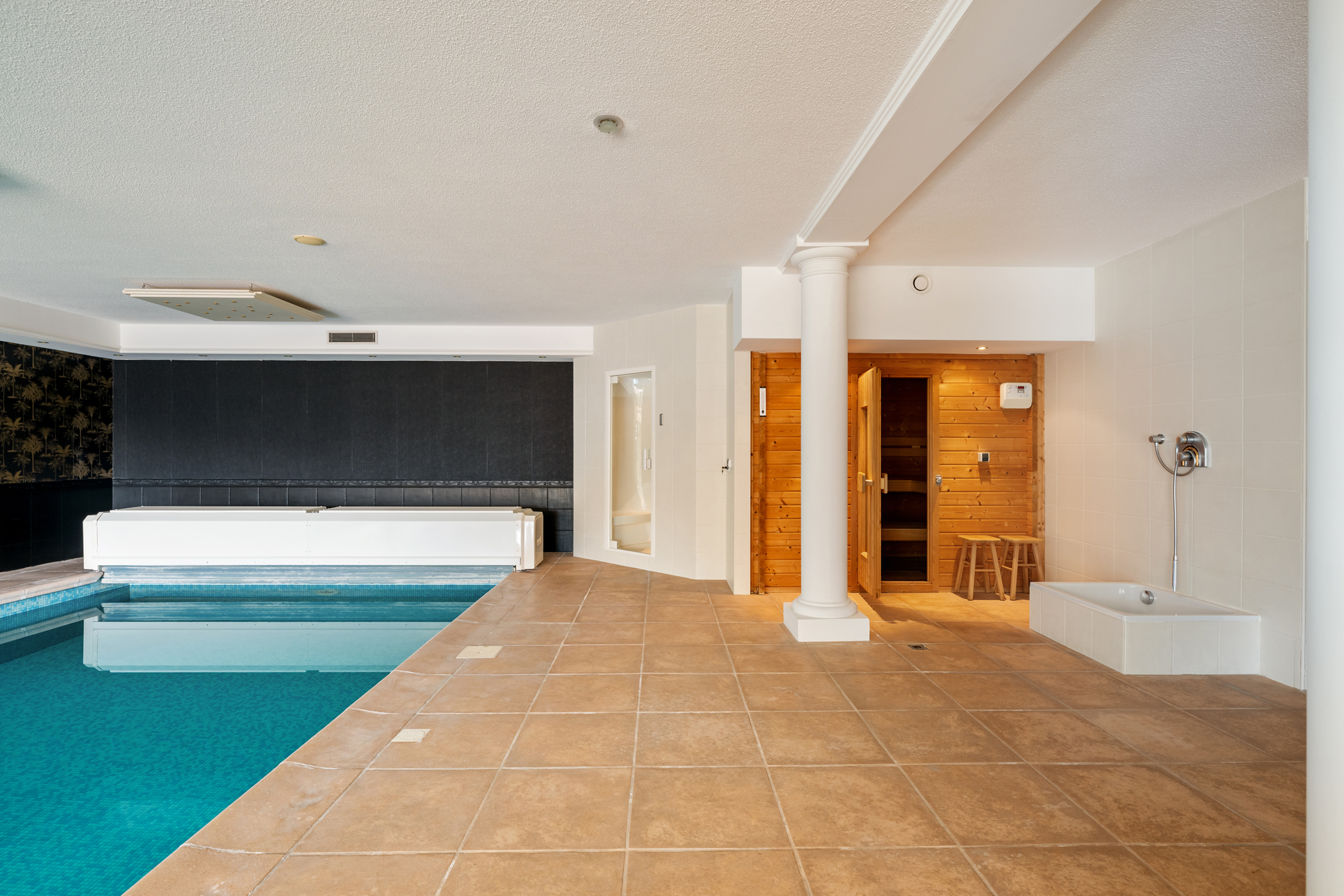 Through French doors, you enter the wellness area, which includes a technical room, pantry, sauna, toilet, and a luxurious indoor swimming pool. Sliding doors from the wellness area lead to the rear garden and the detached garage, which has a hobby greenhouse attached to the back.