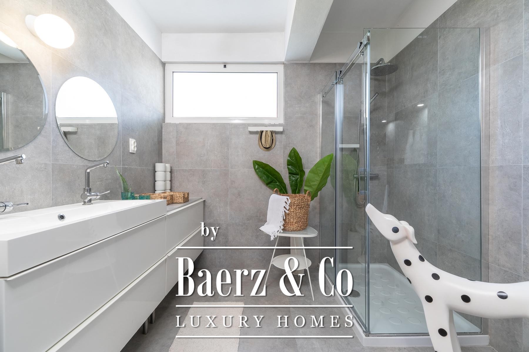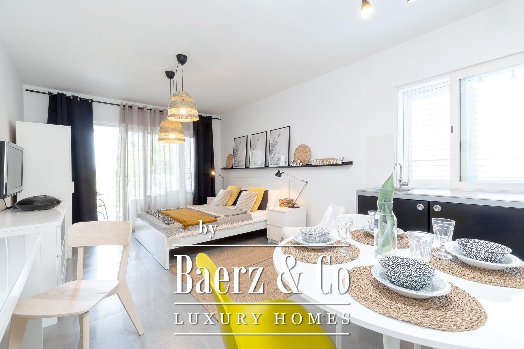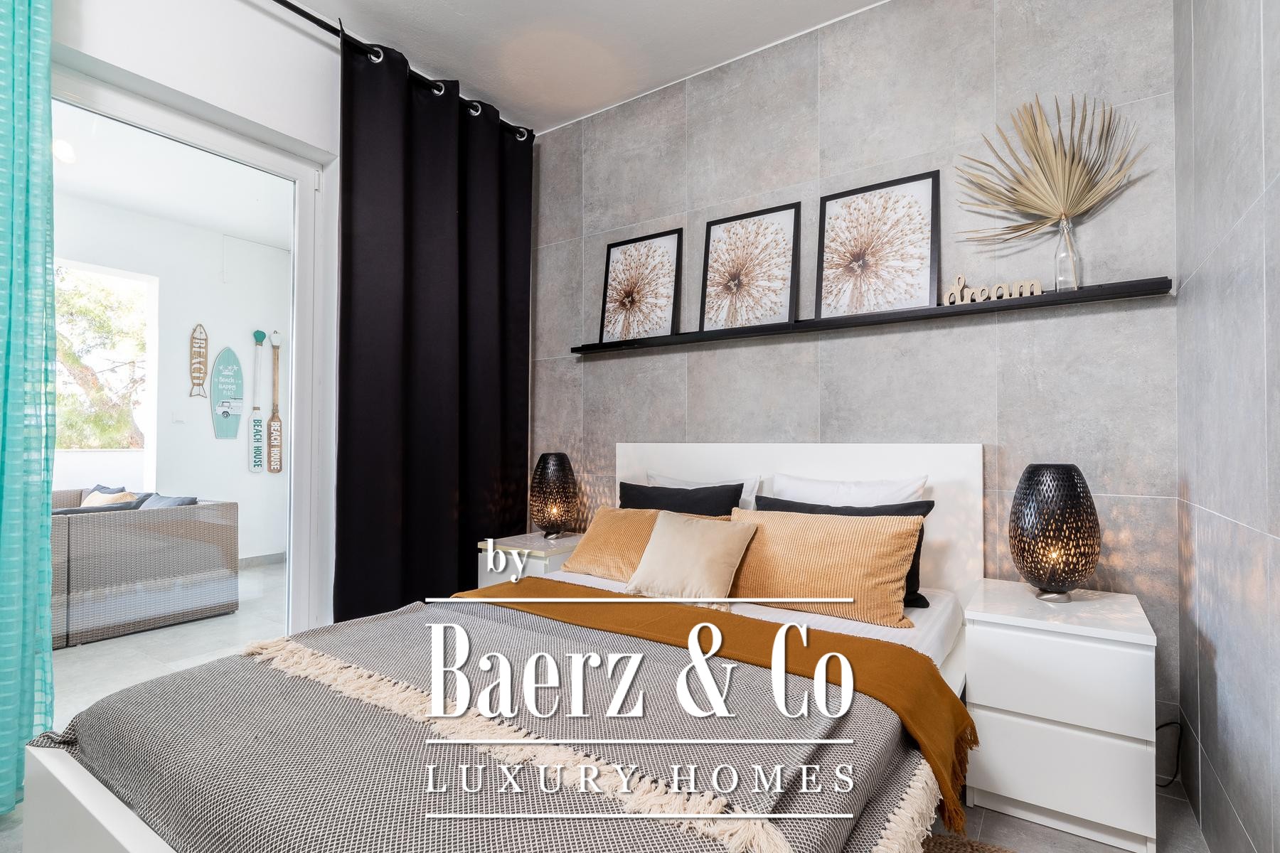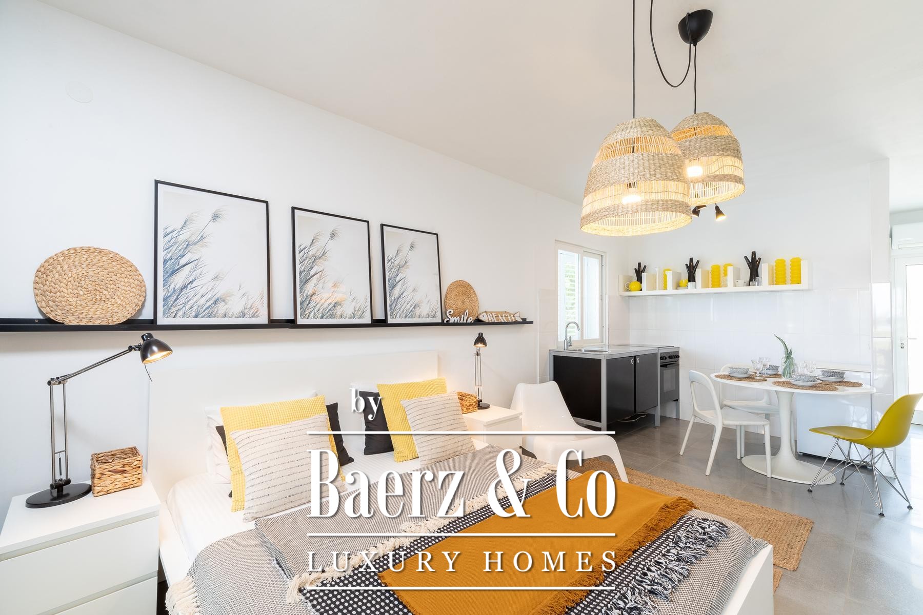 Upstairs, two more autonomous apartments welcome guests with separate entrances. Each features sliding doors to private terraces or a loggia with sweeping sea vistas, kitchens open to living spaces, and tranquil bathrooms, with one as a full studio and the other as a one-bedroom retreat.
