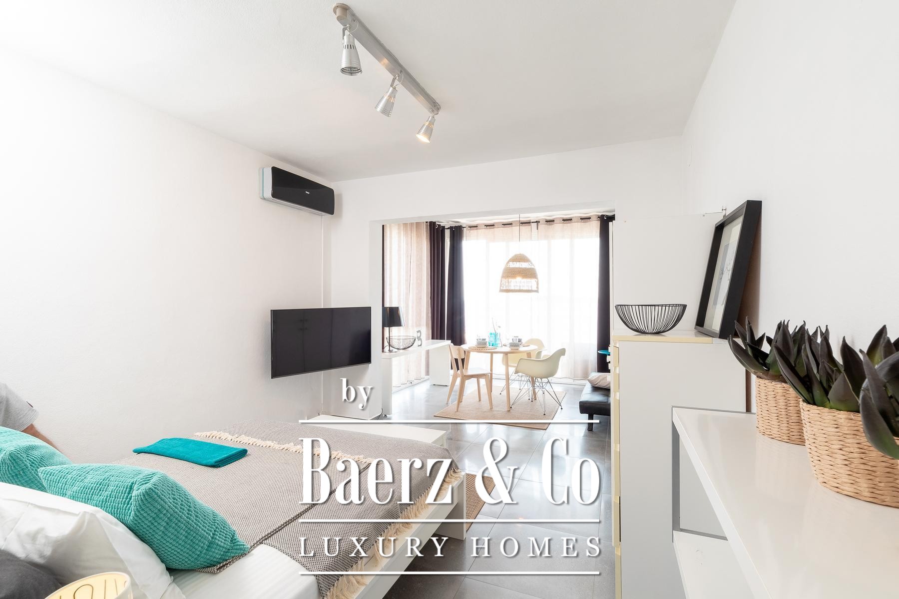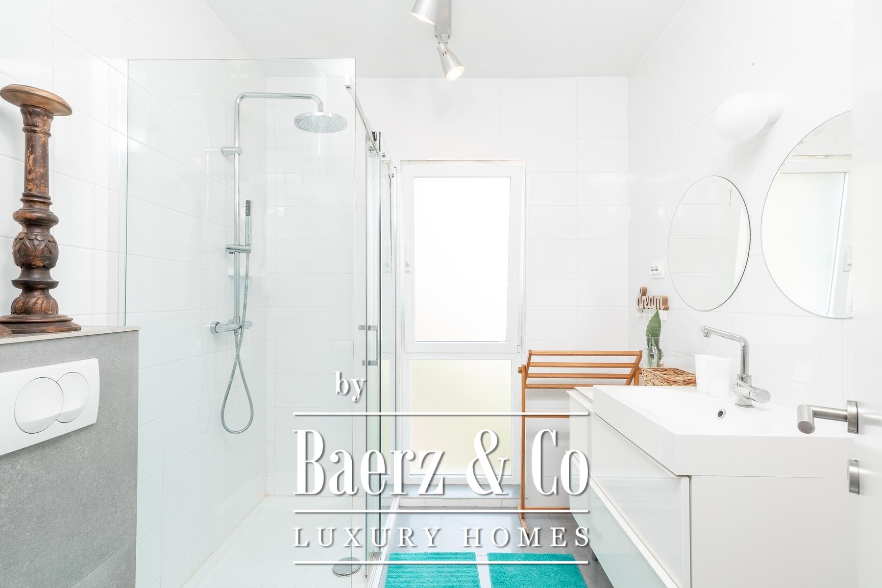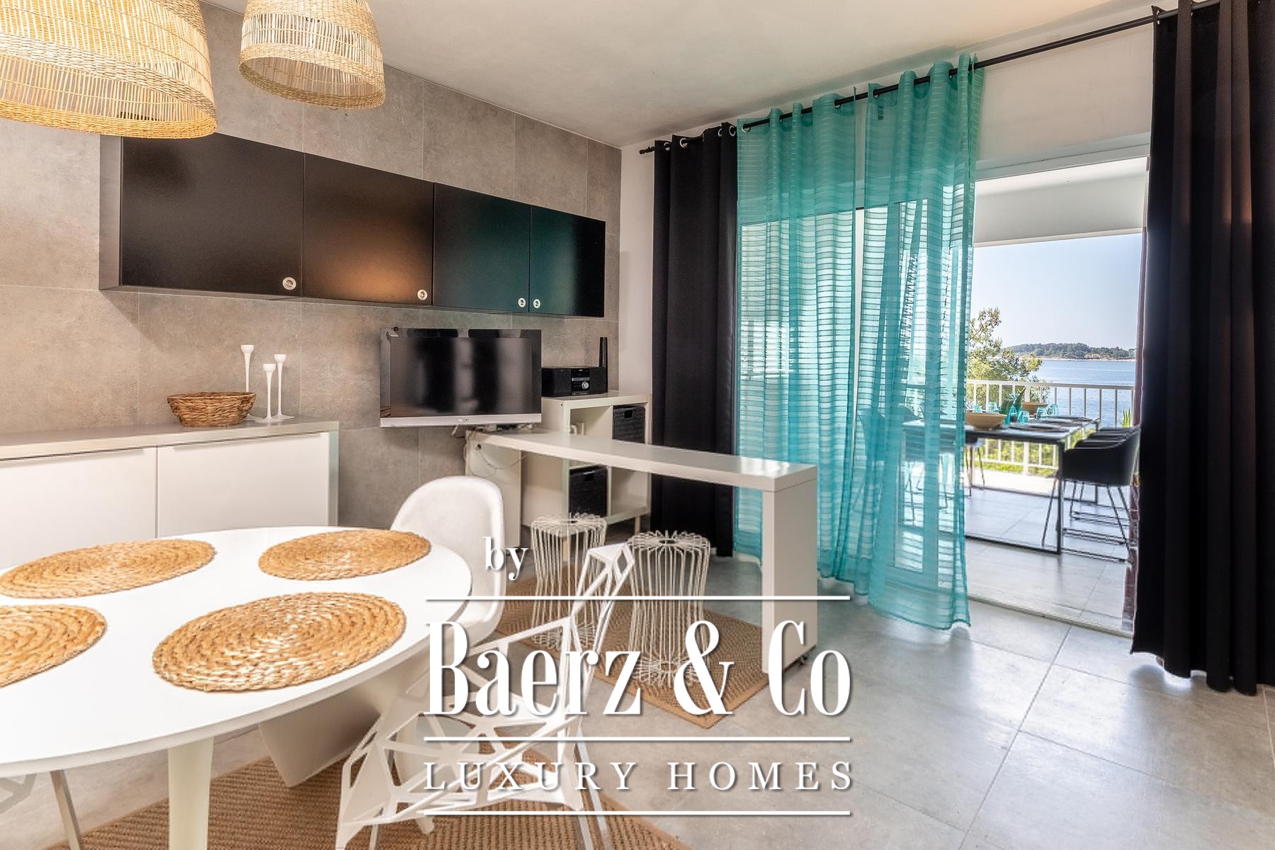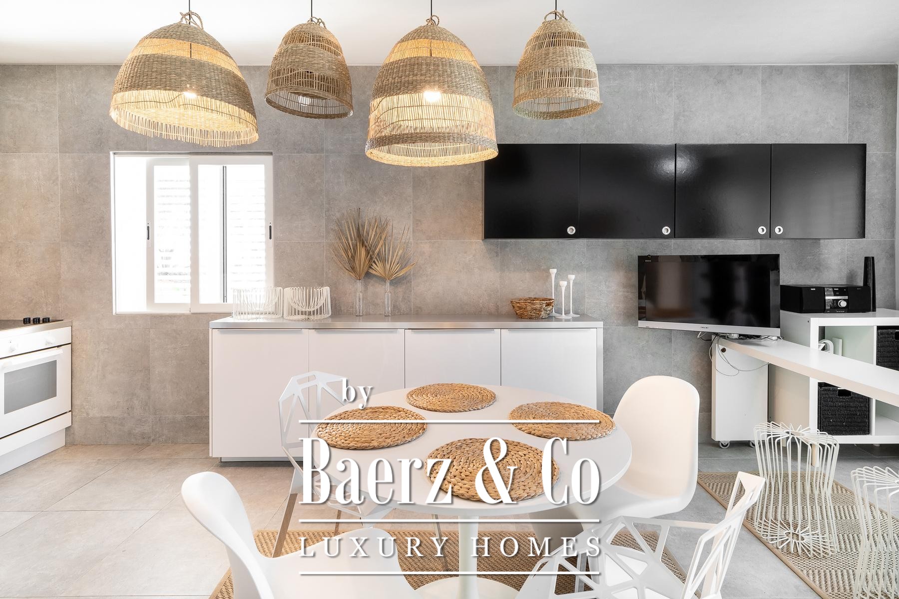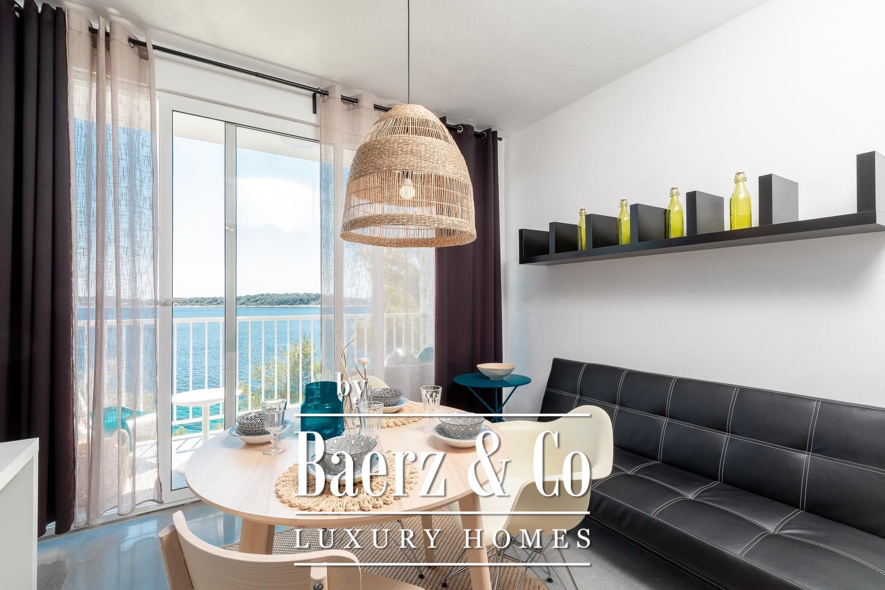 Upstairs, two more autonomous apartments welcome guests with separate entrances. Each features sliding doors to private terraces or a loggia with sweeping sea vistas, kitchens open to living spaces, and tranquil bathrooms, with one as a full studio and the other as a one-bedroom retreat.