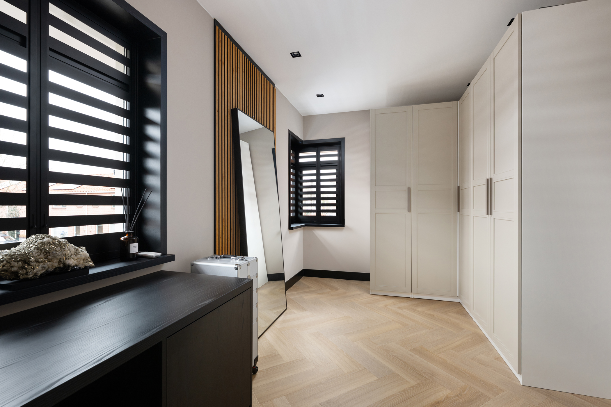 At the front you will find the third bedroom, equipped with air conditioning and built-in wardrobes hidden behind a stylish slatted wall.