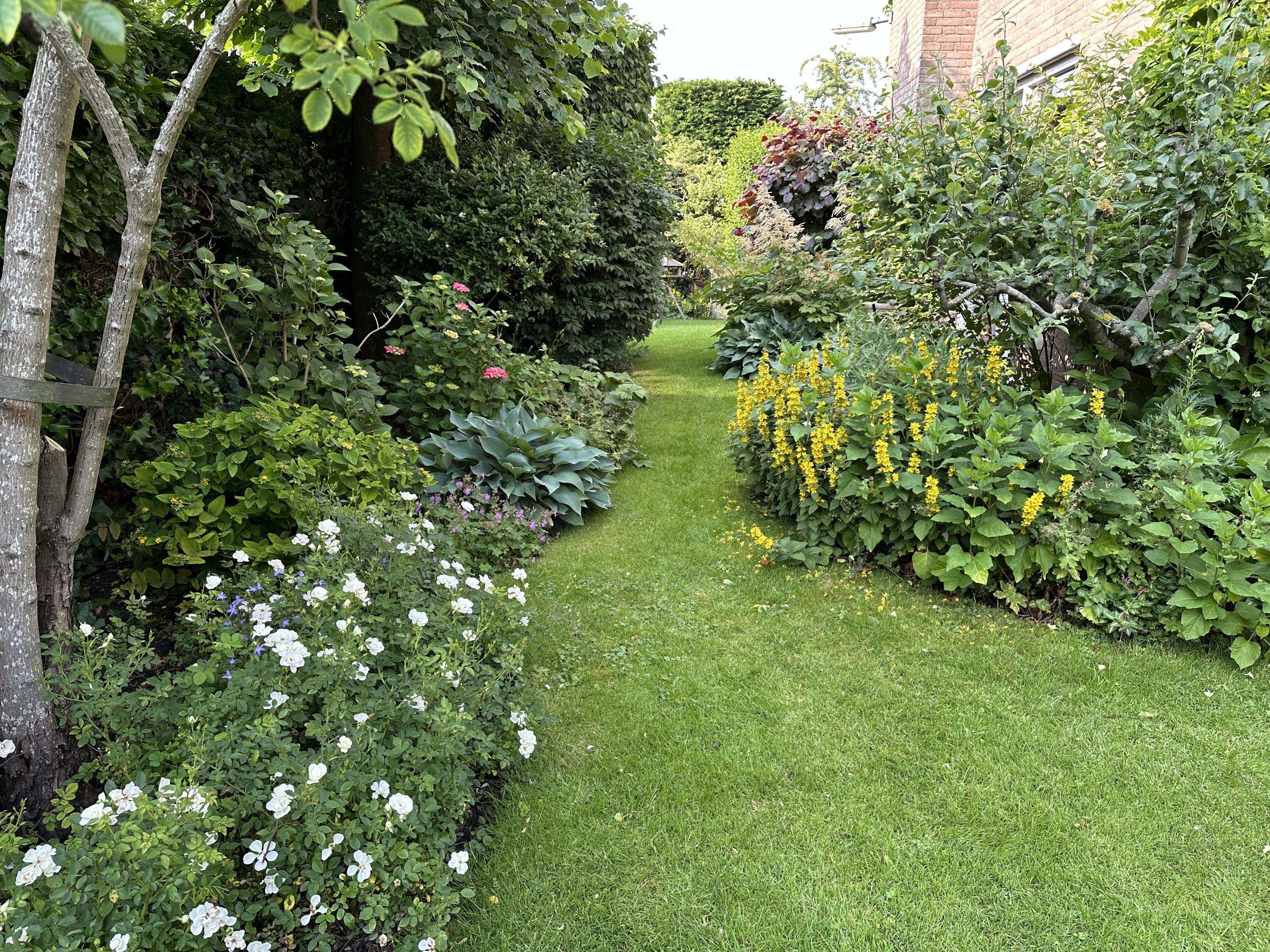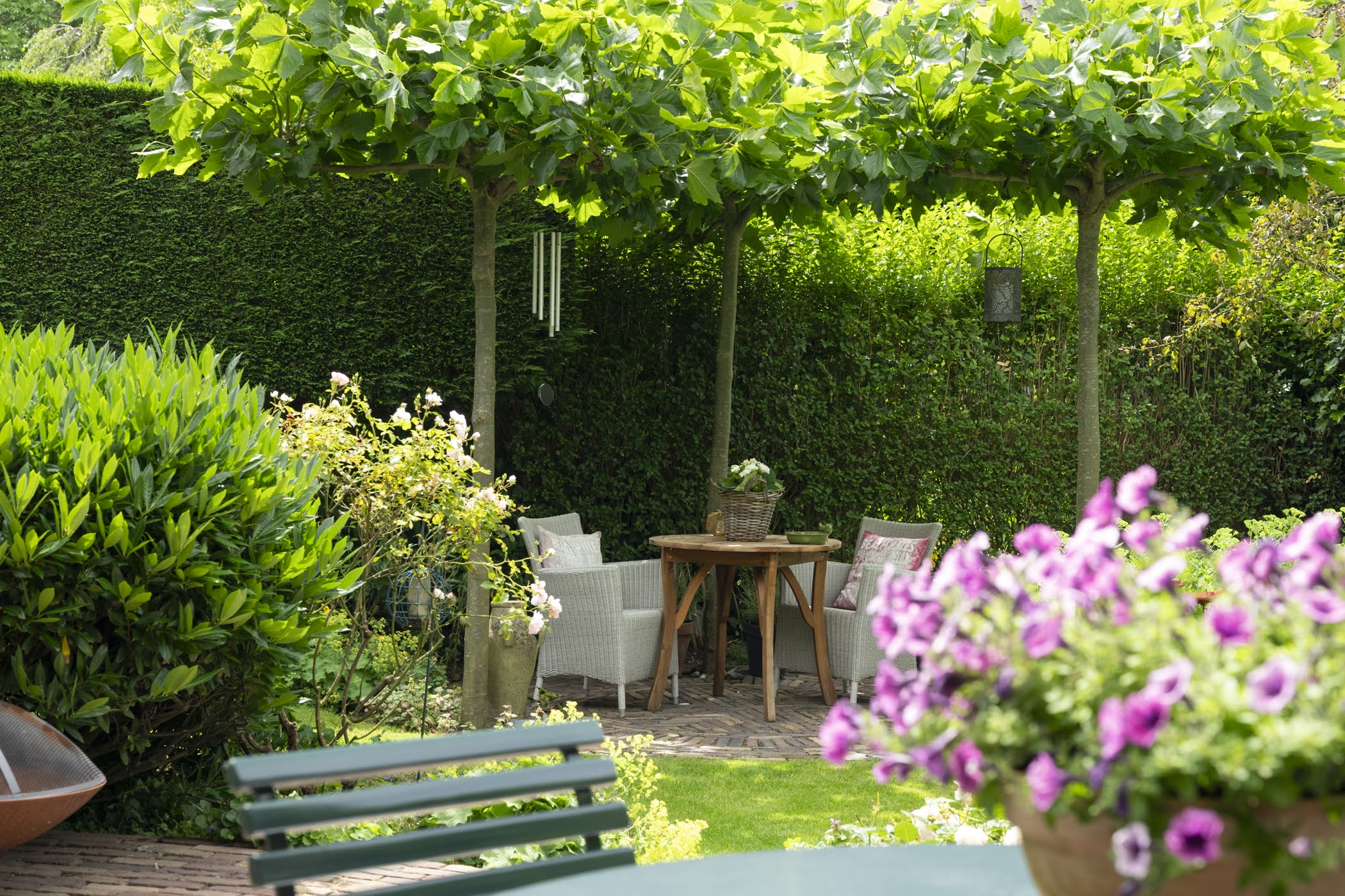 Beautifully landscaped all around, with the largest section facing southwest. Sunny, romantic, and full of flowers. Thanks to the various seating areas, there’s always a perfect spot to relax.