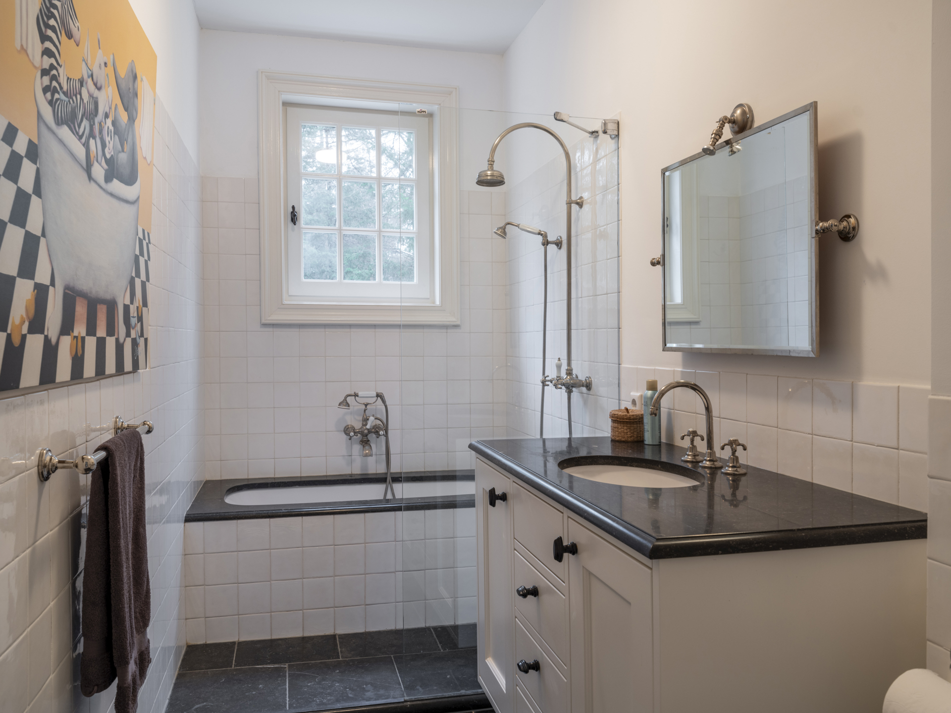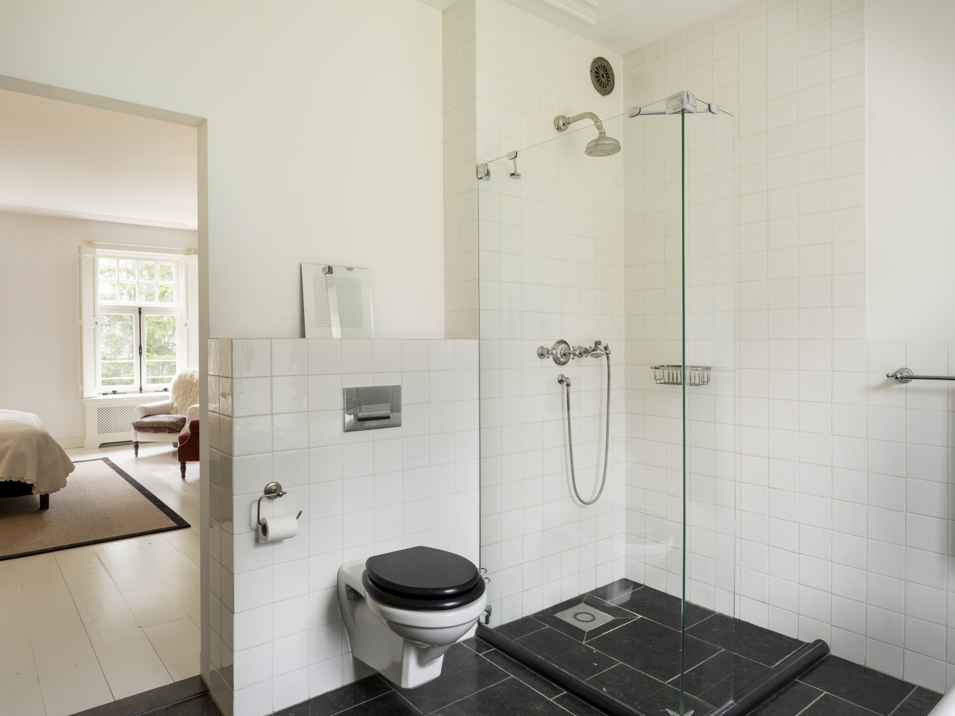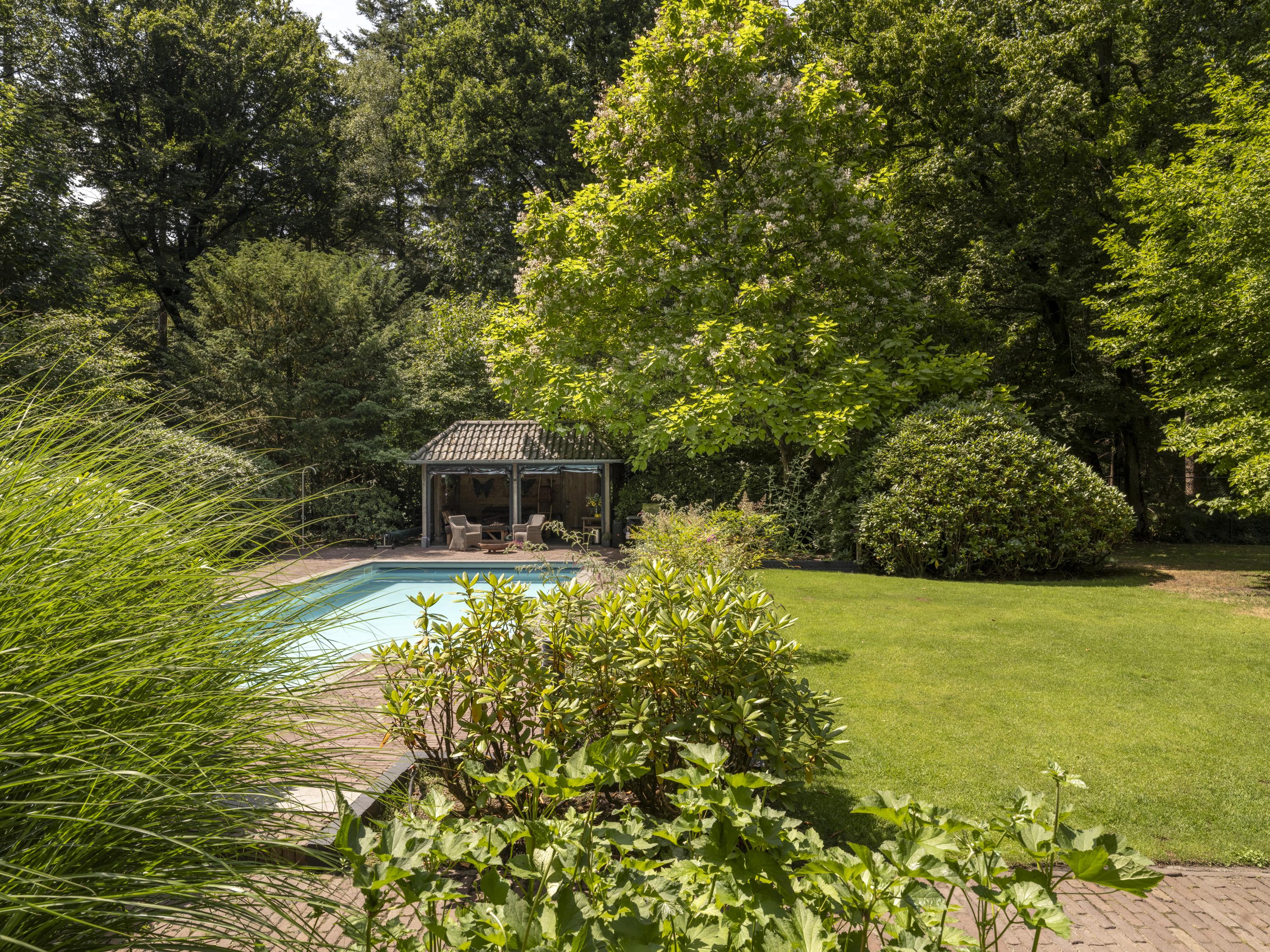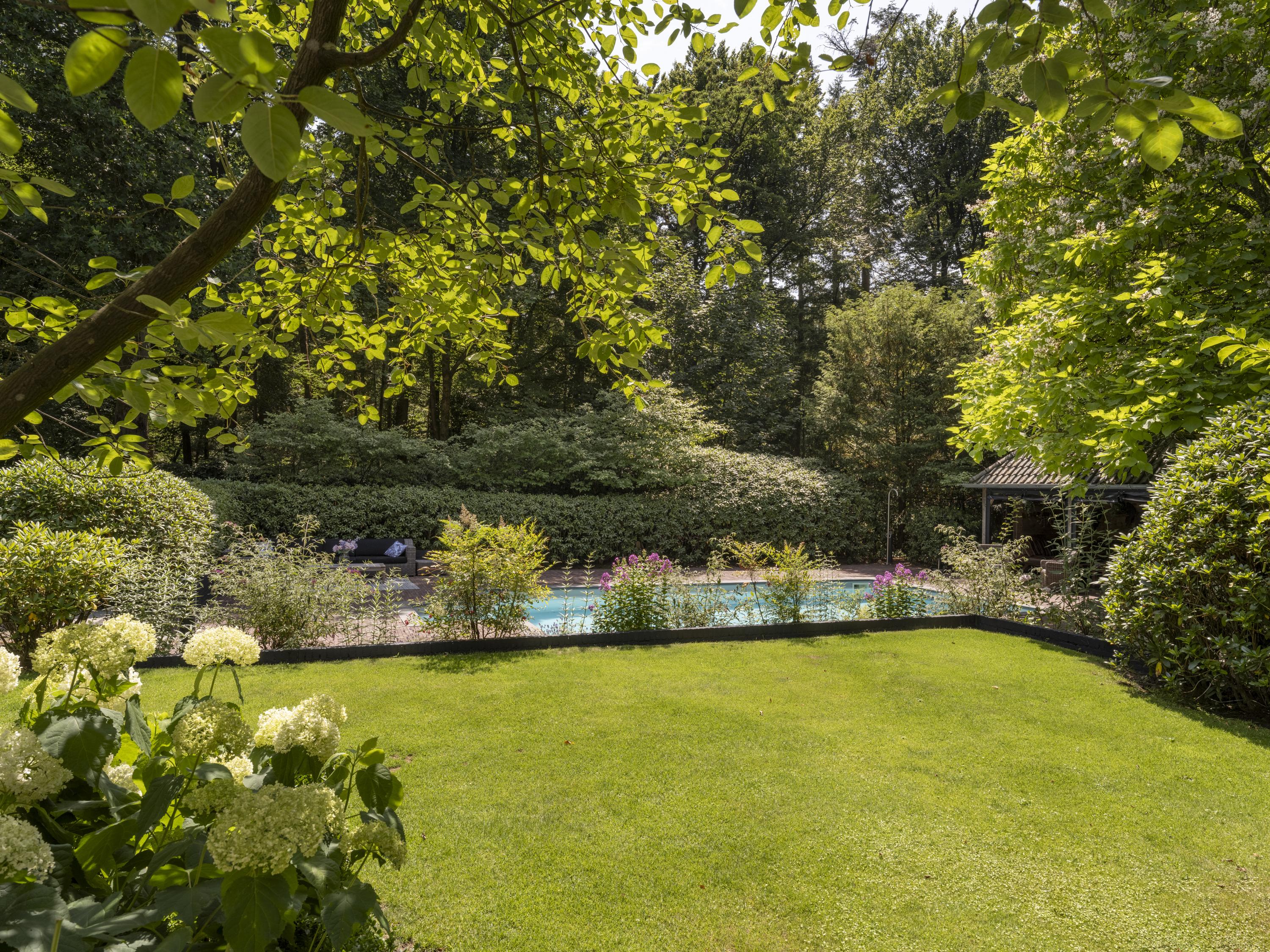 Upstairs, six bedrooms and three refined bathrooms provide both breadth and intimacy, with oak floors, bespoke shutters, and understated period details. The master suite offers a peaceful walk-in wardrobe and a bathroom with garden views. Additional spaces include a guesthouse—formerly the double garage—equipped with kitchenette and bathroom, versatile as a workspace or additional accommodation. The landscaped garden, enveloped by mature trees and flowering borders, features ample lawn, several terraces, and a heated swimming pool discreetly screened by rhododendrons. The pool house includes a sauna, kitchenette, and outdoor shower, supporting the pool's saltwater system.