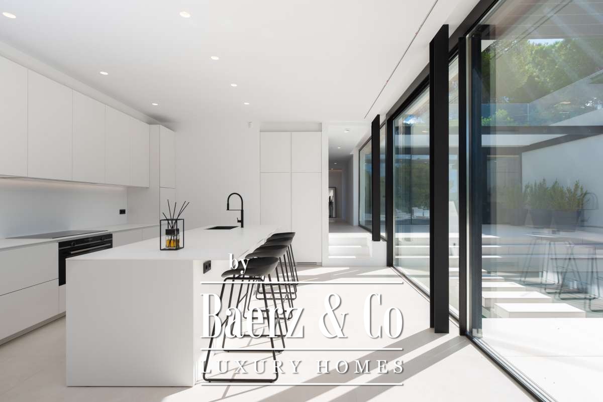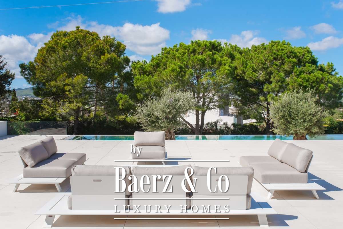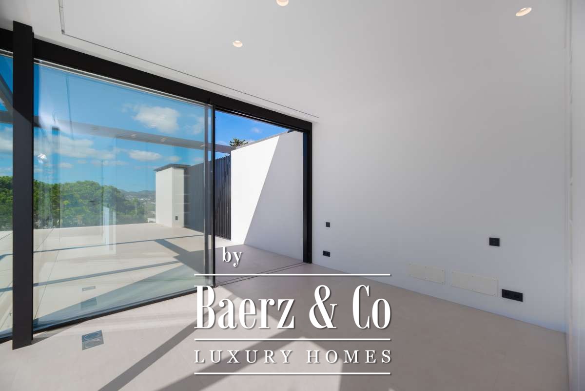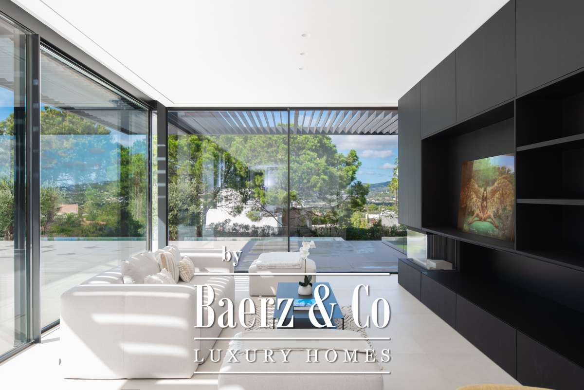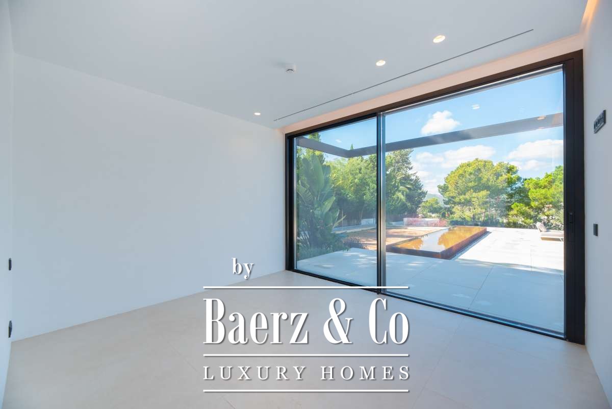 Minimalist villa Can Bessó presents a compelling blend of discreet luxury and refined architectural clarity on the outskirts of Ibiza Town. This newly built residence occupies 600 m² of living space set on a 2,240 m² plot, offering four bedrooms and four bathrooms over two levels. The design anchors itself in minimalism, with white and black contrasts and expansive glass, drawing Mediterranean light into each room. The open-plan living area extends onto generous terraces, framing views of the private garden and surrounding countryside for a seamless indoor-outdoor rhythm.