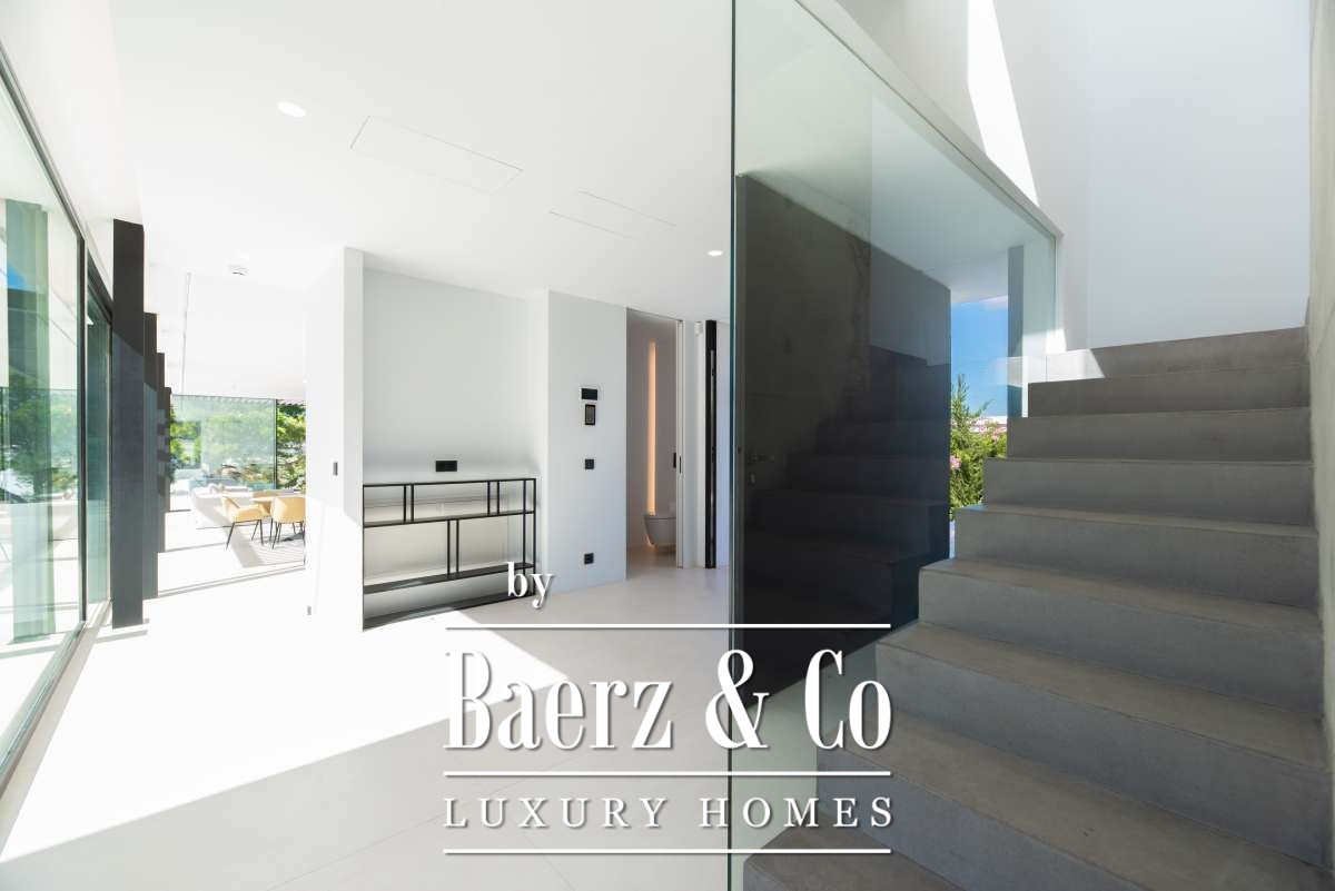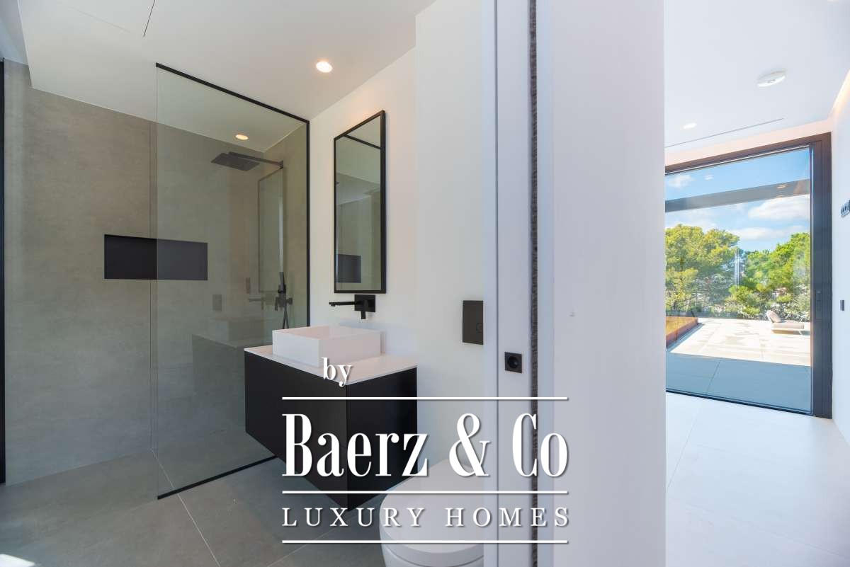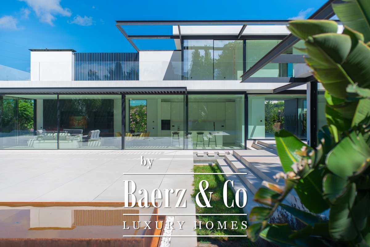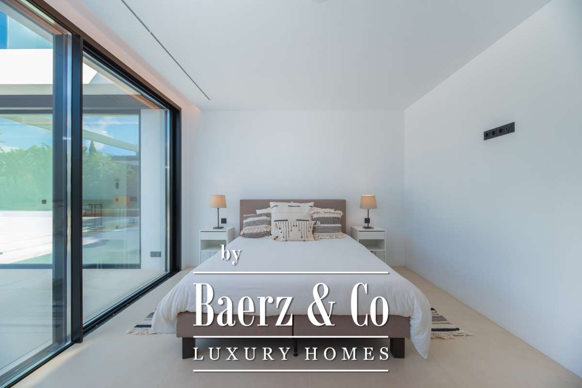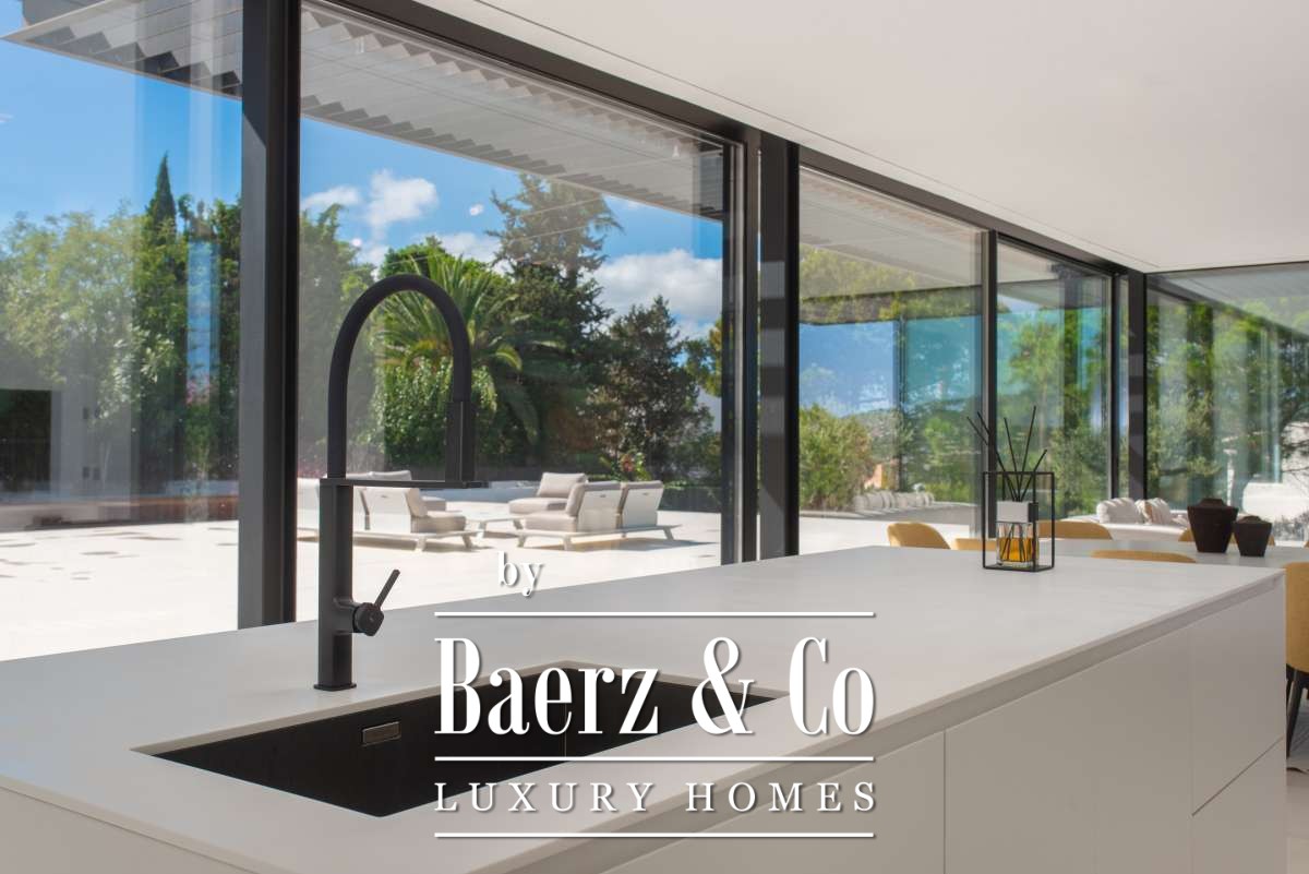 Minimalist villa Can Bessó presents a compelling blend of discreet luxury and refined architectural clarity on the outskirts of Ibiza Town. This newly built residence occupies 600 m² of living space set on a 2,240 m² plot, offering four bedrooms and four bathrooms over two levels. The design anchors itself in minimalism, with white and black contrasts and expansive glass, drawing Mediterranean light into each room. The open-plan living area extends onto generous terraces, framing views of the private garden and surrounding countryside for a seamless indoor-outdoor rhythm.