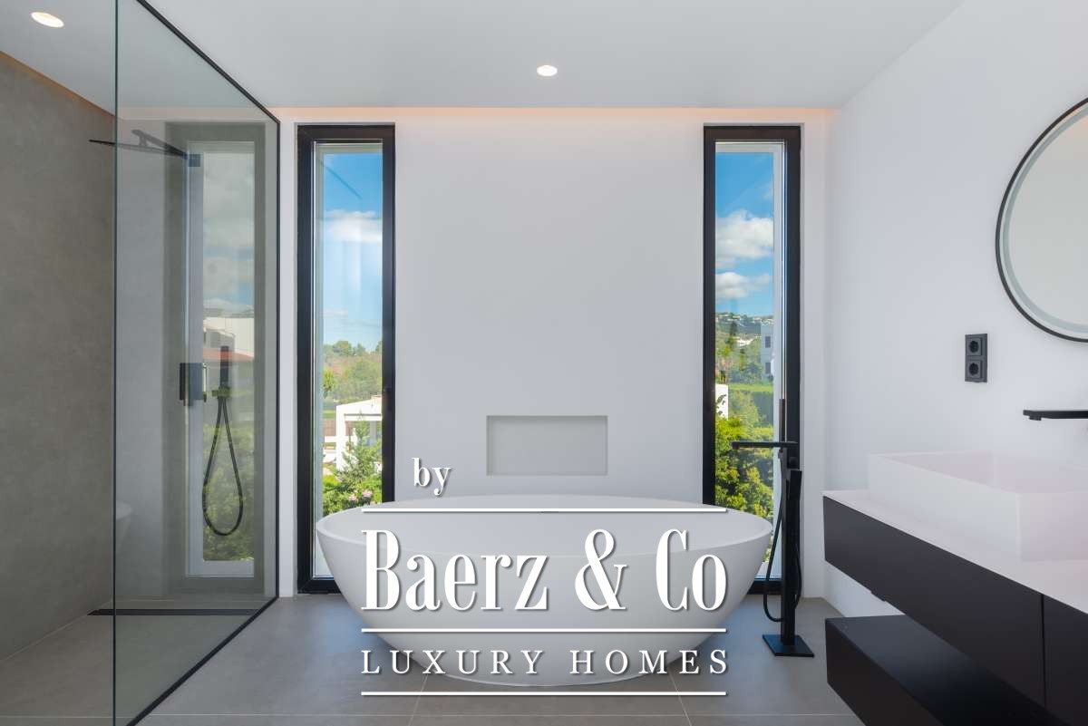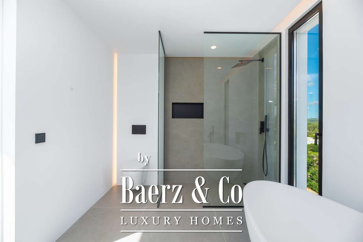 Each bedroom features built-in wardrobes and garden or terrace access, with the master suite enhanced by an en-suite bathroom including a designer bath, his-and-hers sinks, and a rain shower. The villa is thoughtfully equipped with mood lighting, smart temperature systems, and an integrated alarm. Outdoors, a Zen-inspired garden guides you to the entrance, where bonsai trees and a tranquil pond create a serene welcome. The backyard encompasses a sculptural infinity pool, a sun-bathed terrace, and tropical landscaping reminiscent of Bali, all set for privacy and contemplation.
