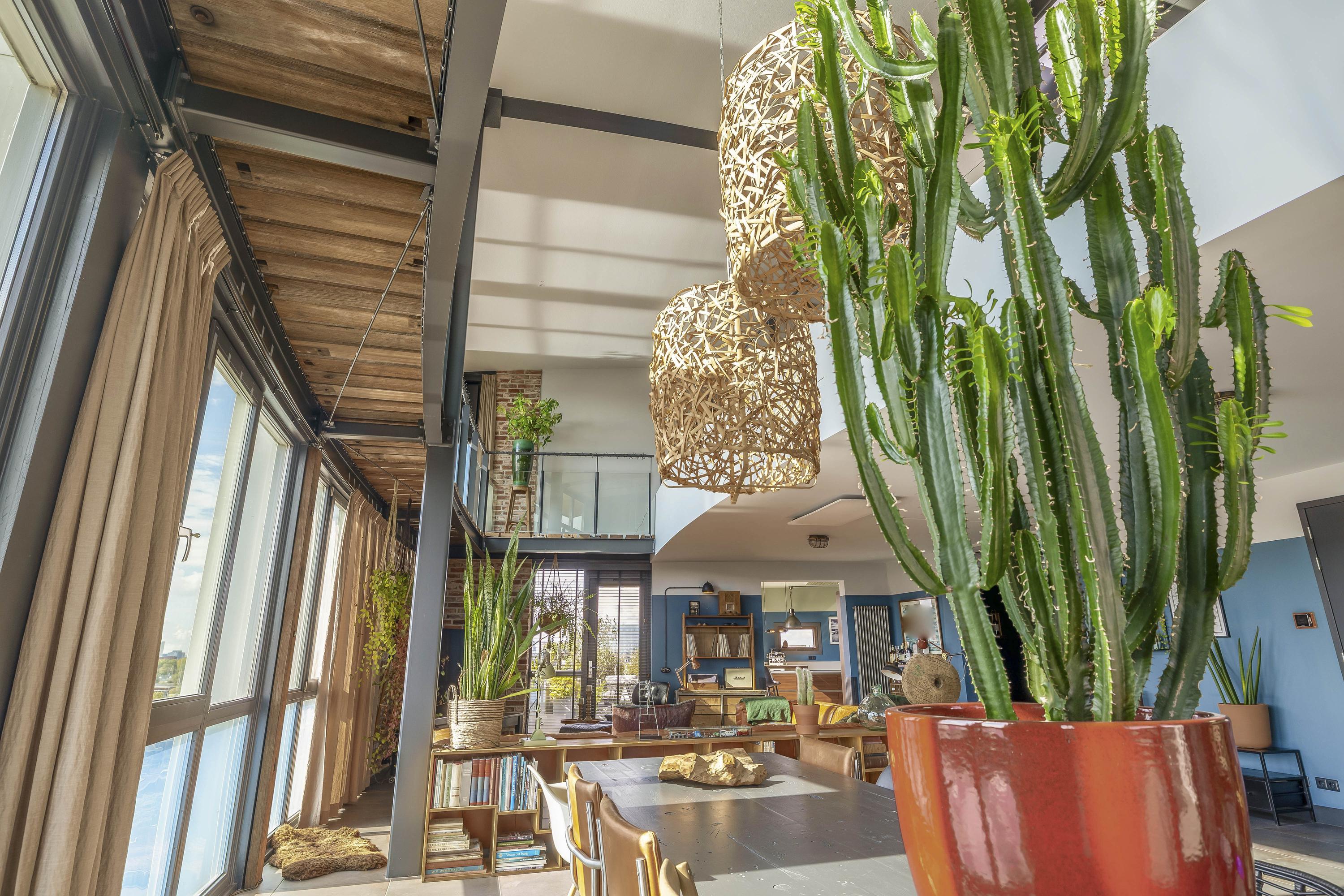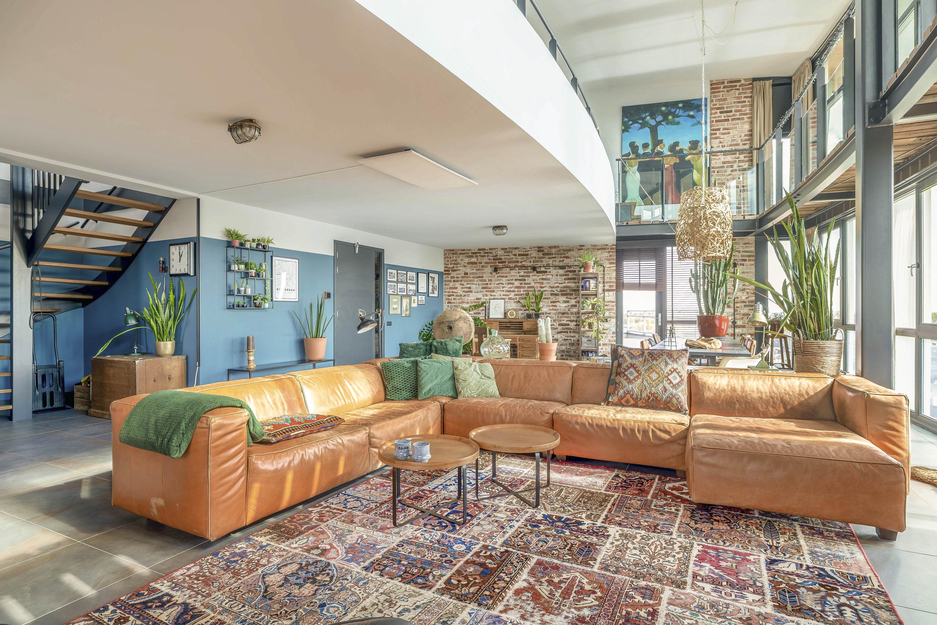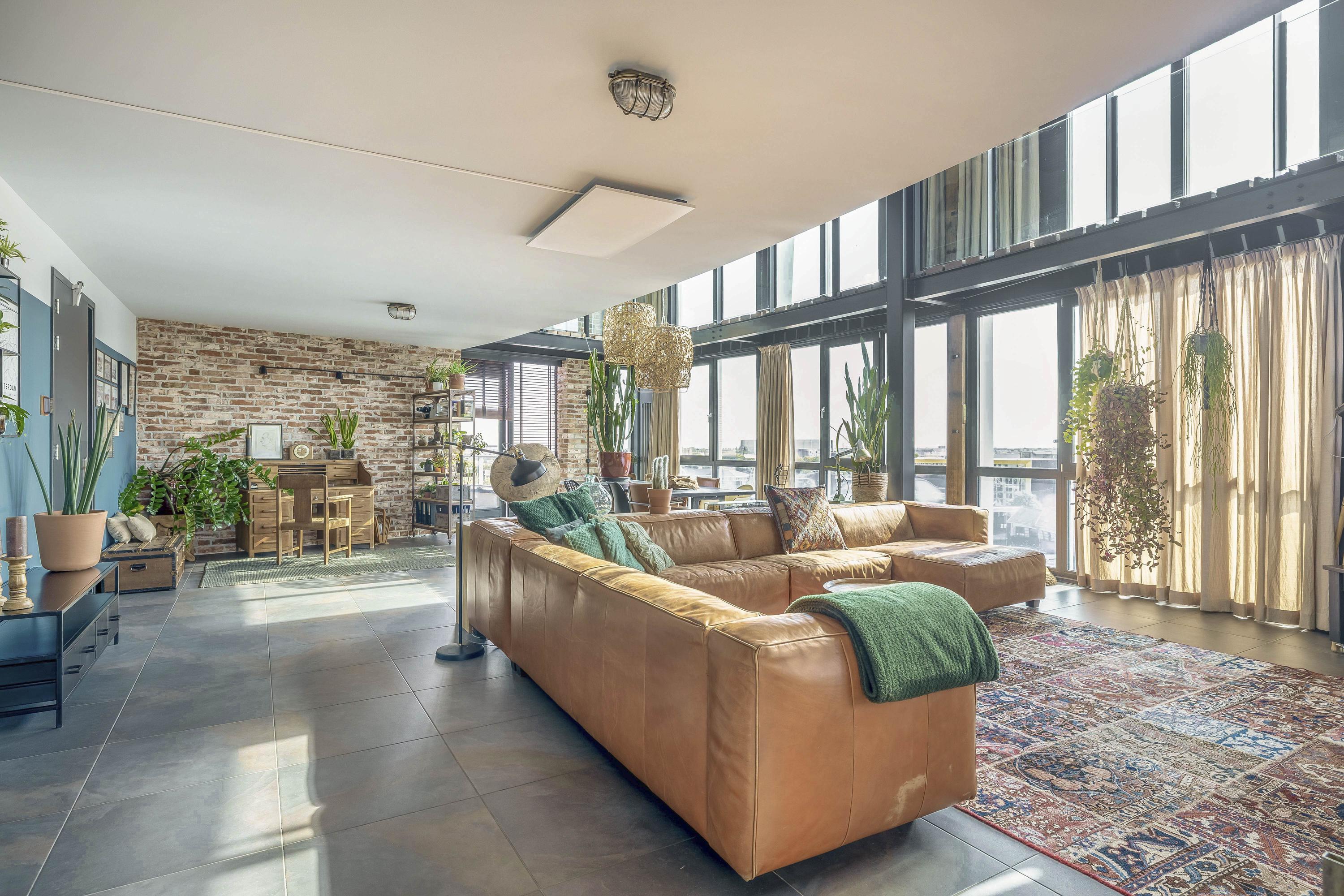 Entrance with wardrobe and guest toilet. The extremely spacious living room (85 m²) boasts incredible natural light thanks to a massive 7-meter-high window and an impressive mezzanine with an industrial-style balustrade. The entire floor is finished with luxurious Italian stone flooring and underfloor heating. On both sides of the living room, you’ll find expansive rooftop terraces, facing southwest and southeast respectively – 98 m² total. Enjoy all-day sun and phenomenal views. The skyline of Rotterdam feels almost within reach.