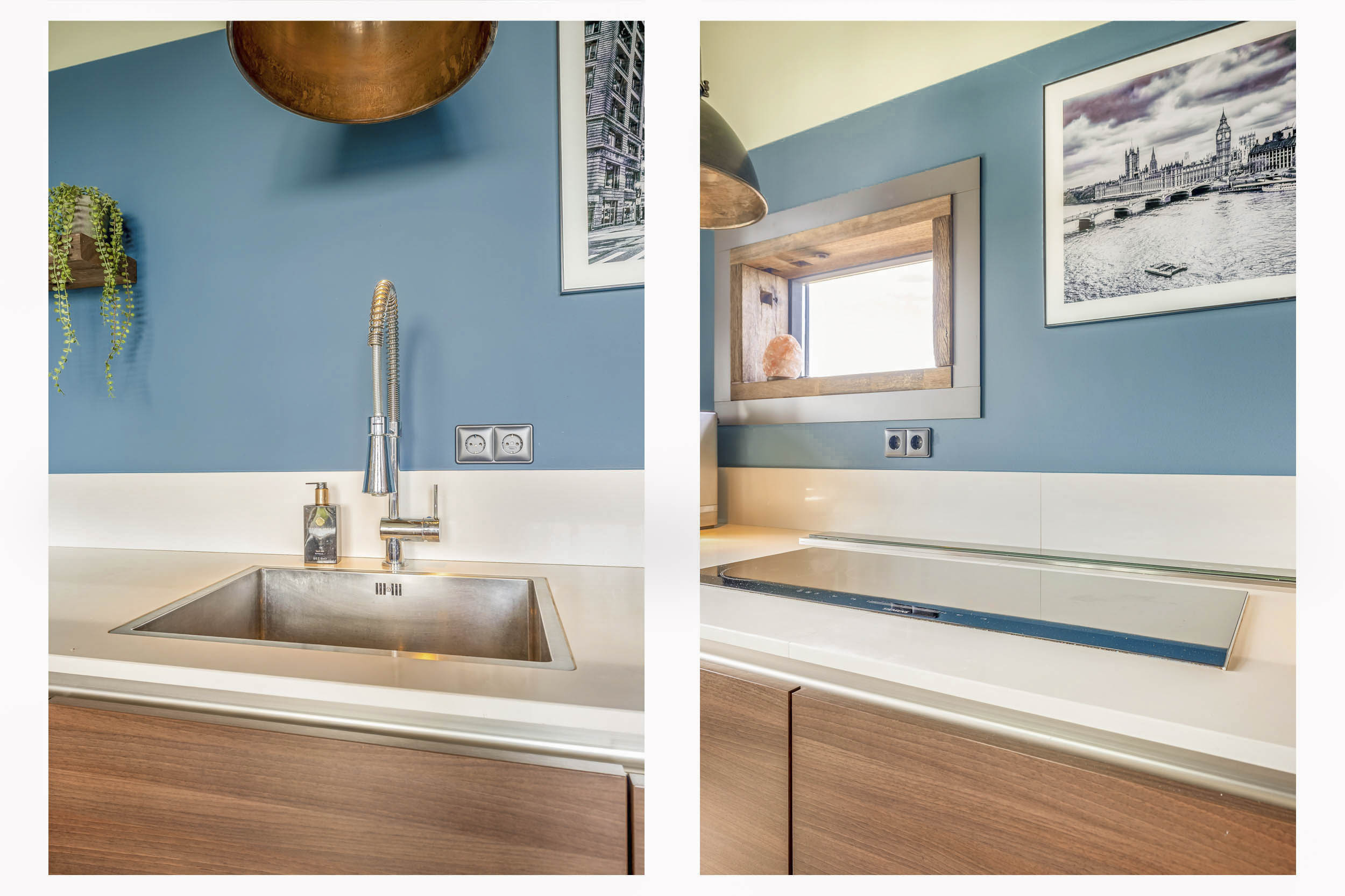 The luxurious semi-open kitchen (14 m²) is laid out in a U-shape, with a composite countertop and high-end (Miele) built-in appliances: induction hob, integrated extractor, two combi-microwaves, dishwasher, fridge, and freezer. A new window adds extra light and views.
