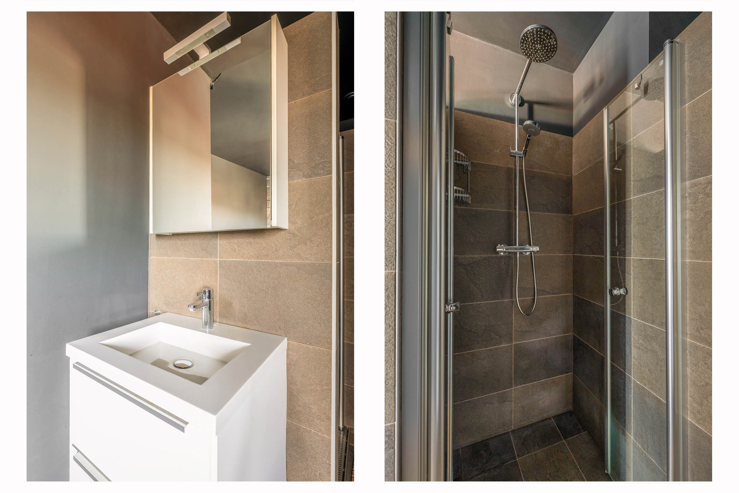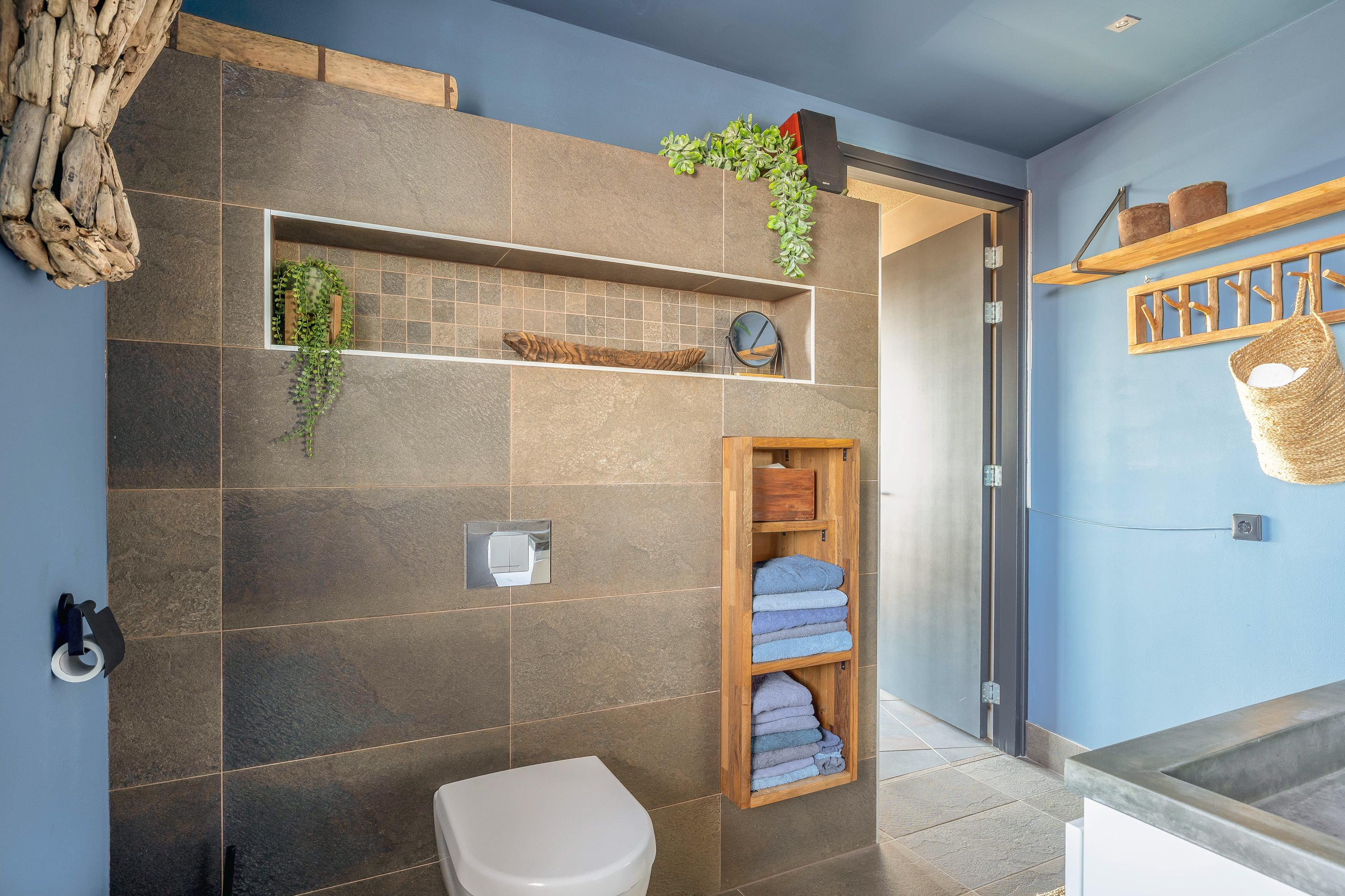 A connecting hallway leads to the second bedroom, also with an en-suite bathroom (walk-in shower, third toilet, sink unit, and designer radiator). Here you’ll also find the second main entrance to the penthouse.