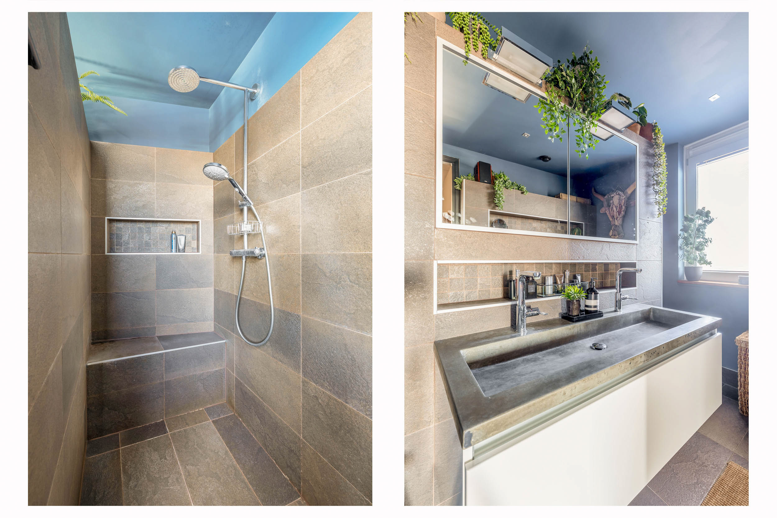 The master bedroom includes a walk-in wardrobe and an en-suite luxury bathroom with a large walk-in shower, stone sink unit, second toilet, and elegant tiles.