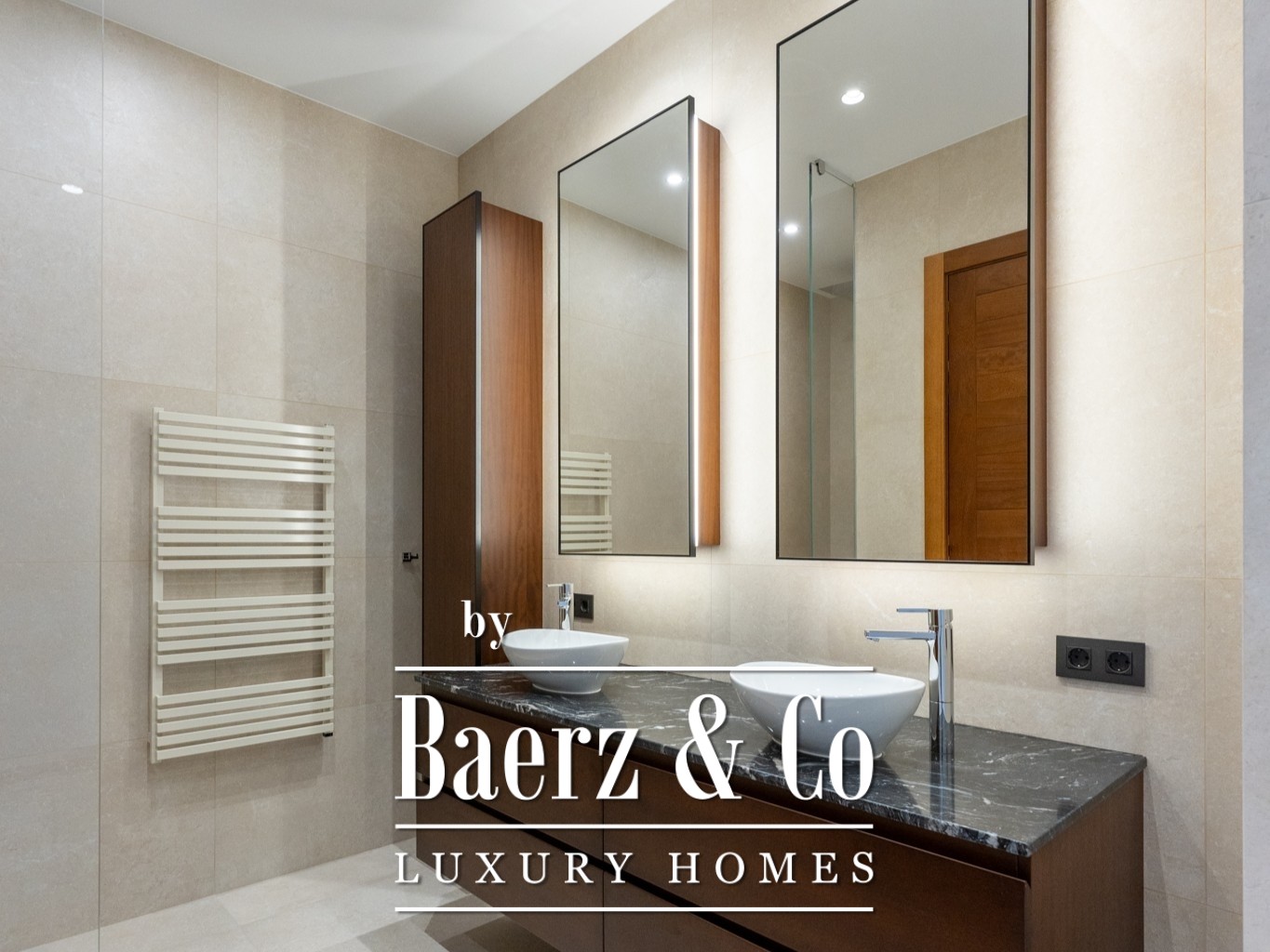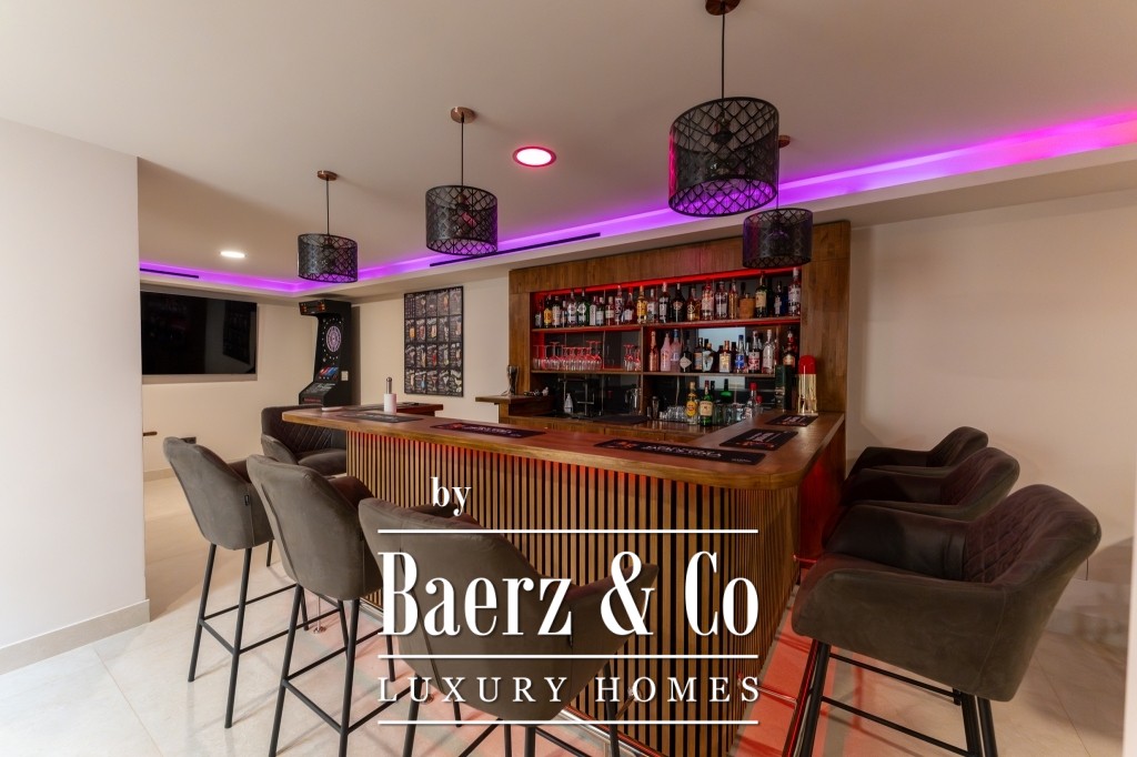 On the ground floor, discover two further en-suite bedrooms, dedicated gym, sauna, laundry, and a heated 13 by 3.7-metre infinity pool, serviced by a 5 kW counter-current system. The first two floors are connected by a lift, ensuring ease of movement.