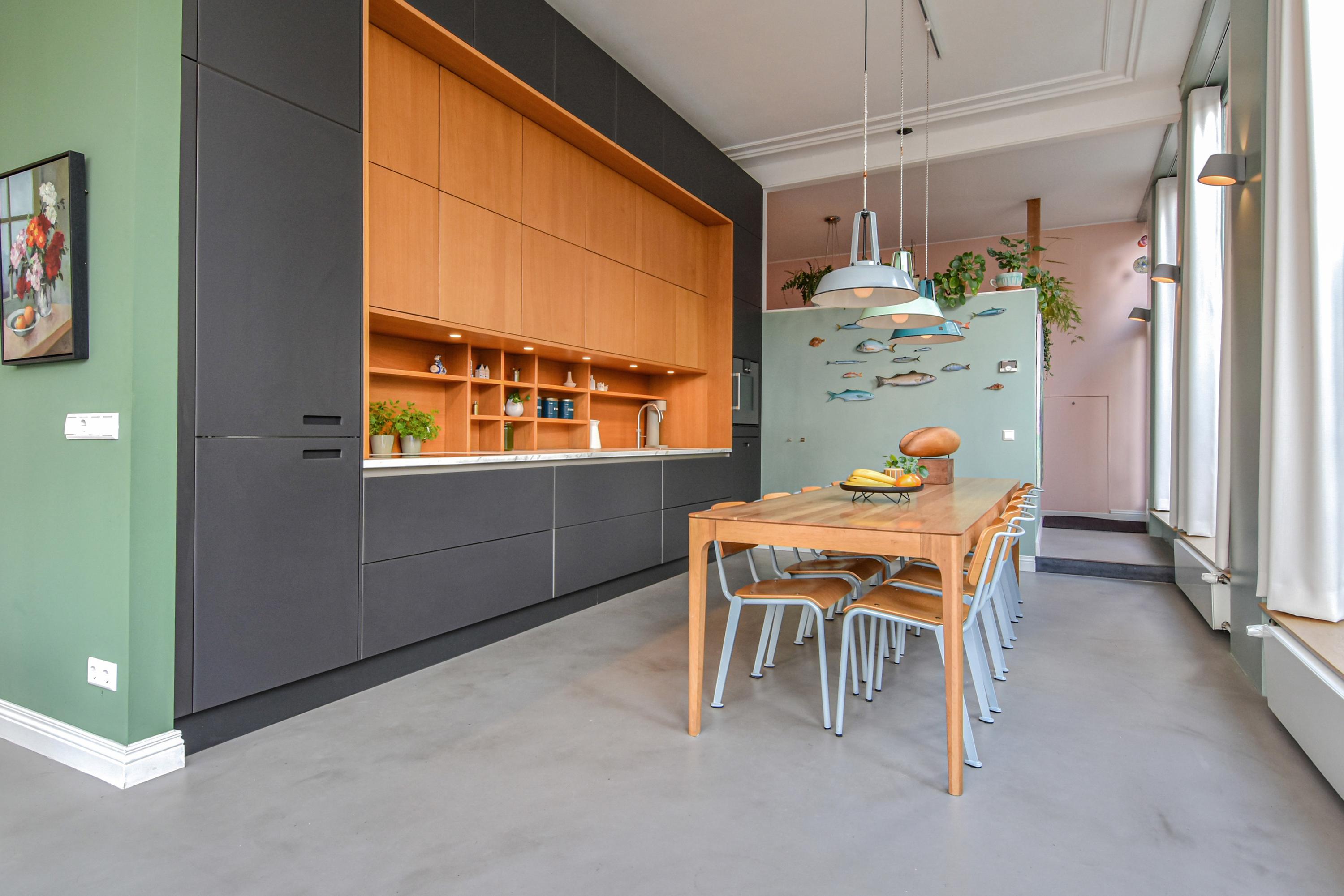 Upon entry, high glass façades and a ceiling soaring to 3.55 meters define the main living kitchen. Preserved stucco moulding and stained-glass windows celebrate architectural provenance. The kitchen, equipped with luxury built-in appliances, is anchored by spaces for dining and entertaining, flanked by two generous living areas. An integrated studio, with a private entrance and underfloor-heated bathroom, adapts easily to a guest suite or workspace. The ground floor includes ample storage and direct access to Broerhuisstraat.
