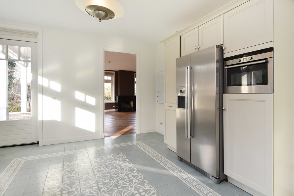 Entrance with wardrobe and meter cupboard. Spacious hallway with access to the study (3.80 x 3.40 m). Guest toilet. Living room with elegant herringbone parquet flooring and fireplace. Multiple French doors provide access to the surrounding garden. Large open-plan Siematic kitchen (4.18 x 5.30 m) equipped with an American-style fridge/freezer, 6-burner gas hob with oven, extractor hood, dishwasher, and a separate combi microwave/oven. Utility room with washing machine and dryer connections. Sunny, generous terrace (6.05 x 6.22 m).