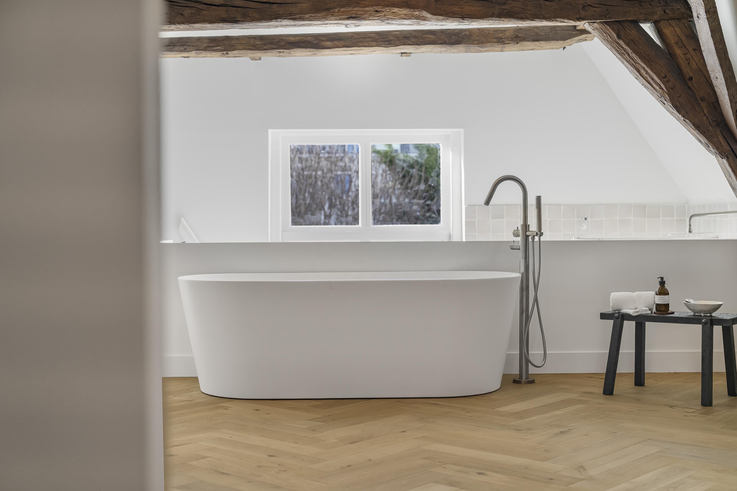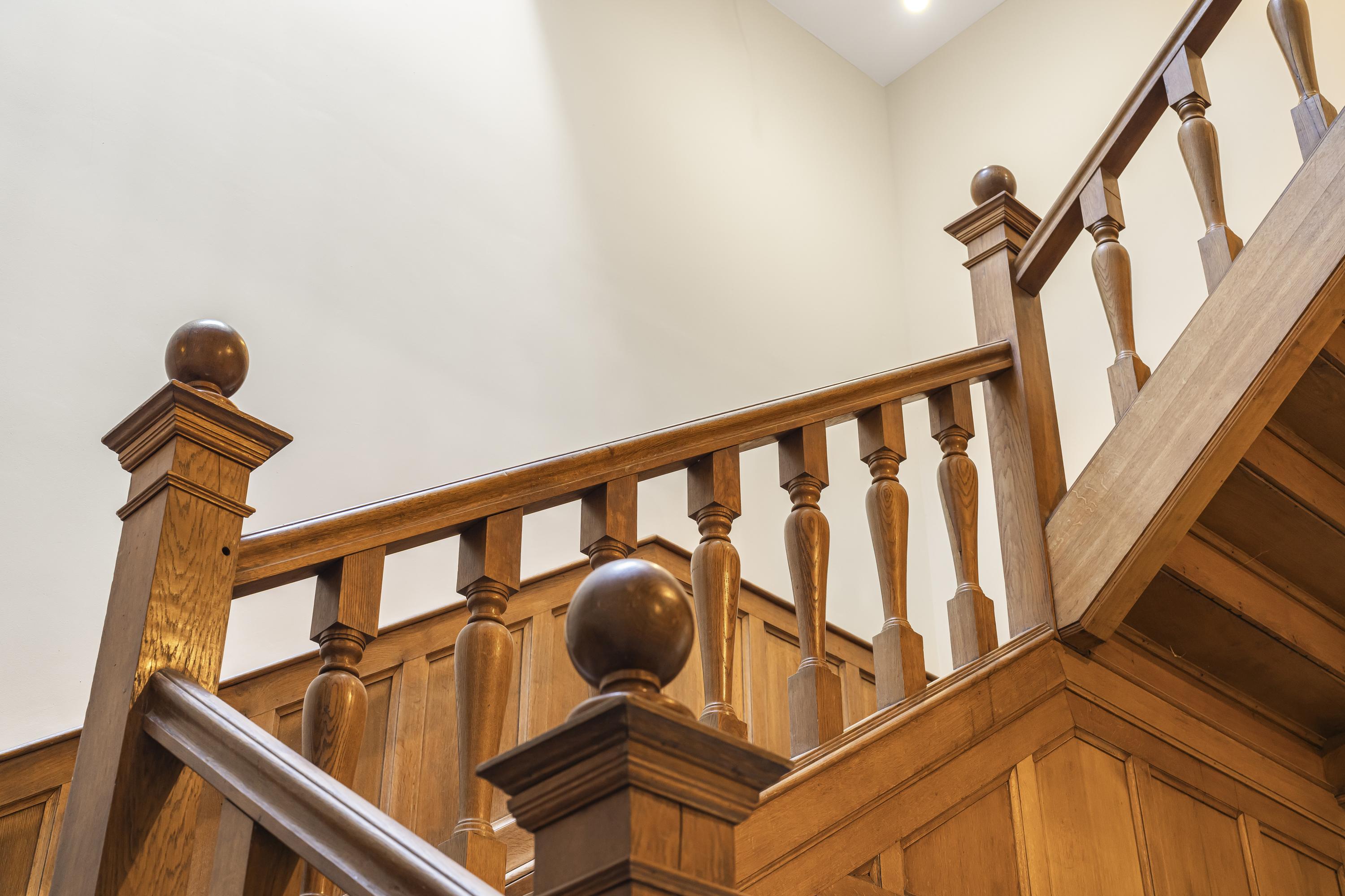 Newly installed herringbone parquet flooring on the ground and upper floors