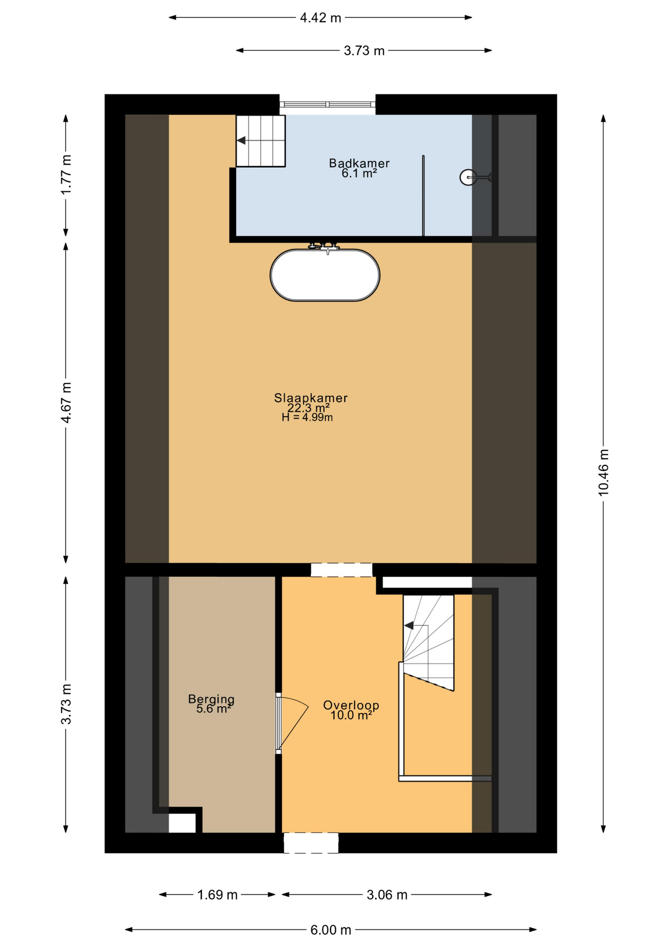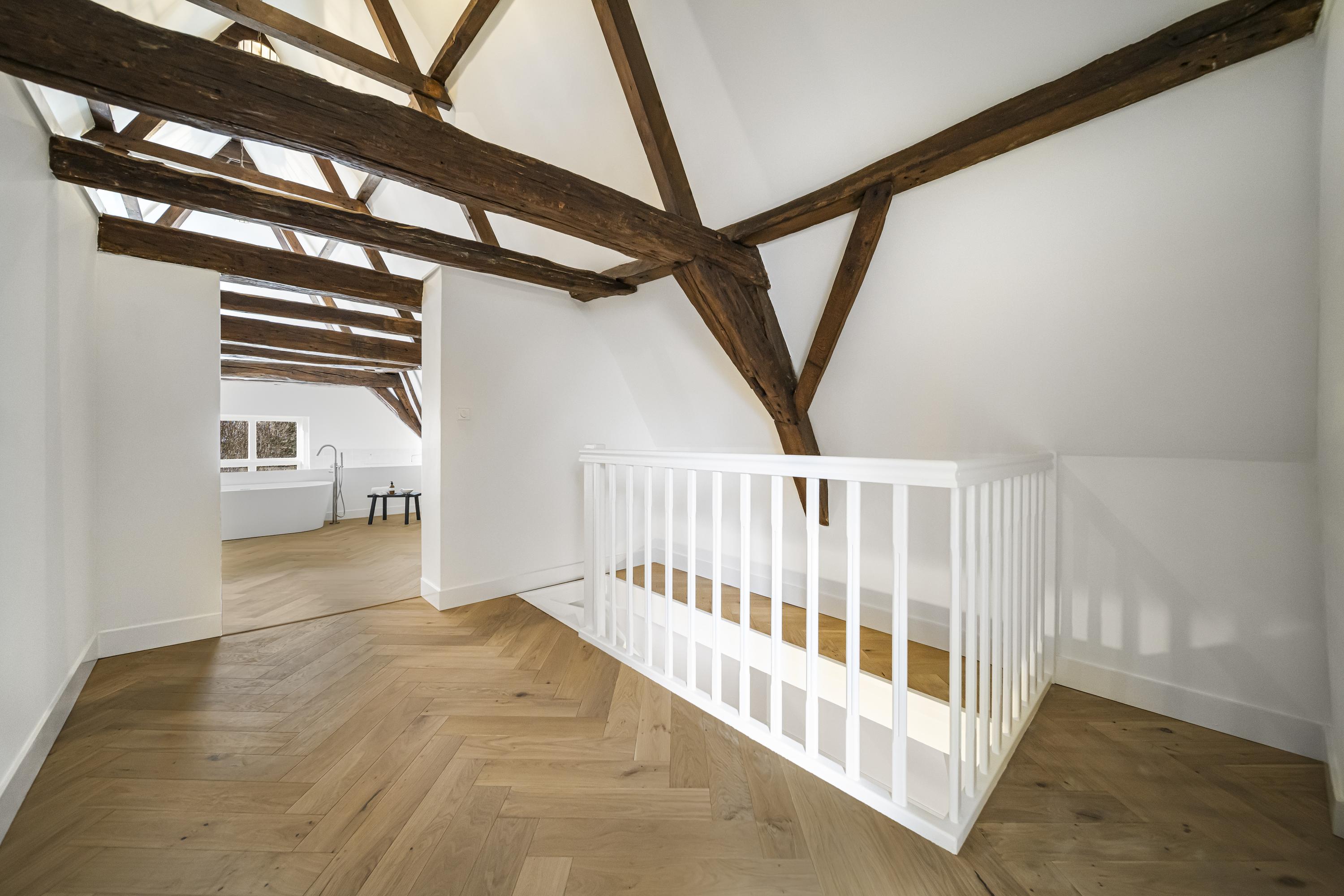 A beautiful floor showcasing the original roof structure. At the front is a bright, multifunctional space. Additionally, there is a large storage room and a toilet. Extra daylight enters through newly installed, high-placed windows above the mezzanine.
