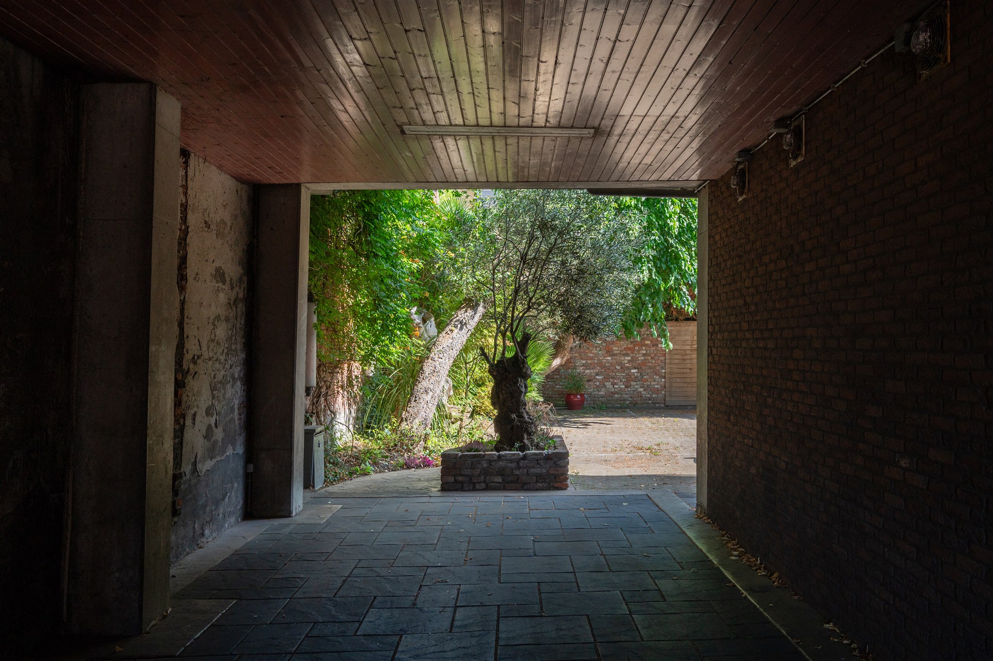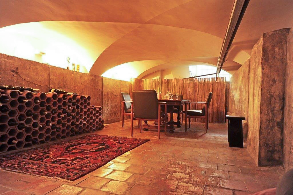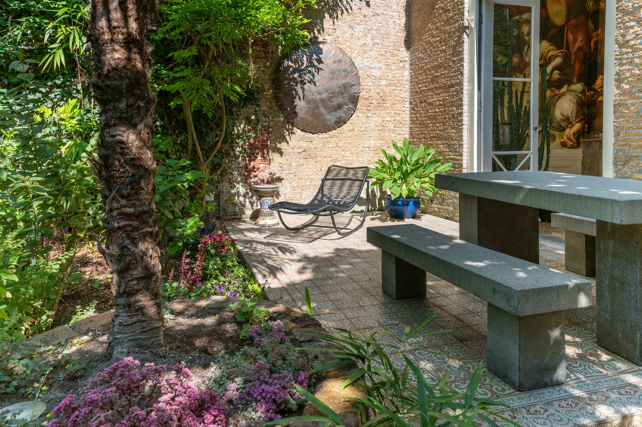 From the hallway, access is provided to the 27 m² vaulted cellar and further on to the garden room, complete with underfloor heating and painterly wall coverings. Adjacent is a small pantry/summer kitchen leading to a covered patio and the tropically landscaped rear garden of approx. 100 m². The garden includes a stone shed and rear access to the courtyard of the neighbouring complex, where three parking spaces are available by right of way.