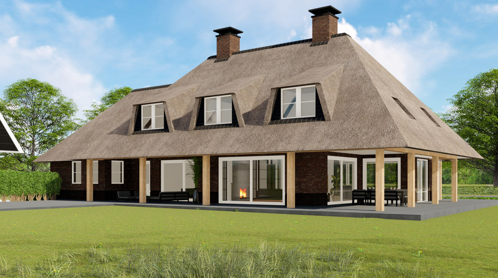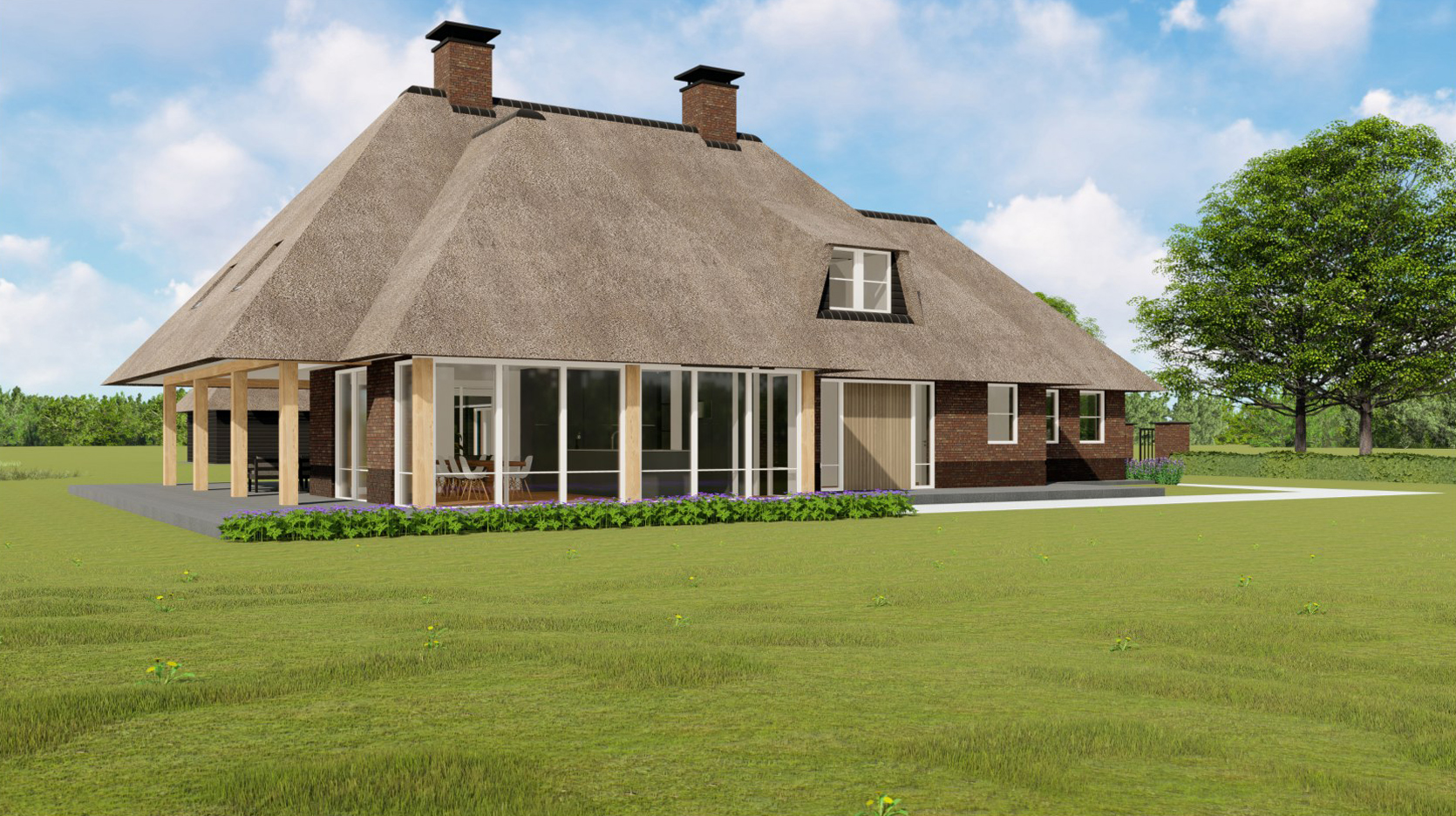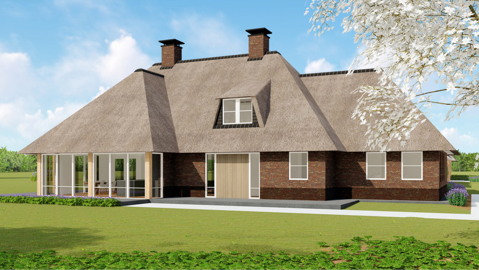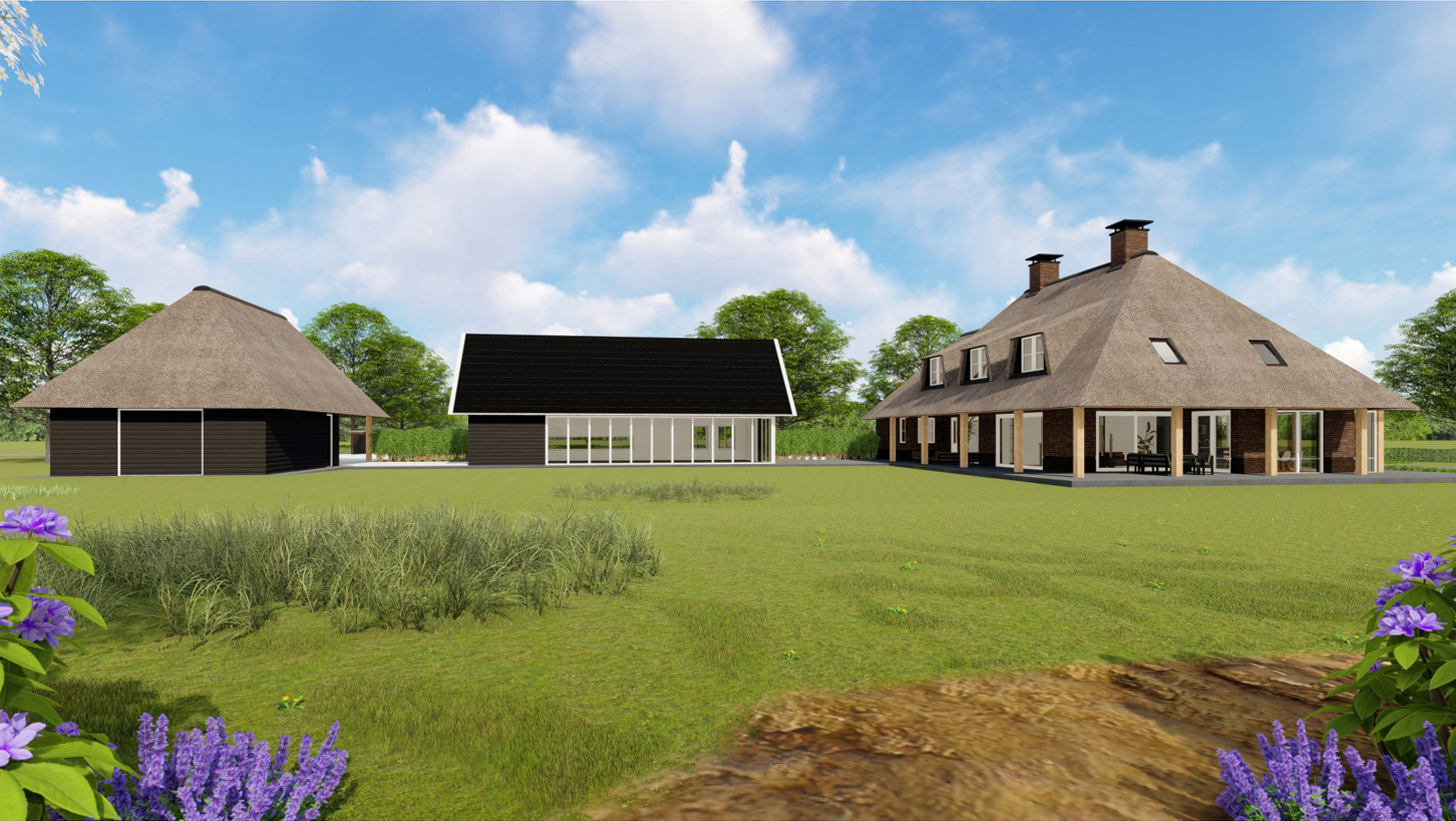 The envisioned residence pairs traditional Drenthe farmhouse forms with today’s highest standards: thatched roofs, oak beams, brick chimneys, and generous glazing to frame panoramic woodland views. The horseshoe layout ensures privacy, with covered terraces, wine and dine areas, and seamless transitions between indoor and outdoor living. The approved design includes 296m² of living space with five bedrooms, two bathrooms, and exceptional light throughout. Facilities such as mechanical ventilation, solar panels, sauna, jacuzzi, stoomcabine, swimming pool, and underfloor heating reflect a commitment to comfort and sustainability. The property also features a wooden pool house of 15 by 7 metres equipped for wellness, and a double garage with attic.
