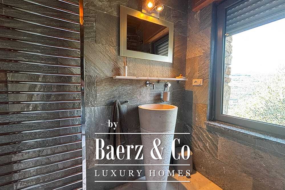 The 11 by 4 metre swimming pool, fully renovated in 2022, lies next to an expansive terrace, offering views over the valley and out to the sea. Multiple terraces, outdoor kitchens, and shaded pergolas invite relaxed dining through all seasons. Paths around the house are lined with olive groves, with hours of sun ensuring exceptional harvests.