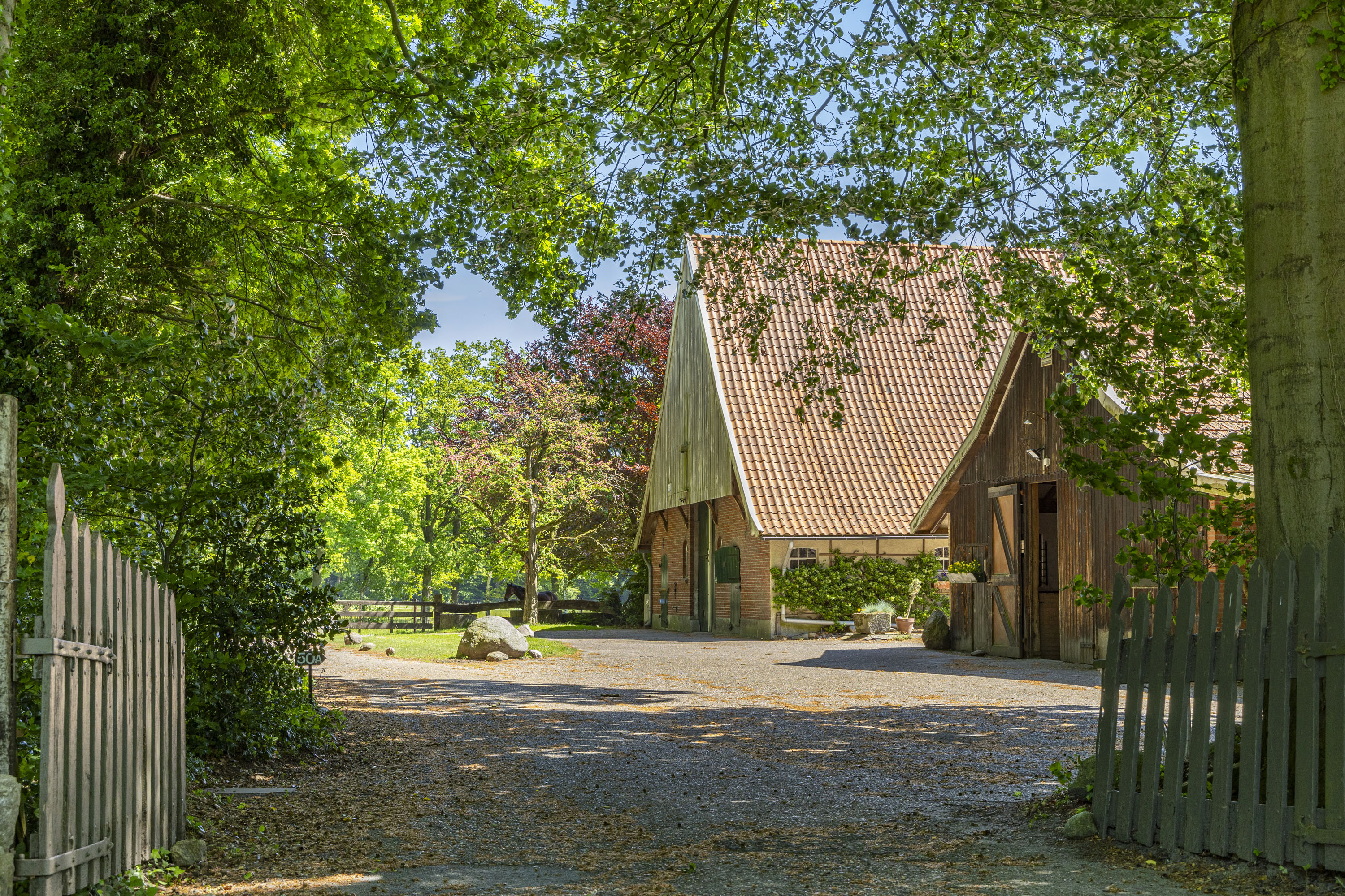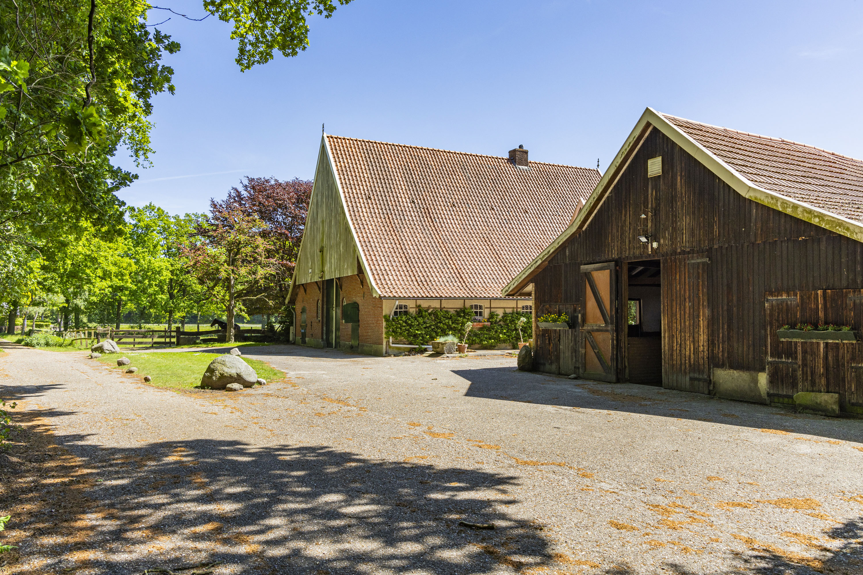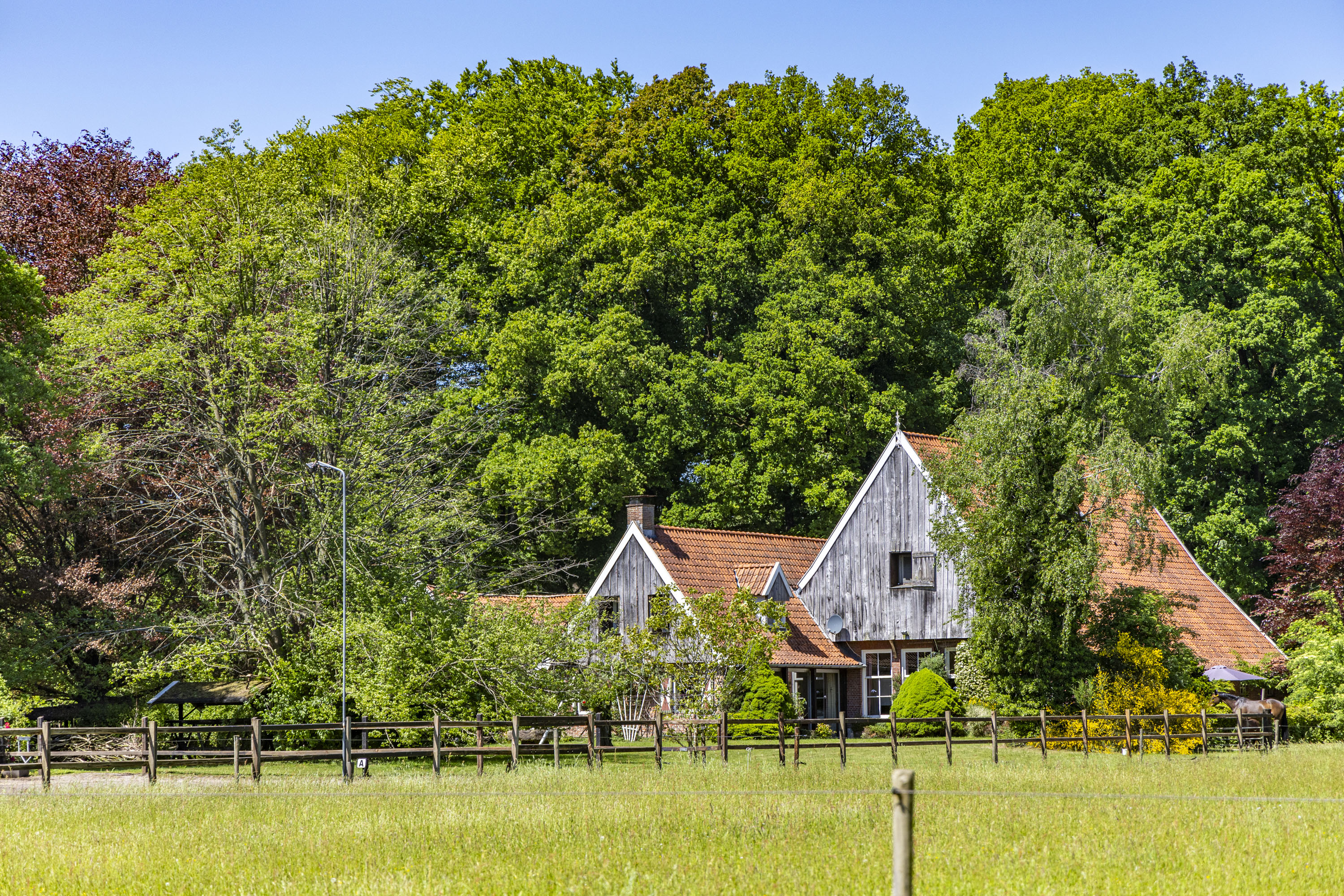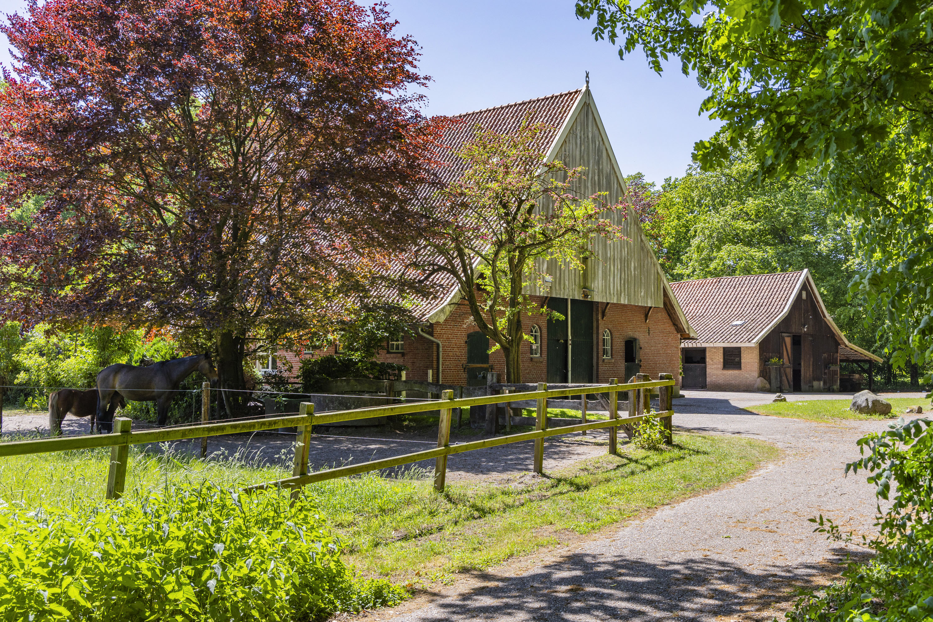 Integral outbuildings include a Saxon-style barn of 225 m², a stable block with five horse stalls, and further facilities intended for equestrian and agricultural use. At the forest’s edge, a modest summer cottage offers space for guests, complementing ancillary structures such as the old sheepfold, chicken coop and storage shed—a quiet tribute to Twente farmstead traditions.
