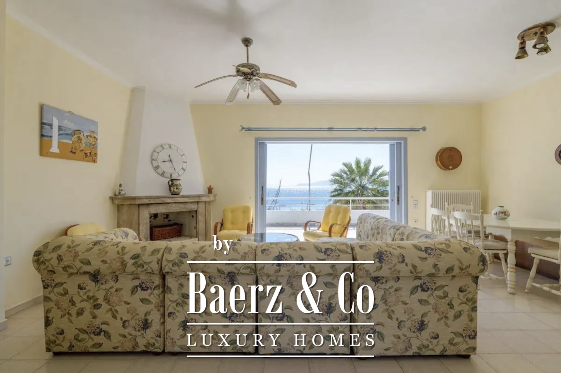 This seafront villa Eretria stands just forty meters from the pristine sandy beach, offering uninterrupted sea views and absolute privacy within one of Eretria’s most desirable coastal enclaves. Set on a generous 6,000 m² plot and encompassing a total of 250 m², the villa is structured across two levels, each with their own independent entrances, allowing for flexible living and guest accommodation.