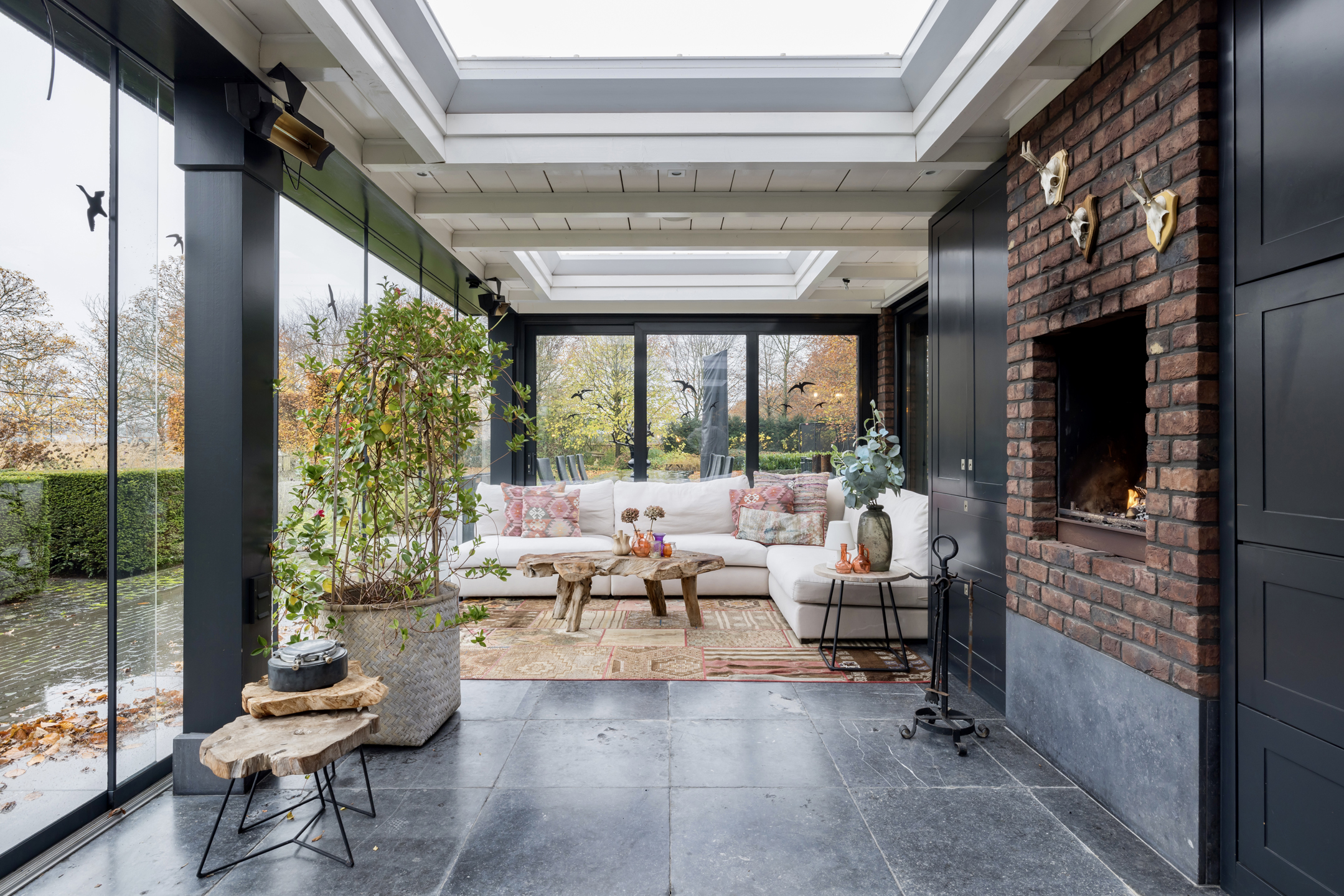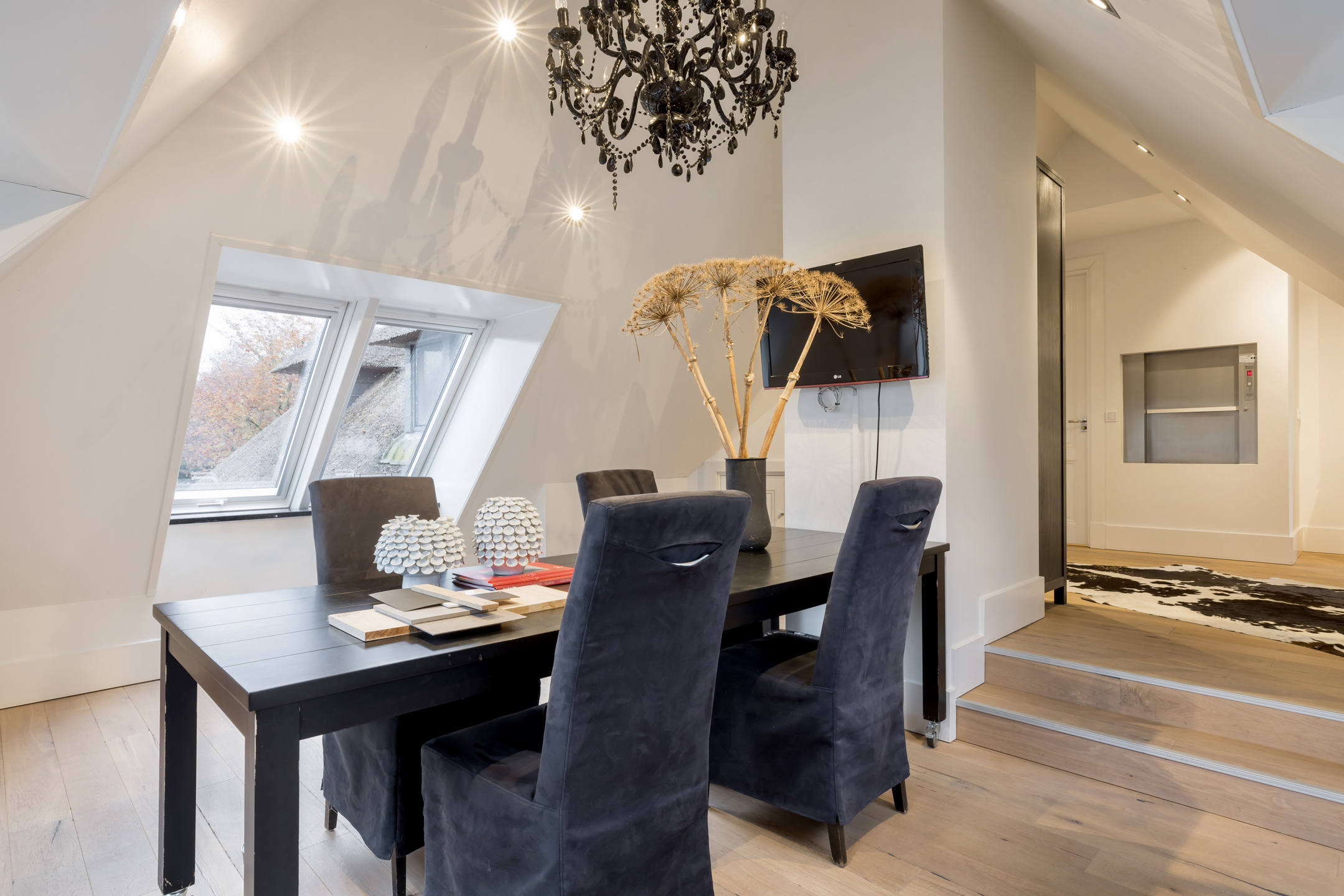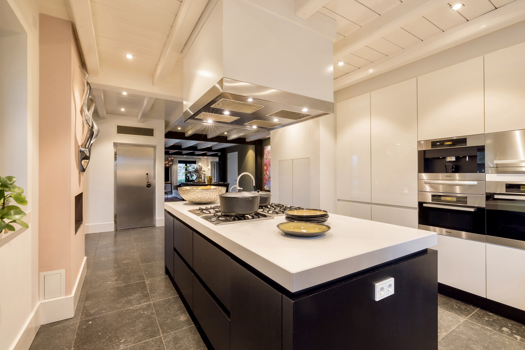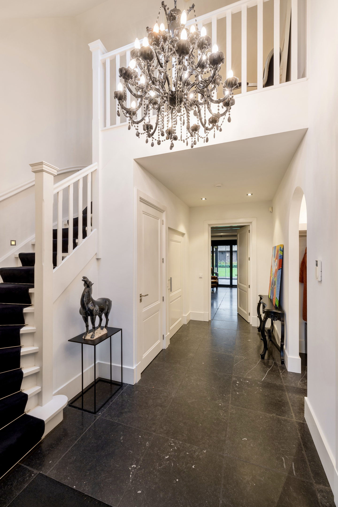 Via de dubbele voordeur bereik je de ruime hal met vaste trap naar boven, toilet, garderobe en deuren naar de kelder, de personenlift en de living. De living is sfeervol, chique en rustgevend met doorkijk naar de prachtige tuin en de schitterende haardpartij. Met rechts het kantoor middels en-suite deuren bereikbaar. Ga je naar links dan bereik je de open keuken met hier veel werkblad, opbergruimte, een kookeiland en alle denkbare keukenapparatuur die de echte liefhebber van de kookkunst zich maar kan wensen. De volgende apparatuur is hier aanwezig: stoomoven, oven, combi-oven, warmhoudlade, 6-pits gasfornuis, 2 x vaatwasser en een quooker. Wat het nog meer bijzonder maakt dat in de keuken een kleine goederen lift aanwezig is om zowel de kelder als 1ste verdieping van eten en dranken te voorzien. Een koelcel i.p.v. een koelkast ook vrij uniek om je eigen koelkast in te lopen. Aan de achtertuin zijde is direct achter de keuken een fantastische tuinkamer gesitueerd die als eetkamer dienst doet. Uiteraard met overal glas en uitzicht op tuin en landerijen. Pal naast de tuinkamer is een serre aanwezig met een heerlijke buiten houthaard. Deze ruimte kun je volledig openzetten via schuifdeuren zodat je de prachtige tuin naar binnen kunt halen. Last but not least, is dit tophuis ook nog eens levensloop bestendig. Aan de linker voorzijde van de woning is de Masterbedroom gesitueerd, met ruime badkamer en walking-closet. De volledige begane grond heeft een Belgisch natuurstenen vloer met vloerverwarming en koeling maar kan ook verwarmd en gekoeld worden met een airco.