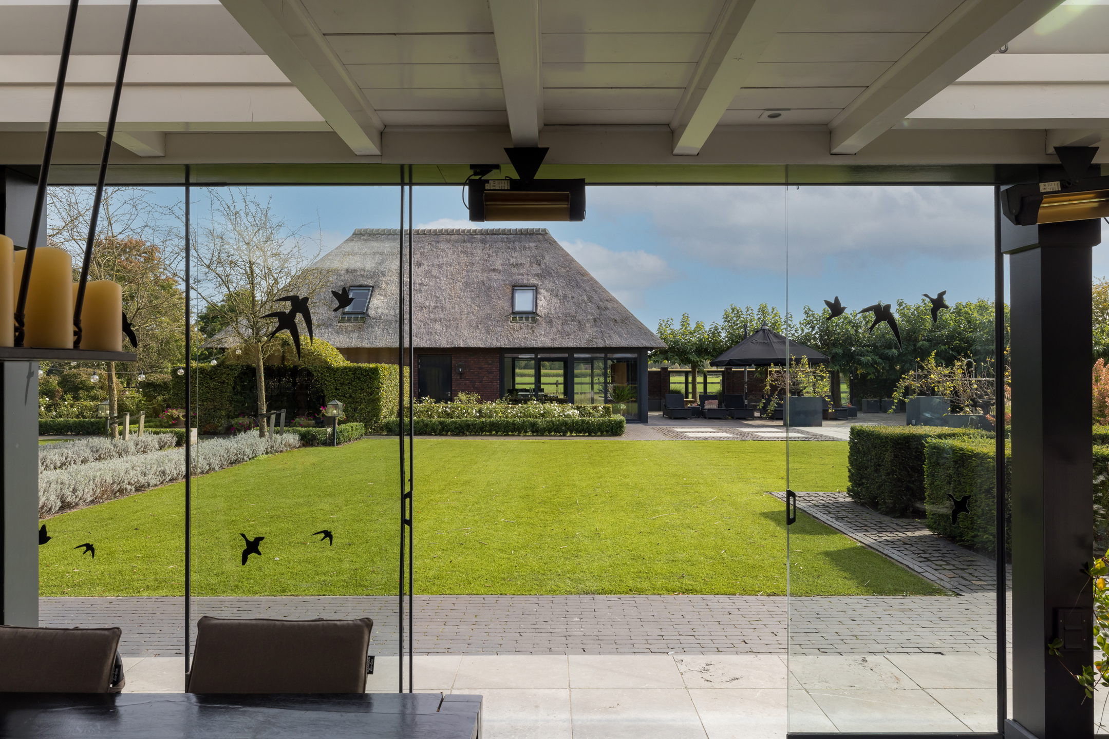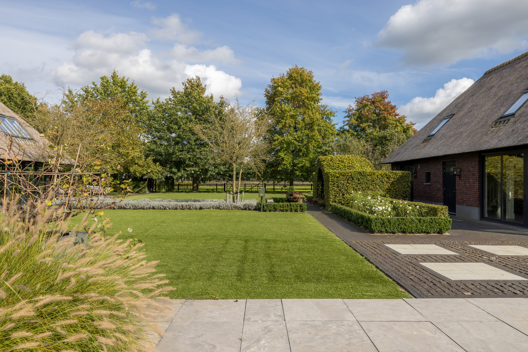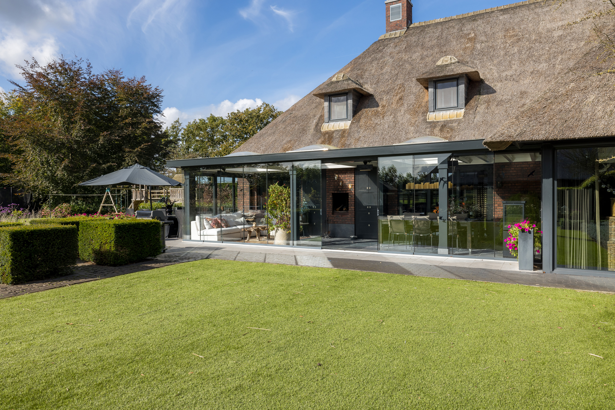 Een prachtig aangelegde voortuin met aan 2 zijdes ruime parkeermogelijkheden. De achtertuin is riant en onderhoudsvriendelijk. Met een uitzicht op zowel in de verte het bos, weiland, het guesthouse, het buiten zwembad en de prachtig aangelegde tuin. Het zwembad is volledig afsluitbaar, maar kan uiteraard ook volledig worden geopend door middel van een schuifkoepel systeem. De verwarming van het zwembad gaat via een hybride warmtepomp. Het gazon is enkele jaren geleden vervangen door kunstgras, wat er eerlijk gezegd wel heel erg goed uitziet en het wel heel onderhoudsvriendelijk maakt. Het rechterdeel van de achtertuin is ingericht als speelruimte voor de kinderen. Achter het guesthouse en links van de woning is het perceel nu ingericht als grasland.