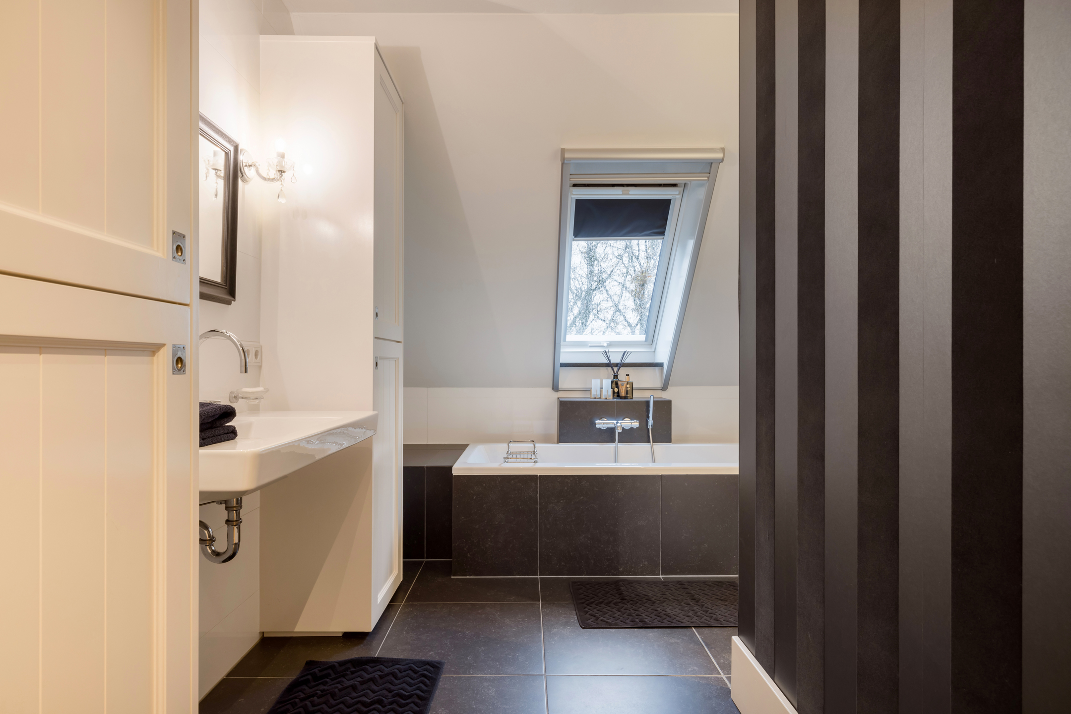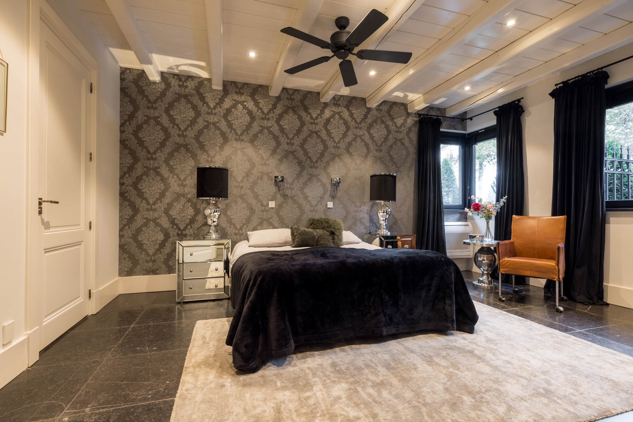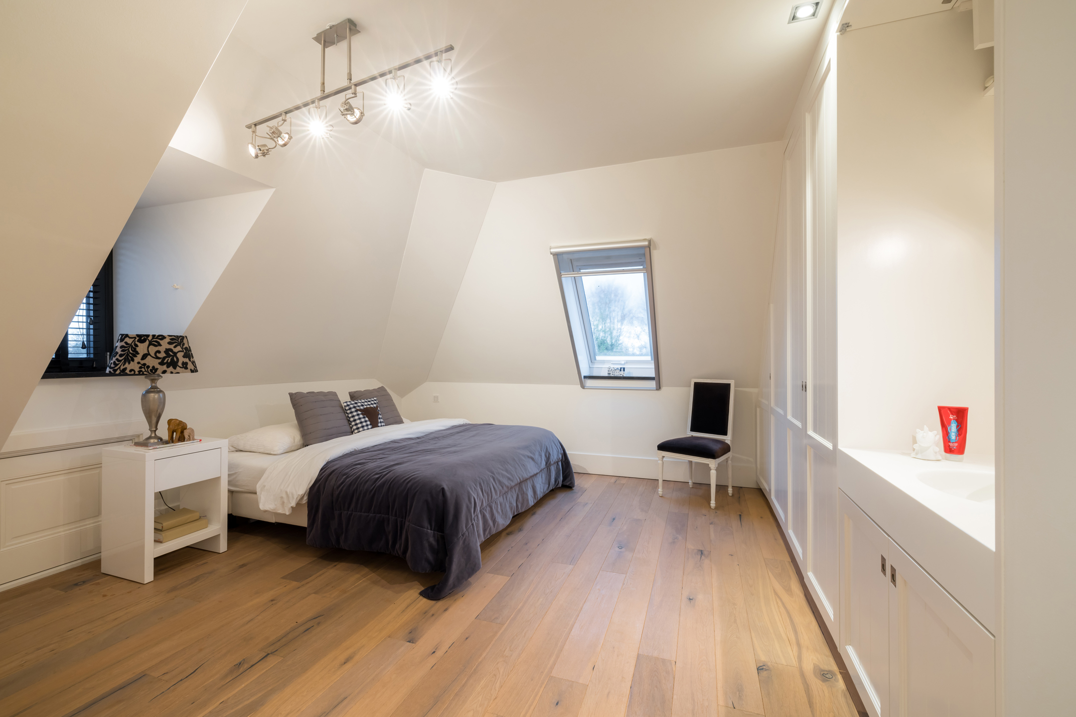 Bereikbaar via een vaste trap als een personen lift vanuit de hal. Boven aangekomen, is er een vide met ruime overloop met hier 5 slaapkamers en 2 badkamers. De hele etage is voorzien van een prachtige eikenhouten plankenvloer. De badkamers hebben een keramische tegelvloer. Alle slaapkamers zijn ruim, hebben dakkapellen en dus voldoende daglicht met overal uitzicht op de tuin en de landelijke omgeving. Alle slaapkamers zijn ruim, hebben dakkapellen en dus voldoende daglicht met overal uitzicht op de tuin en de landelijke omgeving. Het afwerkingsniveau is ook hier onberispelijk en je waant je hier in een 5 sterren hotel. Een van de 5 slaapkamers (Masterbedroom) is nog veel ruimer en doet momenteel dienst als kantoorruimte, werkelijk schitterend. Alle slaapkamers zijn voorzien van een airconditioning. Een grote badkamer met dubbele wastafel, bad en douche. De 2e badkamer is van kleiner formaat en voorzien van een wastafel en douche. Het toilet is separaat.