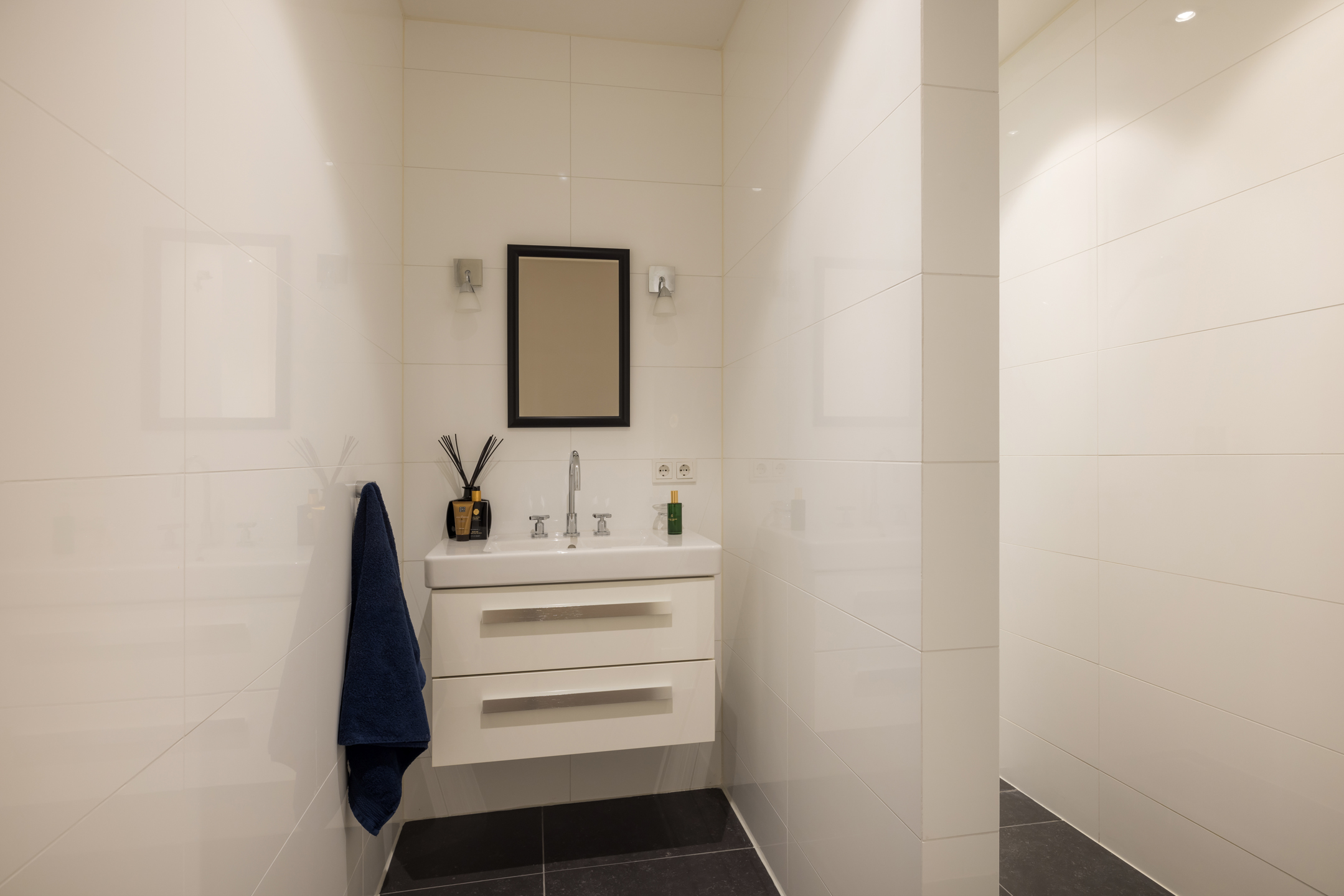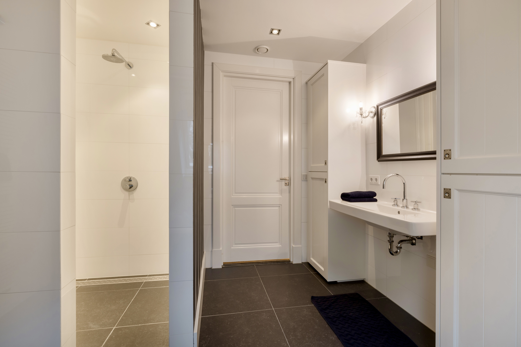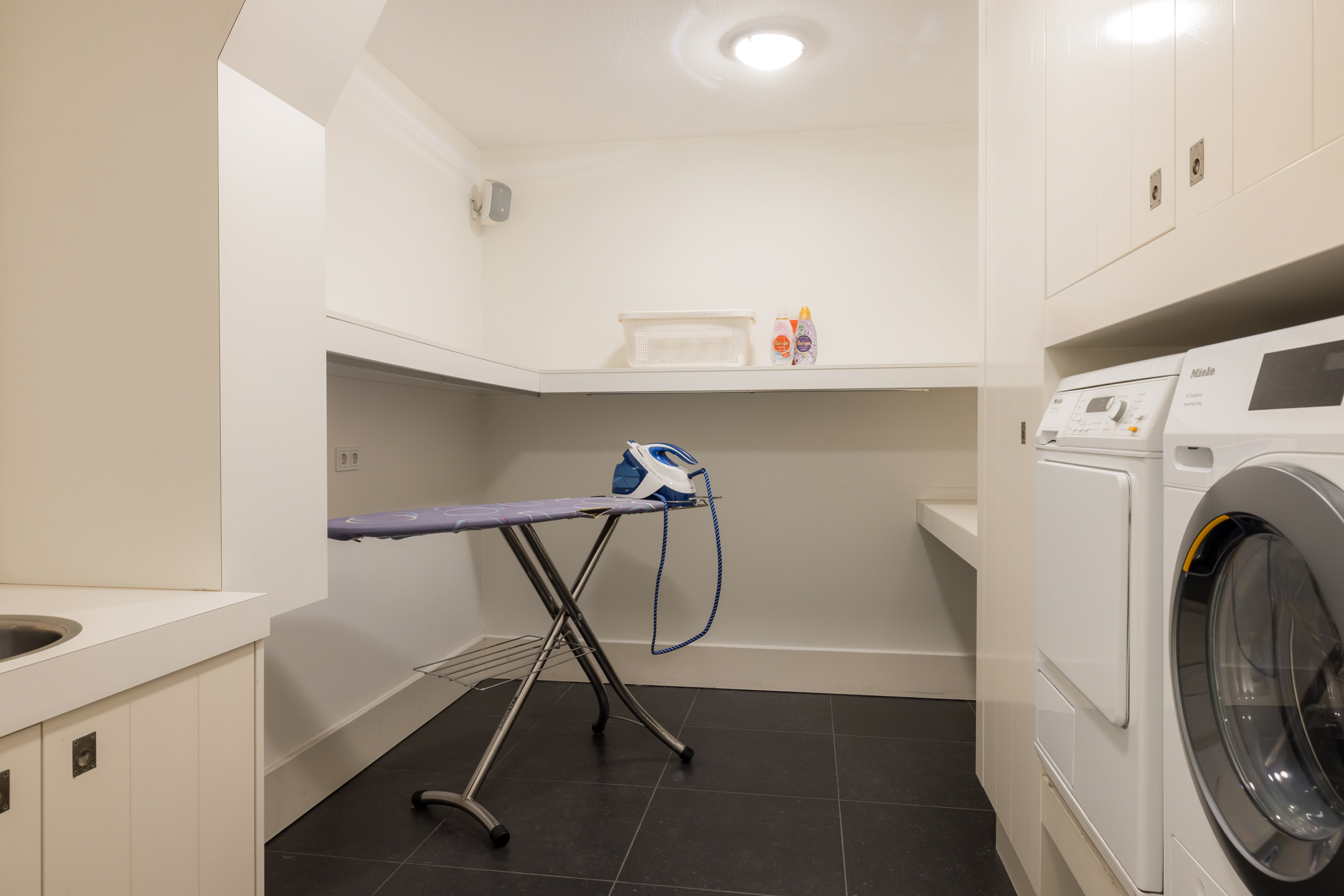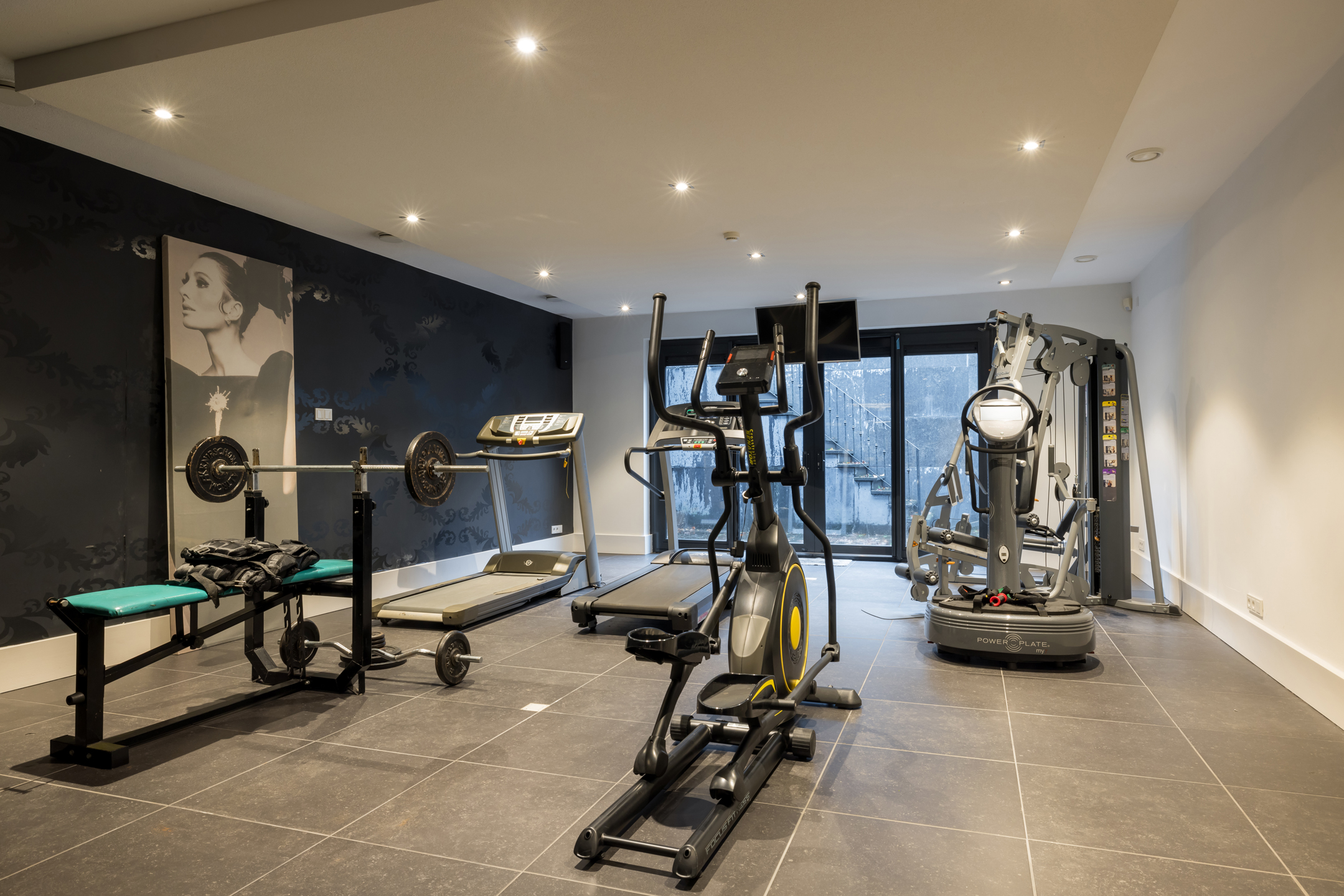 Wasruimte, technische ruimte, fitness en feestruimte met een buiten uitloop.