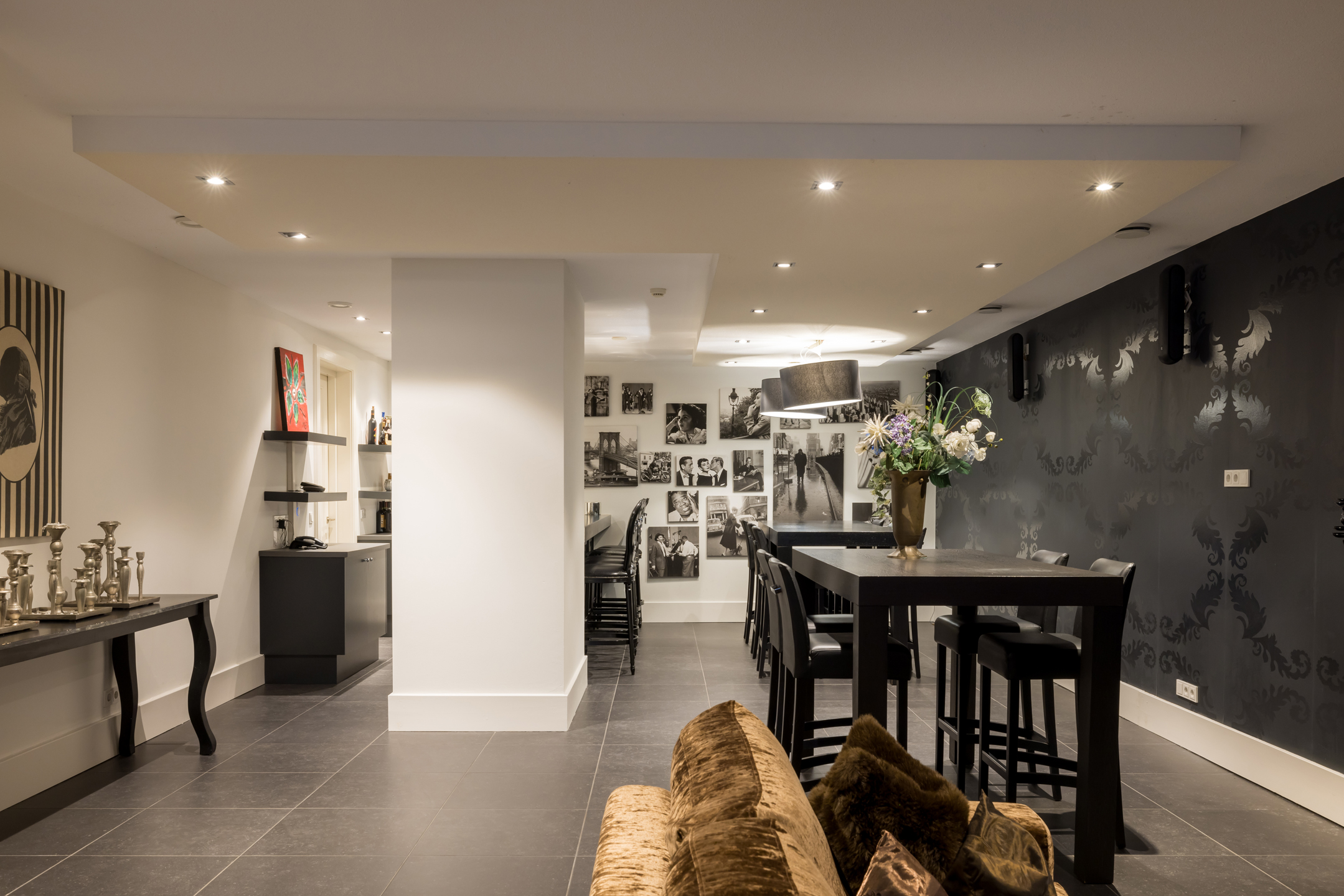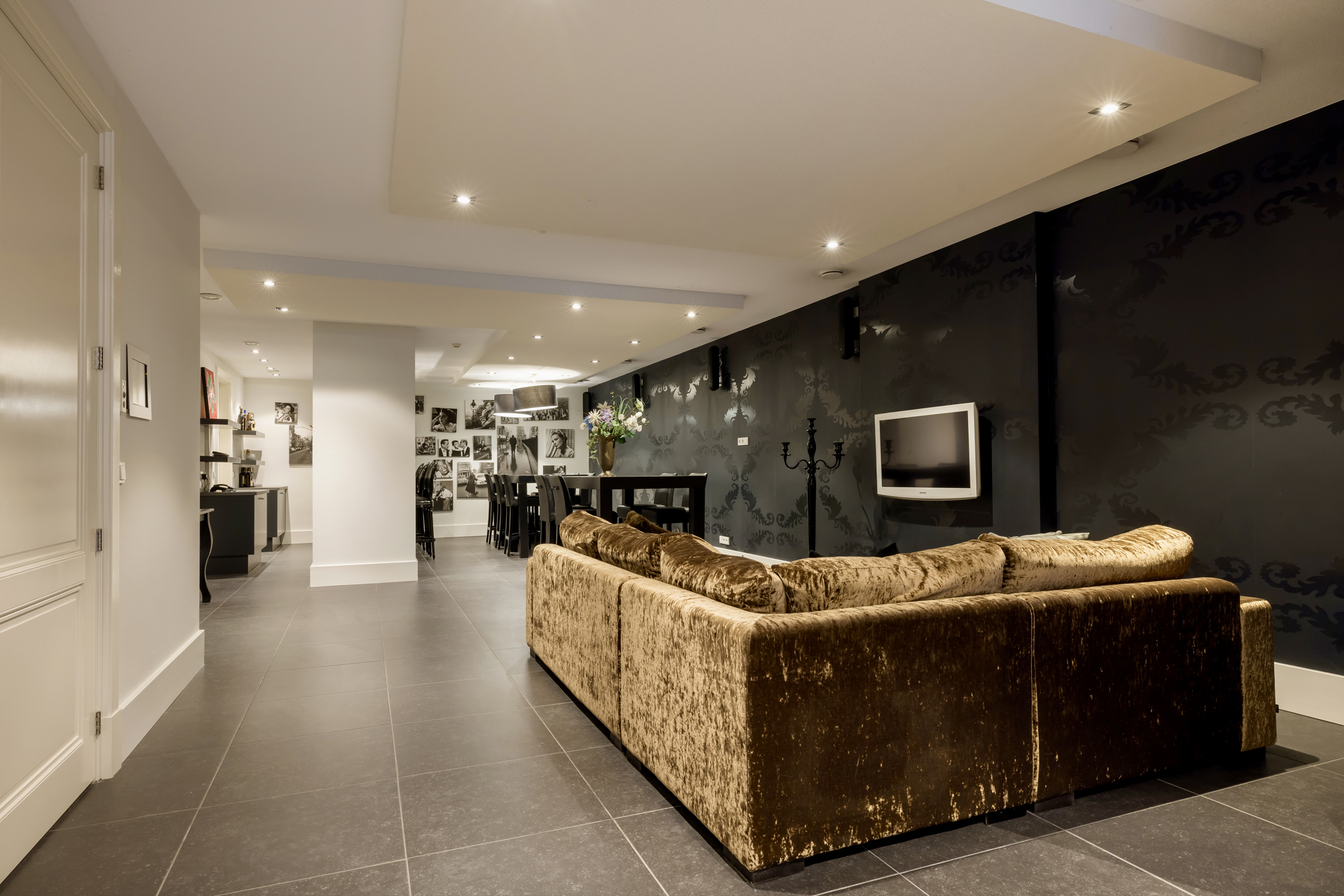 Dit niveau is net zoals de verdiepingsvloer bereikbaar met een vaste trap als de personen lift. Deze ruimte is ingericht met een wasruimte, 2x berging, badkamer met wastafel en douche en 2x toiletruimtes. De technische ruimtes zijn voorzien met de opstellingen van een aardwarmtepomp, WTW installaties, CV installatie, grote boiler, centraal stofzuiger systeem en dompelpomp. Dan is er nog een gezellige feestruimte met een bar, goederenlift en bijkeuken met horeca vaatwasser. De fitnessruimte en de feestruimte zitten naast elkaar en zijn d.m.v. een gordijn met elkaar te verbinden of te separeren. De fitnessruimte heeft openslaande deuren en een buitenruimte. Via een buitentrap kun je naar de sfeervolle tuin.